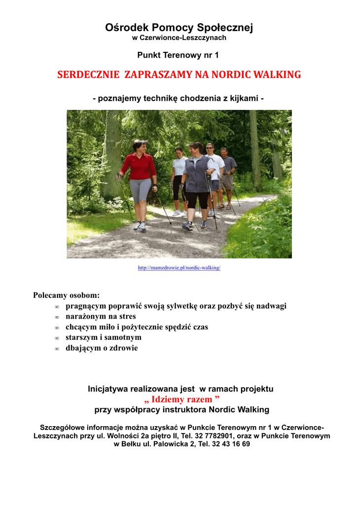 Ośrodek Pomocy Społecznej w Czerwionce-Leszczynach Punkt Terenowy nr 1 SERDECZNIE ZAPRASZAMY NA NORDIC WALKING - poznajemy technikę chodzenia z kijkami - http://mamzdrowie.pl/nordic-walking/ Polecamy osobom: • pragnącym poprawić swoją sylwetkę oraz pozbyć się nadwagi • narażonym na stres • chcącym miło i pożytecznie spędzić czas • starszym i samotnym • dbającym o zdrowie Inicjatywa realizowana jest w ramach projektu „ Idziemy razem ” przy współpracy instruktora Nordic Walking Szczegółowe informacje można uzyskać w Punkcie Terenowym nr 1 w CzerwionceLeszczynach przy ul. Wolności 2a piętro II, Tel. 32 7782901, oraz w Punkcie Terenowym w Bełku ul. Palowicka 2, Tel. 32 43 16 69