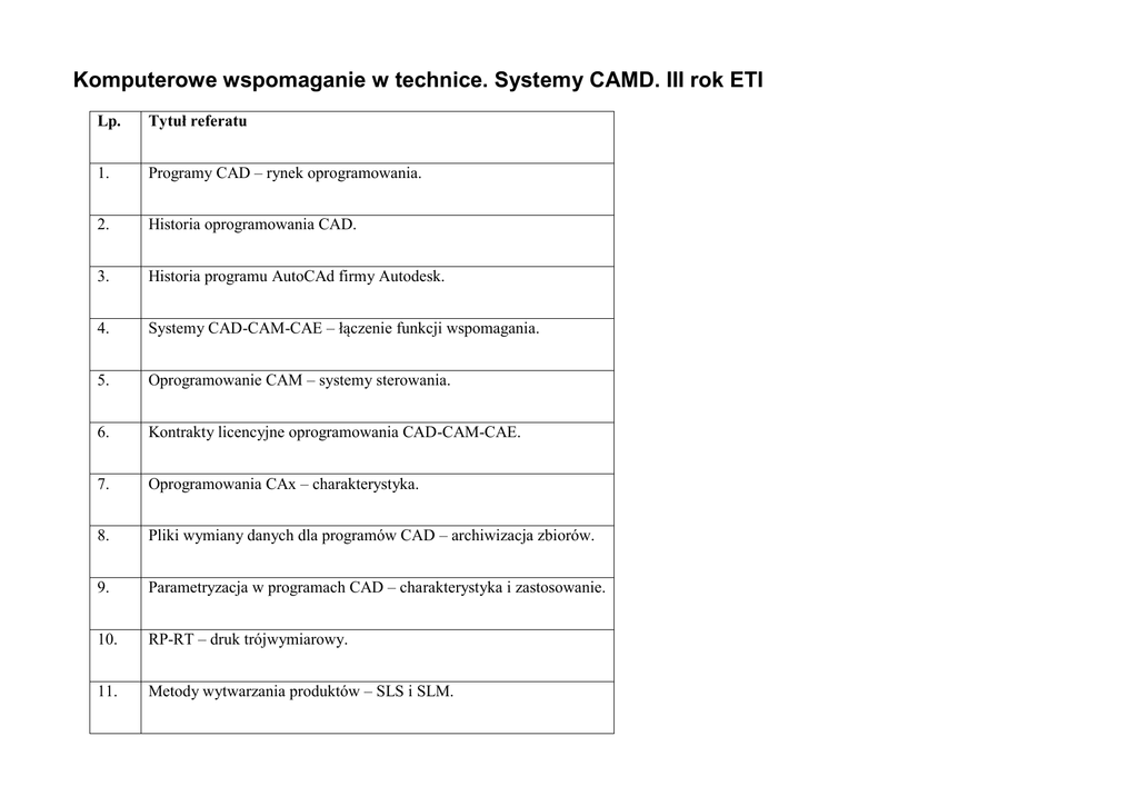 Komputerowe wspomaganie w technice. Systemy CAMD. III rok ETI Lp. Tytuł referatu 1. Programy CAD – rynek oprogramowania. 2. Historia oprogramowania CAD. 3. Historia programu AutoCAd firmy Autodesk. 4. Systemy CAD-CAM-CAE – łączenie funkcji wspomagania. 5. Oprogramowanie CAM – systemy sterowania. 6. Kontrakty licencyjne oprogramowania CAD-CAM-CAE. 7. Oprogramowania CAx – charakterystyka. 8. Pliki wymiany danych dla programów CAD – archiwizacja zbiorów. 9. Parametryzacja w programach CAD – charakterystyka i zastosowanie. 10. RP-RT – druk trójwymiarowy. 11. Metody wytwarzania produktów – SLS i SLM. 12. Reverse Engineering. 13. CE – CD /paradygmat 6E/ - projektowanie współbieżne charakterystyka. 14. Wpływ wykorzystania oprogramowania CAD na jakość i koszty wytwarzania. 15. Charakterystyka sprzętu komputerowego jako platformy dla programów CAD-CAM-CAE. 16. Kernele + interfejs użytkownika – rodzaje i charakterystyka. 17. Bazy graficzne i ich wykorzystanie w programach CAD - unifikacja. 18. Skanowanie – obraz rastrowy – wektoryzacja – zastosowanie. 19. Systemy pomiarowe – porównanie z modelami wirtualnymi. 20. Struktury oprogramowania CAMD. 21. Biura konstrukcyjne – wirtualne. 22. Formułowanie zadania projektowego. Rodzaje wymagań, źródła informacji. Metody wspomagające określenie wymagań. Badania użytkownika i procesu użytkowania. 23. Poszukiwanie rozwiązań zadania projektowego. Cele metod heurystycznych. Bariery twórczości. Metody i strategia koncypowania. 24. Bazy danych w projektowaniu. 25. Optymalizacja w projektowaniu. Cel i zakres procesu wyboru, zadania i sytuacji wyboru. System wartości i układ kryteriów. Oceny rozmyte i probabilistyczne. 26. Symulacja jako metoda konstruowania i weryfikacji. Obliczeniowe programy komputerowe. 27. Metody organizacji procesu projektowania. Synektyka. 28. Projektowanie równoczesne i zintegrowane.