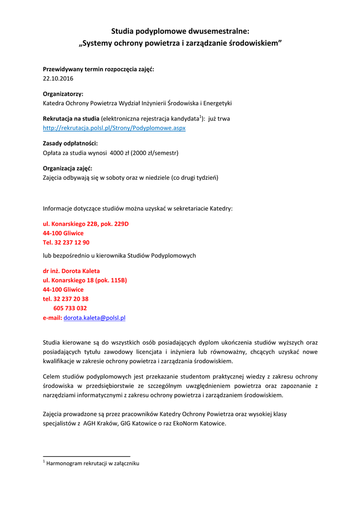 Studia podyplomowe dwusemestralne: „Systemy ochrony powietrza i zarządzanie środowiskiem” Przewidywany termin rozpoczęcia zajęć: 22.10.2016 Organizatorzy: Katedra Ochrony Powietrza Wydział Inżynierii Środowiska i Energetyki Rekrutacja na studia (elektroniczna rejestracja kandydata1): już trwa http://rekrutacja.polsl.pl/Strony/Podyplomowe.aspx Zasady odpłatności: Opłata za studia wynosi 4000 zł (2000 zł/semestr) Organizacja zajęć: Zajęcia odbywają się w soboty oraz w niedziele (co drugi tydzień) Informacje dotyczące studiów można uzyskać w sekretariacie Katedry: ul. Konarskiego 22B, pok. 229D 44-100 Gliwice Tel. 32 237 12 90 lub bezpośrednio u kierownika Studiów Podyplomowych dr inż. Dorota Kaleta ul. Konarskiego 18 (pok. 115B) 44-100 Gliwice tel. 32 237 20 38 605 733 032 e-mail: [email protected] Studia kierowane są do wszystkich osób posiadających dyplom ukończenia studiów wyższych oraz posiadających tytułu zawodowy licencjata i inżyniera lub równoważny, chcących uzyskać nowe kwalifikacje w zakresie ochrony powietrza i zarządzania środowiskiem. Celem studiów podyplomowych jest przekazanie studentom praktycznej wiedzy z zakresu ochrony środowiska w przedsiębiorstwie ze szczególnym uwzględnieniem powietrza oraz zapoznanie z narzędziami informatycznymi z zakresu ochrony powietrza i zarządzaniem środowiskiem. Zajęcia prowadzone są przez pracowników Katedry Ochrony Powietrza oraz wysokiej klasy specjalistów z AGH Kraków, GIG Katowice o raz EkoNorm Katowice. 1 Harmonogram rekrutacji w załączniku Program studiów Wykłady - Substancje zanieczyszczające powietrze, źródła i emisje - Pomiary i monitoring zanieczyszczeń powietrza - Oczyszczanie gazów odlotowych - Rozprzestrzenianie zanieczyszczeń w powietrzu atmosferycznym - Analiza danych środowiskowych i ocena błędów pomiarowych - SOZAT kompleksowy system zarządzania środowiskowego - Zarządzanie środowiskiem, optymalizacja kosztów ochrony powietrza - System geoinformatyczny GIS w zarządzaniu środowiskiem - Przepisy UE w ochronie środowiska - Ocena skutków zdrowotnych narażenia na zanieczyszczenia powietrza - Ocena oddziaływania na środowisko w zakresie ochrony powietrza Ćwiczenia - Analiza danych środowiskowych i ocena błędów pomiarowych - Rozprzestrzenianie zanieczyszczeń w powietrzu atmosferycznym - Substancje zanieczyszczające powietrze, źródła i emisje - Oczyszczanie gazów odlotowych - System geoinformatyczny GIS w zarządzaniu środowiskiem - Zarządzanie środowiskiem, optymalizacja kosztów ochrony powietrza - Ocena skutków zdrowotnych narażenia na zanieczyszczenia powietrza - Ocena oddziaływania na środowisko w zakresie ochrony powietrza Laboratoria - Pomiary i monitoring zanieczyszczeń powietrza - Rozprzestrzenianie zanieczyszczeń w powietrzu atmosferycznym - Analiza danych środowiskowych i ocena błędów pomiarowych - SOZAT kompleksowy system zarządzania środowiskowego - Komputerowe wspomaganie prac inżynierskich - wybrane zagadnienia Sumaryczna liczba godzin wynosi 216.
