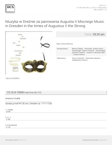 DUX S.J. Ul. Morskie Oko 2, 02-511 Warszawa +48 22 849 11 3 Muzyka w Dreźnie za panowania Augusta II Mocnego Music in Dresden in the times of Augustus II the Strong Cena: 29,30 pln Opis słownikowy Kompozytorzy Benna, Felippo ∎, Heinichen, Johann David ∎, Schreyfogel, Johann Friedrich ∎, Schreyfogel], [Johann Friedrich ∎, Veracini, Francesco Mari ∎, Vivaldi, Antonio ∎ Wykonawcy Firlus, Krzysztof ∎, Pastuszka, Martyna ∎, Świątkiewicz, Marcin ∎ Opis produktu CD DUX 0968Total time: [61:01] Antonio Vivaldi Sonata g-moll RV 26 (ms. Dresden ca. 1717-1724) 1. I Adagio [2:00] 2. II (...) [1:35] 3. III Sarabanda [1:15] Plik wygenerowano: 03-03-2017 Oprogramowanie sklepu: AptusShop DUX S.J. Ul. Morskie Oko 2, 02-511 Warszawa +48 22 849 11 3 4. IV Allegro [0:59] 5. V Giga [2:00] Johann Friedrich Schreyfogel Sonata I d-moll 6. I (...) [1:54] 7. II Allegro [0:49] 8. III Adagio [1:18] 9. IV (...) [2:10] Johann David Heinichen Sonata D-dur (ms. J.F. Schreyfogel) 10. I Largo [1:23] 11. II Allegro [2:28] 12. III Largo [1:11] 13. IV Affetuoso [1:50] [Johann Friedrich Schreyfogel] Plik wygenerowano: 03-03-2017 Oprogramowanie sklepu: AptusShop DUX S.J. Ul. Morskie Oko 2, 02-511 Warszawa +48 22 849 11 3 Sonata IV g-moll 14. I (…), Largo [2:50] 15. II Allemand [2:16] 16. III Giga [2:27] Johann Friedrich Schreyfogel Sonata III F-dur 17. I Largo [5:10] 18. II Allegro [3:01] Felippo Benna Sonata a violino solo f-moll 19. I Adagio assai [2:39] 20. II Andante [2:09] 21. III Allegro [1:17] Francesco Mari Veracini Sonata VII op. 1 A-dur 22. I Cantabile [2:22] Plik wygenerowano: 03-03-2017 Oprogramowanie sklepu: AptusShop DUX S.J. Ul. Morskie Oko 2, 02-511 Warszawa +48 22 849 11 3 23. II Larghetto [2:24] 24. III Allegro [3:14] 25. IV Largo [1:59] 26. V Allegro [2:19] Johann Friedrich Schreyfogel Sonata II D-dur 27. I Adagio [2:04] 28. II Allegro [2:10] 29. III Arpegato [1:47] Wykonawcy: Krzysztof Firlus /viola da gamba/ Marcin Świątkiewicz /klawesyn/ Martyna Pastuszka /skrzypce/ Plik wygenerowano: 03-03-2017 Powered by TCPDF (www.tcpdf.org) Oprogramowanie sklepu: AptusShop
