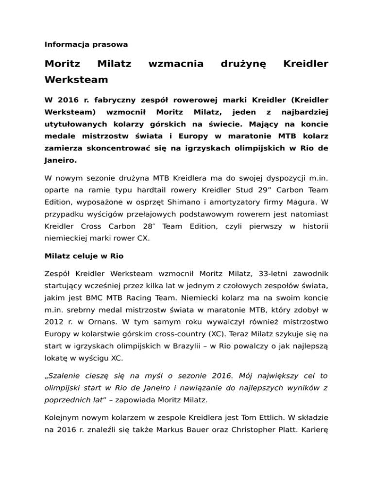 Informacja prasowa Moritz Milatz wzmacnia drużynę Kreidler Werksteam W 2016 r. fabryczny zespół rowerowej marki Kreidler (Kreidler Werksteam) wzmocnił Moritz Milatz, jeden z najbardziej utytułowanych kolarzy górskich na świecie. Mający na koncie medale mistrzostw świata i Europy w maratonie MTB kolarz zamierza skoncentrować się na igrzyskach olimpijskich w Rio de Janeiro. W nowym sezonie drużyna MTB Kreidlera ma do swojej dyspozycji m.in. oparte na ramie typu hardtail rowery Kreidler Stud 29” Carbon Team Edition, wyposażone w osprzęt Shimano i amortyzatory firmy Magura. W przypadku wyścigów przełajowych podstawowym rowerem jest natomiast Kreidler Cross Carbon 28″ Team Edition, czyli pierwszy w historii niemieckiej marki rower CX. Milatz celuje w Rio Zespół Kreidler Werksteam wzmocnił Moritz Milatz, 33-letni zawodnik startujący wcześniej przez kilka lat w jednym z czołowych zespołów świata, jakim jest BMC MTB Racing Team. Niemiecki kolarz ma na swoim koncie m.in. srebrny medal mistrzostw świata w maratonie MTB, który zdobył w 2012 r. w Ornans. W tym samym roku wywalczył również mistrzostwo Europy w kolarstwie górskim cross-country (XC). Teraz Milatz szykuje się na start w igrzyskach olimpijskich w Brazylii – w Rio powalczy o jak najlepszą lokatę w wyścigu XC. „Szalenie cieszę się na myśl o sezonie 2016. Mój największy cel to olimpijski start w Rio de Janeiro i nawiązanie do najlepszych wyników z poprzednich lat” – zapowiada Moritz Milatz. Kolejnym nowym kolarzem w zespole Kreidlera jest Tom Ettlich. W składzie na 2016 r. znaleźli się także Markus Bauer oraz Christopher Platt. Karierę zakończył z kolei Torsten Marx, który jednak nie żegna się z niemiecką marką i będzie pomagał przy projektowaniu nowych rowerów. W ramach przygotowań do najważniejszych w tym roku startów kolarze Kreidlera wzięli już udział w kilku wyścigach przełajowych. W styczniu Milatz zdobył w Albstadt 3. miejsce w zawodach Challenge Cyclo-cross, a Bauer zajął 5. miejsce w mistrzostwach Niemiec w kolarstwie przełajowym, które zorganizowano w miejscowości Vechta. W 2016 r. marka Kreidler będzie obecna również bezpośrednio w wyścigach organizowanych nad Wisłą, o co zadbała polska firma Taurus. Oficjalny dystrybutor marki Kreidler zdecydował się bowiem na stworzenie całkiem nowej drużyny – MTB Kreidler Taurus. Oficjalny dystrybutor marki Kreidler w Polsce: http://kreidler.pl/