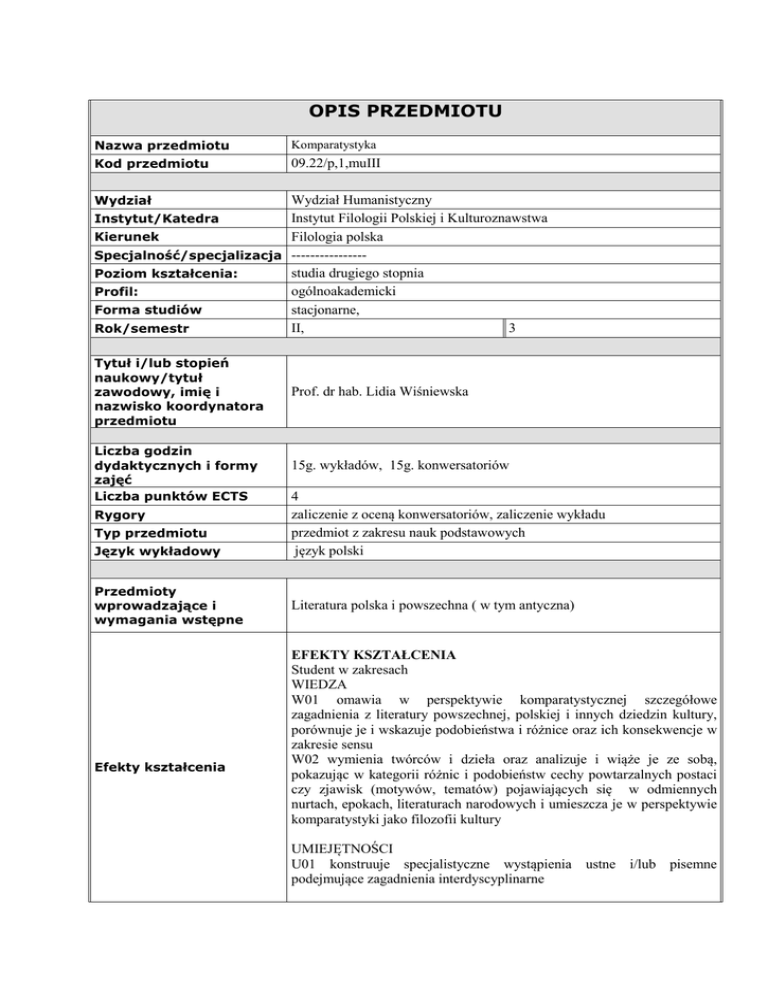 OPIS PRZEDMIOTU Nazwa przedmiotu Komparatystyka Kod przedmiotu 09.22/p,1,muIII Wydział Humanistyczny Instytut Filologii Polskiej i Kulturoznawstwa Instytut/Katedra Filologia polska Kierunek Specjalność/specjalizacja ---------------studia drugiego stopnia Poziom kształcenia: ogólnoakademicki Profil: stacjonarne, Forma studiów II, 3 Rok/semestr Wydział Tytuł i/lub stopień naukowy/tytuł zawodowy, imię i nazwisko koordynatora przedmiotu Liczba godzin dydaktycznych i formy zajęć Liczba punktów ECTS Rygory Typ przedmiotu Język wykładowy Przedmioty wprowadzające i wymagania wstępne Efekty kształcenia Prof. dr hab. Lidia Wiśniewska 15g. wykładów, 15g. konwersatoriów 4 zaliczenie z oceną konwersatoriów, zaliczenie wykładu przedmiot z zakresu nauk podstawowych język polski Literatura polska i powszechna ( w tym antyczna) EFEKTY KSZTAŁCENIA Student w zakresach WIEDZA W01 omawia w perspektywie komparatystycznej szczegółowe zagadnienia z literatury powszechnej, polskiej i innych dziedzin kultury, porównuje je i wskazuje podobieństwa i różnice oraz ich konsekwencje w zakresie sensu W02 wymienia twórców i dzieła oraz analizuje i wiąże je ze sobą, pokazując w kategorii różnic i podobieństw cechy powtarzalnych postaci czy zjawisk (motywów, tematów) pojawiających się w odmiennych nurtach, epokach, literaturach narodowych i umieszcza je w perspektywie komparatystyki jako filozofii kultury UMIEJĘTNOŚCI U01 konstruuje specjalistyczne wystąpienia ustne i/lub pisemne podejmujące zagadnienia interdyscyplinarne KOMPETENCJE SPOŁECZNE K01 dostrzega znaczenie i potrzebę rozumienia literatury i innych dziedzin kultury w perspektywie integrującej K02 dostrzega znaczenie dziedzictwa kulturowego .............10.09.2013.................................. data ............prof. Lidia Wiśniewska..................................................................................................... podpis prowadzącego przedmiot/ koordynatora przedmiotu* Tab. Opis sposobu sprawdzania efektów kształcenia dla przedmiotu z odniesieniem do form zajęć i sprawdzianów Efekty kształcenia a forma zajęć Efekty kształcenia dla ** kierunku Ocenianie efektów kształcenia Forma zajęć przedmiotu Sposoby oceniania*** Efekty kształcenia dla przedmiotu K_W10 W01 K prace domowe U01 K_W08 W02 W kolokwium U01,W01,W02 W WK projekt K01,K02 K_U13 K_K05, K_K05 U01 K01, K02 PROGRAM NAUCZANIA PRZEDMIOTU Rok akademicki: (2013/2014) Semestr: (zimowy/letni) Komparatystyka Wydział Humanistyczny Wydział Instytut Filologii Polskiej Instytut/Katedra Filologia polska/kulturoznawstwo. Kierunek Specjalność/specjalizacja ---------------wykład Opisywana forma zajęć Nazwa przedmiotu Liczba godzin dydaktycznych 15 Tytuł i/lub stopień naukowy/tytuł Prof. Lidia Wiśniewska zawodowy, imię i nazwisko prowadzącego daną formę zajęć Treści programowe realizowane podczas zajęć I Podstawowe zagadnienia komparatystyki II Motyw i temat: zagadnienia teoretyczne. Stoffgeschichte i imagologia. III. Motyw Don Juana 1. Źródła motywu: historia i literatura Don Juan hiszpański okresu baroku (Tirso de Molina, Zwodziciel z Sewilli i Kamienny gość), francuski XVII wieku (Molier, Don Juan czyli kamienny Gość), romantyczny w Anglii (Byron, Don Juan), romantyczny w Rosji (Puszkin, Kamienny gość), romantyczny w Polsce (Berwiński, Don Juan poznański. Poemat bez końca, romantyczny we Francji (Merimee, Czyśćowe dusze), romantyka duńskiego (Kierkegaard, Stadia erotyki bezpośredniej i Dziennik uwodziciela), początku XX w Polsce (Tadeusz Rittner, Don Juan. Dramat w trzech aktach, Bolesław Leśmian), egzystencjalistyczny – Peter Handke, Don Juan (sam o sobie opowiada), postmodernistyczny – Bart, Don Juan raz jeszcze. IV. Temat pokrewny: Casanova V. Don Kichot jako opozycja Don Juana VI. Połączenie motywu Don Juana i Don Kichota w Czekając na Godota Becketta VII. Motyw Kleopatry VIII. Motyw czarownicy Metody dydaktyczne Metody i kryteria oceniania Rygor Literatura podstawowa Wykład z elementami dyskusji Zaliczenie na podstawie obecności na wykładzie zaliczenie. 1. Don Juan w przemianach kultury, pod red. Lidii Wiśniewskiej, Bydgoszcz 2008 2. Lidia Wiśniewska, Współistnienie mitów i paradygmatów w świecie zewnętrznym [w:] eadem Między Bogiem a Naturą. Komparatystyka jako filozofia kultury. Bydgoszcz 2009; tamże: Komparatystyka jako filozofia kultury 1. Don Kichot i inni, pod red. Lidii Wiśniewskiej, Bydgoszcz 2012 2. Mity i motywy w perspektywie komparatystycznej. Komparatystyka między Mickiewiczem a dniem dzisiejszymIII, pod red. i ze wstępem Lidii Wiśniewskiej, Wyd. UKW, Bydgoszcz 2013 4. Teksty literackie omawiane na wykładzie 5. Tomasz Bilczewski, Komparatystyka i interpretacja. Nowoczesne badania porównawcze wobec translatologii, Kraków 2010 6. Andrzej Hejmej, Muzyka w literaturze. Perspektywy komparatystyki interdyscyplinarnej. Kraków 2008 Literatura uzupełniająca (w tym portale internetowe) .........10.09.2013................................ data 7. Teksty literackie omawiane na wykładzie 1. Emilia Ryczkowska, O uwodzeniu, czyli mit Don Juana dziś [w:] Przemiany mitów i wartości – nie tylko w literaturze, pod red. Lidii Wiśniewskiej i Mirosława Gołuńskiego, Bydgoszcz 2010 2. Ewa Chwałko, Motyw Don Kichota w wybranych współczesnych powieściach („Auto da fe” Eliasa Canettiego, „Ferdydurke” Witolda Gombrowicza, „Mała apokalipsa” Tadeusza Konwickiego, „Tańcowały dwa Michały” Edwarda Redlińskiego [w:] Acta Wratislaviensis nr 2239, Prace literackie XXXVIII, Wrocław 2000 ................prof. Lidia Wisniewska.......................................................................................... podpis prowadzącego daną formę zajęć .........10.09.2013............................................ data ........prof. Lidia Wisniewska........................................................................... podpis koordynatora