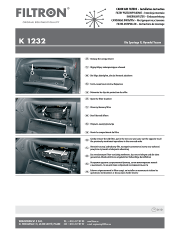 CABIN AIR FILTERS – Installation instruction FILTRY PRZECIWPYŁKOWE – Instrukcja montażu INNERAUMFILTER – Einbauanleitung САЛОННЫЕ ФИЛЬТРЫ – Инструкция по установке FILTRE ANTIPOLLEN – Instructions de montage K 1232 Kia Sportage II, Hyundai Tucson Unclasp the compartment Wypiąć klipsy zabezpieczające schowek Die Klips abknöpfen, die das Versteck absichern Снять защитные клипсы бардачка Démonter les clips de protection du coffre Open the filter chamber Otworzyć komorę filtra Den Filterteil öffnen Открыть камеру фильтра Ouvrir le compartiment du filtre Gently remove the old filter, put in the new one and carry out the opposite to all the previously mentioned operations in the reversed order Ostrożnie usunąć zabrudzony filtr, następnie zamontować nowy oraz wykonać powyższe czynności w kolejności odwrotnej Das verschmutzte Filter vorsichtig entfernen, das neue einlegen und die oben genannten Arbeitsschritte in umgekehrter Reihenfolge durchführen Осторожно удалить загрязненный фильтр, затем вмонтировать новый и выполнить те же действия в обратной последовательности Enlever soigneusement le filtre usagé, en installer un nouveau et réaliser les opérations mentionnées ci-dessus dans l’ordre inverse 0:10 WIX-FILTRON SP. Z O.O. TEL.:+48 65 572 89 00 www.filtron.eu UL. WROCŁAWSKA 145, 63-800 GOSTYŃ, POLAND FAX: +48 65 572 89 22 e-mail: [email protected]