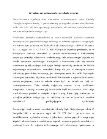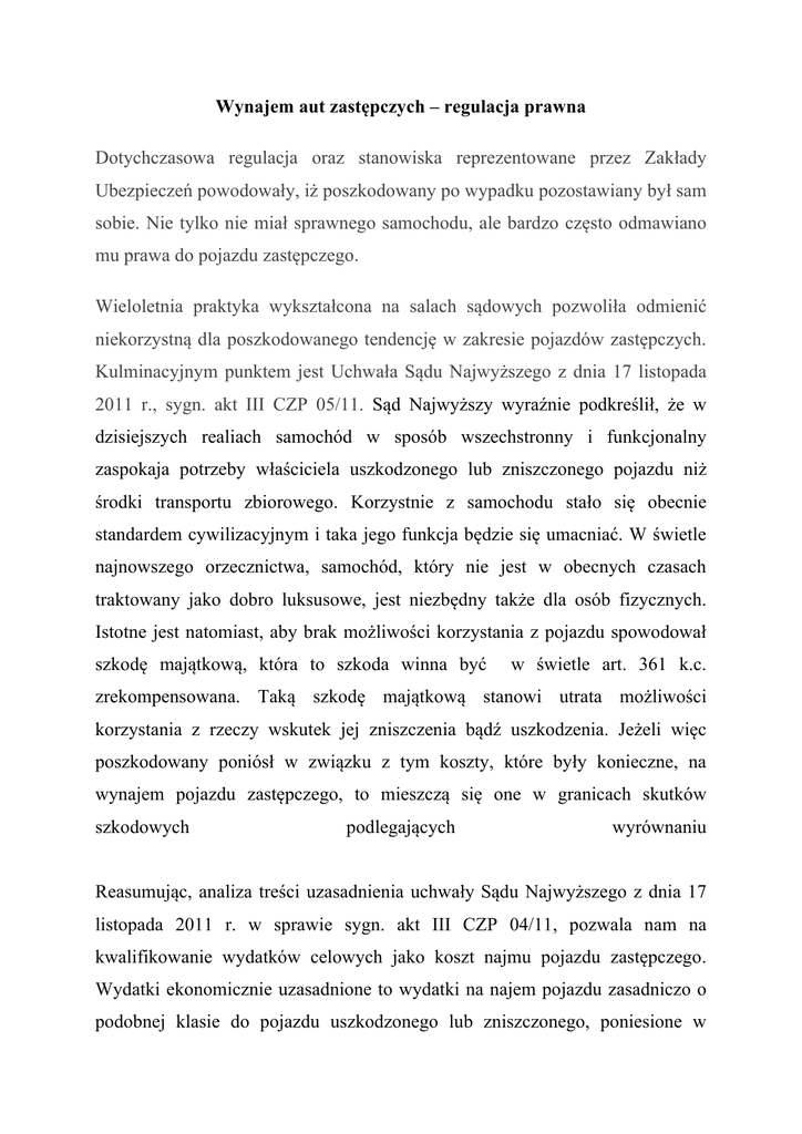 Wynajem aut zastępczych – regulacja prawna Dotychczasowa regulacja oraz stanowiska reprezentowane przez Zakłady Ubezpieczeń powodowały, iż poszkodowany po wypadku pozostawiany był sam sobie. Nie tylko nie miał sprawnego samochodu, ale bardzo często odmawiano mu prawa do pojazdu zastępczego. Wieloletnia praktyka wykształcona na salach sądowych pozwoliła odmienić niekorzystną dla poszkodowanego tendencję w zakresie pojazdów zastępczych. Kulminacyjnym punktem jest Uchwała Sądu Najwyższego z dnia 17 listopada 2011 r., sygn. akt III CZP 05/11. Sąd Najwyższy wyraźnie podkreślił, że w dzisiejszych realiach samochód w sposób wszechstronny i funkcjonalny zaspokaja potrzeby właściciela uszkodzonego lub zniszczonego pojazdu niż środki transportu zbiorowego. Korzystnie z samochodu stało się obecnie standardem cywilizacyjnym i taka jego funkcja będzie się umacniać. W świetle najnowszego orzecznictwa, samochód, który nie jest w obecnych czasach traktowany jako dobro luksusowe, jest niezbędny także dla osób fizycznych. Istotne jest natomiast, aby brak możliwości korzystania z pojazdu spowodował szkodę majątkową, która to szkoda winna być w świetle art. 361 k.c. zrekompensowana. Taką szkodę majątkową stanowi utrata możliwości korzystania z rzeczy wskutek jej zniszczenia bądź uszkodzenia. Jeżeli więc poszkodowany poniósł w związku z tym koszty, które były konieczne, na wynajem pojazdu zastępczego, to mieszczą się one w granicach skutków szkodowych podlegających wyrównaniu Reasumując, analiza treści uzasadnienia uchwały Sądu Najwyższego z dnia 17 listopada 2011 r. w sprawie sygn. akt III CZP 04/11, pozwala nam na kwalifikowanie wydatków celowych jako koszt najmu pojazdu zastępczego. Wydatki ekonomicznie uzasadnione to wydatki na najem pojazdu zasadniczo o podobnej klasie do pojazdu uszkodzonego lub zniszczonego, poniesione w oparciu o stawki czynszu najmu, które obowiązują na danym rynku lokalnym i w czasie naprawy pojazdu mechanicznego lub do czasu nabycia nowego pojazdu.