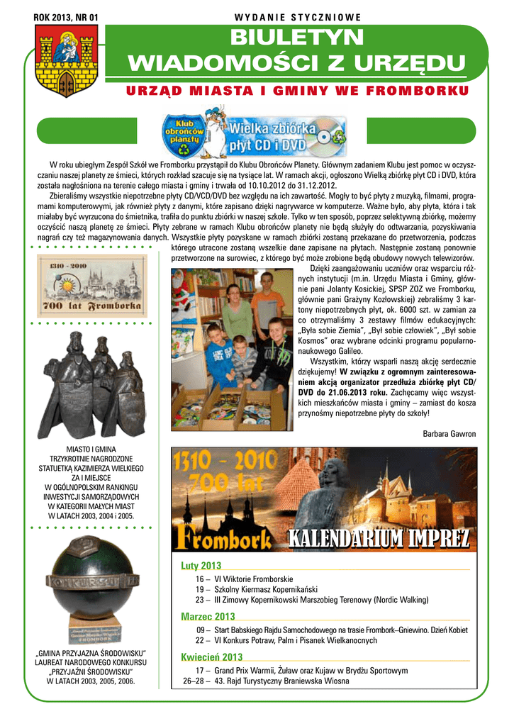 ROK 2013, NR 01 WYDANIE STYCZNIOWE BIULETYN WIADOMOŚCI Z URZĘDU URZĄD MIASTA I GMINY WE FROMBORKU W roku ubiegłym Zespół Szkół we Fromborku przystąpił do Klubu Obrońców Planety. Głównym zadaniem Klubu jest pomoc w oczyszczaniu naszej planety ze śmieci, których rozkład szacuje się na tysiące lat. W ramach akcji, ogłoszono Wielką zbiórkę płyt CD i DVD, która została nagłośniona na terenie całego miasta i gminy i trwała od 10.10.2012 do 31.12.2012. Zbieraliśmy wszystkie niepotrzebne płyty CD/VCD/DVD bez względu na ich zawartość. Mogły to być płyty z muzyką, filmami, programami komputerowymi, jak również płyty z danymi, które zapisano dzięki nagrywarce w komputerze. Ważne było, aby płyta, która i tak miałaby być wyrzucona do śmietnika, trafiła do punktu zbiórki w naszej szkole. Tylko w ten sposób, poprzez selektywną zbiórkę, możemy oczyścić naszą planetę ze śmieci. Płyty zebrane w ramach Klubu obrońców planety nie będą służyły do odtwarzania, pozyskiwania nagrań czy też magazynowania danych. Wszystkie płyty pozyskane w ramach zbiórki zostaną przekazane do przetworzenia, podczas którego utracone zostaną wszelkie dane zapisane na płytach. Następnie zostaną ponownie przetworzone na surowiec, z którego być może zrobione będą obudowy nowych telewizorów. Dzięki zaangażowaniu uczniów oraz wsparciu różnych instytucji (m.in. Urzędu Miasta i Gminy, głównie pani Jolanty Kosickiej, SPSP ZOZ we Fromborku, głównie pani Grażyny Kozłowskiej) zebraliśmy 3 kartony niepotrzebnych płyt, ok. 6000 szt. w zamian za co otrzymaliśmy 3 zestawy filmów edukacyjnych: „Była sobie Ziemia”, „Był sobie człowiek”, „Był sobie Kosmos” oraz wybrane odcinki programu popularnonaukowego Galileo. Wszystkim, którzy wsparli naszą akcję serdecznie dziękujemy! W związku z ogromnym zainteresowaniem akcją organizator przedłuża zbiórkę płyt CD/ DVD do 21.06.2013 roku. Zachęcamy więc wszystkich mieszkańców miasta i gminy – zamiast do kosza przynośmy niepotrzebne płyty do szkoły! Barbara Gawron MIASTO I GMINA TRZYKROTNIE NAGRODZONE STATUETKĄ KAZIMIERZA WIELKIEGO ZA I MIEJSCE W OGÓLNOPOLSKIM RANKINGU INWESTYCJI SAMORZĄDOWYCH W KATEGORII MAŁYCH MIAST W LATACH 2003, 2004 i 2005. KALENDARIUM IMPREZ Luty 2013 16 – VI Wiktorie Fromborskie 19 – Szkolny Kiermasz Kopernikański 23 – III Zimowy Kopernikowski Marszobieg Terenowy (Nordic Walking) Marzec 2013 „GMINA PRZYJAZNA ŚRODOWISKU” LAUREAT NARODOWEGO KONKURSU „PRZYJAŹNI ŚRODOWISKU” W LATACH 2003, 2005, 2006. 09 – Start Babskiego Rajdu Samochodowego na trasie Frombork–Gniewino. Dzień Kobiet 22 – VI Konkurs Potraw, Palm i Pisanek Wielkanocnych Kwiecień 2013 17 – Grand Prix Warmii, Żuław oraz Kujaw w Brydżu Sportowym 26–28 – 43. Rajd Turystyczny Braniewska Wiosna FROMBORSKA WIGILIA NA RYNKU W piątek 21 grudnia w centrum naszego miasteczka na Rynku odbyła się już po raz dziesiąty WIGILIA MIEJSKA, pełna radosnego poczucia wspólnoty wszystkich mieszkańców miasta i gminy Frombork, zorganizowana w ramach projektu „Wigilijne tradycje i obyczaje naszym dziedzictwem”. Burmistrz Krystyna Lewańska wraz z Przewodniczącym Rady Miejskiej Gminy Frombork Krzysztofem Hołubowskim i ks. Prałatem Jackiem Wojtkowskim złożyli życzenia świąteczne licznie przybyłym mieszkańcom miasta i gminy Frombork. W miłej przedświątecznej atmosferze uczestnicy Wigilii składali sobie życzenia, łamiąc się opłatkiem. Dużą atrakcją tegorocznej Wigilii, jak co roku, był żywy żłóbek ze zwierzętami ze Stadniny Koni Narusa, która przykuwała uwagę uczestników wieczoru wigilijnego. św. Mikołaj rozdający upominki. W menu wigilijnym znalazły się zupa grzybowa, barszcz czerwony, kapusta z grzybami oraz wspaniałe pierogi z kapustą i grzybami. W programie artystycznym zaprezentowały się dzieci przedszkolne z Przedszkola „Gwiazdkowe Wzgórze” i dzieci z Powiatowego Domu Dziecka „Słoneczne Wzgórze. Były kolędy, pastorałki i piosenki świąteczne. Dużym powodzeniem i zainteresowaniem cieszyły się liczne kiermasze świąteczne, na których można było kupić ręcznie wykonane stroiki, pamiątki i ozdoby świąteczne. Na zakończenie Grupa Ogniowa na razie z Zespołu Szkół zaprezentowała interesujący pokaz taneczny z ogniem. 2 Organizatorzy: Urząd Miasta i Gminy • Miejsko-Gminny Ośrodek Kultury • Miejsko-Gminny Ośrodek Pomocy Społecznej • Przedszkole „Gwiazdkowe Wzgórze” • Środowiskowy Dom Samopomocy CARITAS • Warsztaty Terapii Zajęciowej CARITAS • Stadnina Koni Narusa • Zespół Szkół Jolanta Kosicka FROMBORK ZAGRAŁ Z POMPĄ W XXI FINALE WIELKIEJ ORKIESTRY ŚWIĄTECZNEJ POMOCY! Już siódmy rok z rzędu bieg główny startował w stolicy w dniu Finału Wielkiej Orkiestry Świątecznej Pomocy, we Fromborku wystartował po raz piąty. Jego celem jest wspomaganie WOŚP oraz propagowanie zdrowego i aktywnego stylu życia. Zysk z imprezy został przekazany do sztabu WOŚP. Wszyscy uczestnicy otrzymali pamiątkowe medale, zostały rozlosowane również koszulki z warszawskiego biegu oraz inne nagrody rzeczowe. Po biegu na uczestników czekał gorący żurek, który został ufundowany przez Formację Zdrowych Serc, a ugotowała Elżbieta Agrejcowicz – członek OSP. Główna część lokalnego finału WOŚP odbył się w Restauracji „Pod Wzgórzem”, prowadzony przez Krystynę Sieniawską, szefa fromborskiego Sztabu WOŚP. Dzieło Orkiestry wspierano nie tylko wrzucając pieniądze do puszek wolontariuszy, prowadzących zbiórkę na terenie miasta i gminy Frombork. Można było także wziąć udział w licznych licytacjach różnych przedmiotów ofiarowanych WOŚP przez mieszkańców. W restauracji prowadzono jednocześnie kilka akcji pomagających w zbiórce pieniędzy. Dzieci z Powiatowego Domu Dziecka „Słoneczne Wzgórze” zorganizowały loterię fantową, a także kawiarenkę
