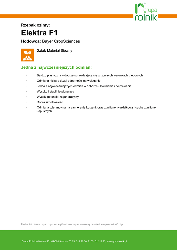 Rzepak ozimy: Elektra F1 Hodowca: Bayer CropSciences Dział: Materiał Siewny Jedna z najwcześniejszych odmian: • Bardzo plastyczna – dobrze sprawdzająca się w gorszych warunkach glebowych • Odmiana niska o dużej odporności na wyleganie • Jedna z najwcześniejszych odmian w doborze - kwitnienie i dojrzewanie • Wysoko i stabilnie plonująca • Wysoki potencjał regeneracyjny • Dobra zimotrwałość • Odmiana tolerancyjna na zamieranie korzeni, oraz zgniliznę twardzikową i suchą zgniliznę kapustnych Źródło: http://www.bayercropscience.pl/nasiona-rzepaku-nowe-wyzwanie-dla-w-polsce-1160.php Grupa Rolnik – Nacław 25, 64-000 Kościan, T: 65 511 70 30, F: 65 512 19 93, www.gruparolnik.pl