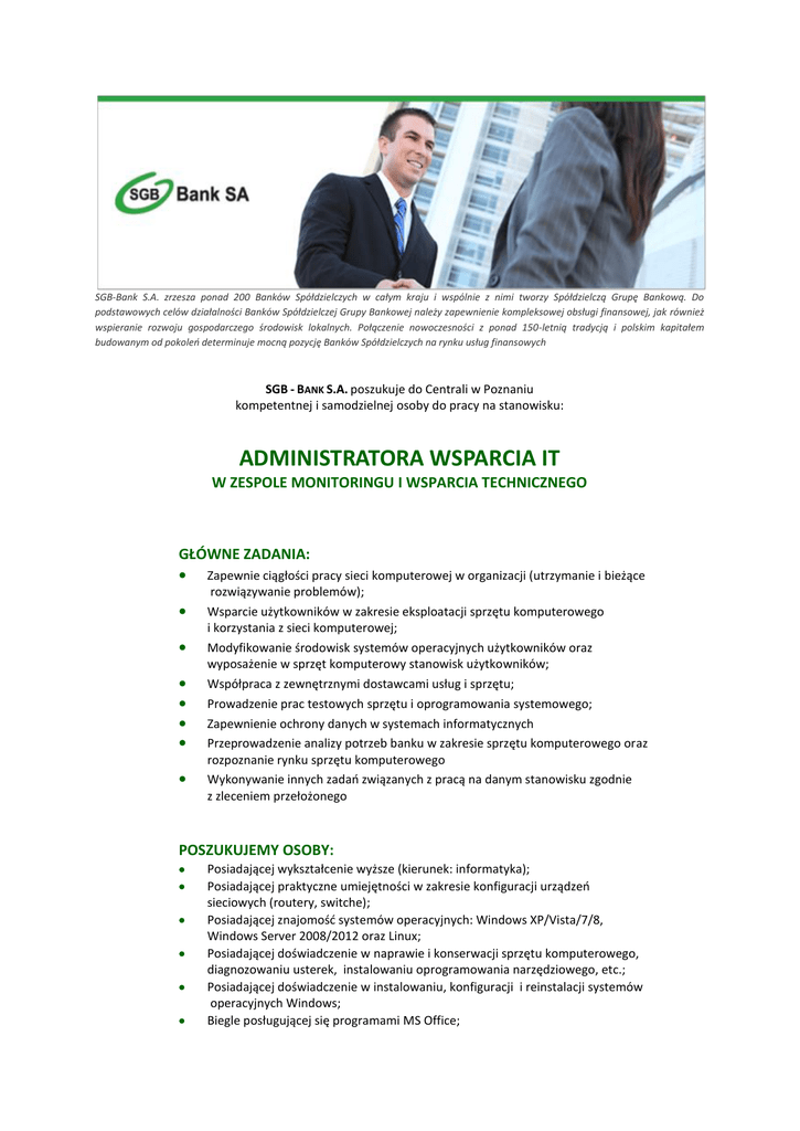 SGB-Bank S.A. zrzesza ponad 200 Banków Spółdzielczych w całym kraju i wspólnie z nimi tworzy Spółdzielczą Grupę Bankową. Do podstawowych celów działalności Banków Spółdzielczej Grupy Bankowej należy zapewnienie kompleksowej obsługi finansowej, jak również wspieranie rozwoju gospodarczego środowisk lokalnych. Połączenie nowoczesności z ponad 150-letnią tradycją i polskim kapitałem budowanym od pokoleń determinuje mocną pozycję Banków Spółdzielczych na rynku usług finansowych SGB - BANK S.A. poszukuje do Centrali w Poznaniu kompetentnej i samodzielnej osoby do pracy na stanowisku: ADMINISTRATORA WSPARCIA IT W ZESPOLE MONITORINGU I WSPARCIA TECHNICZNEGO GŁÓWNE ZADANIA: Zapewnie ciągłości pracy sieci komputerowej w organizacji (utrzymanie i bieżące rozwiązywanie problemów); Wsparcie użytkowników w zakresie eksploatacji sprzętu komputerowego i korzystania z sieci komputerowej; Modyfikowanie środowisk systemów operacyjnych użytkowników oraz wyposażenie w sprzęt komputerowy stanowisk użytkowników; Współpraca z zewnętrznymi dostawcami usług i sprzętu; Prowadzenie prac testowych sprzętu i oprogramowania systemowego; Zapewnienie ochrony danych w systemach informatycznych Przeprowadzenie analizy potrzeb banku w zakresie sprzętu komputerowego oraz rozpoznanie rynku sprzętu komputerowego Wykonywanie innych zadań związanych z pracą na danym stanowisku zgodnie z zleceniem przełożonego POSZUKUJEMY OSOBY: Posiadającej wykształcenie wyższe (kierunek: informatyka); Posiadającej praktyczne umiejętności w zakresie konfiguracji urządzeń sieciowych (routery, switche); Posiadającej znajomość systemów operacyjnych: Windows XP/Vista/7/8, Windows Server 2008/2012 oraz Linux; Posiadającej doświadczenie w naprawie i konserwacji sprzętu komputerowego, diagnozowaniu usterek, instalowaniu oprogramowania narzędziowego, etc.; Posiadającej doświadczenie w instalowaniu, konfiguracji i reinstalacji systemów operacyjnych Windows; Biegle posługującej się programami MS Office; Dobrze zorganizowanej, rzetelnej, zorientowanej na realizację zadań; Posiadającej czynne prawo jazdy kat. B; Mile widziana znajomość języka angielskiego w stopniu umożliwiającym swobodną komunikację. OFERUJEMY: Interesującą, pełną wyzwań, samodzielną pracę w renomowanej firmie; Stabilne warunki zatrudnienia i wynagrodzenia w ramach stałej umowy o pracę Możliwość zdobycia nowych doświadczeń zawodowych i rozwoju kwalifikacji oraz dostęp do nowoczesnych rozwiązań informatycznych Praca według harmonogramu czasu pracy; Pakiet socjalny (opieka medyczna, program emerytalny, karta FitProfit, ubezpieczenie). Osoby zainteresowane zapraszamy do wzięcia udziału w rekrutacji i przesłanie swoich dokumentów (szczegółowe zawodowe CV + list motywacyjny) na adres: [email protected]. W tytule wiadomości prosimy wpisać ‘Administrator Wsparcia IT’. Dziękujemy za wszystkie zgłoszenia. Jednocześnie informujemy, że odpowiemy jedynie na wybrane oferty. W zgłoszeniach prosimy o zawarcie następującej klauzuli: Wyrażam zgodę na przetwarzanie moich danych osobowych dla potrzeb niezbędnych do realizacji procesu rekrutacji (zgodnie z ustawą o ochronie danych osobowych z dn. 29.08.97 Dz. U. 2015 poz. 2135).