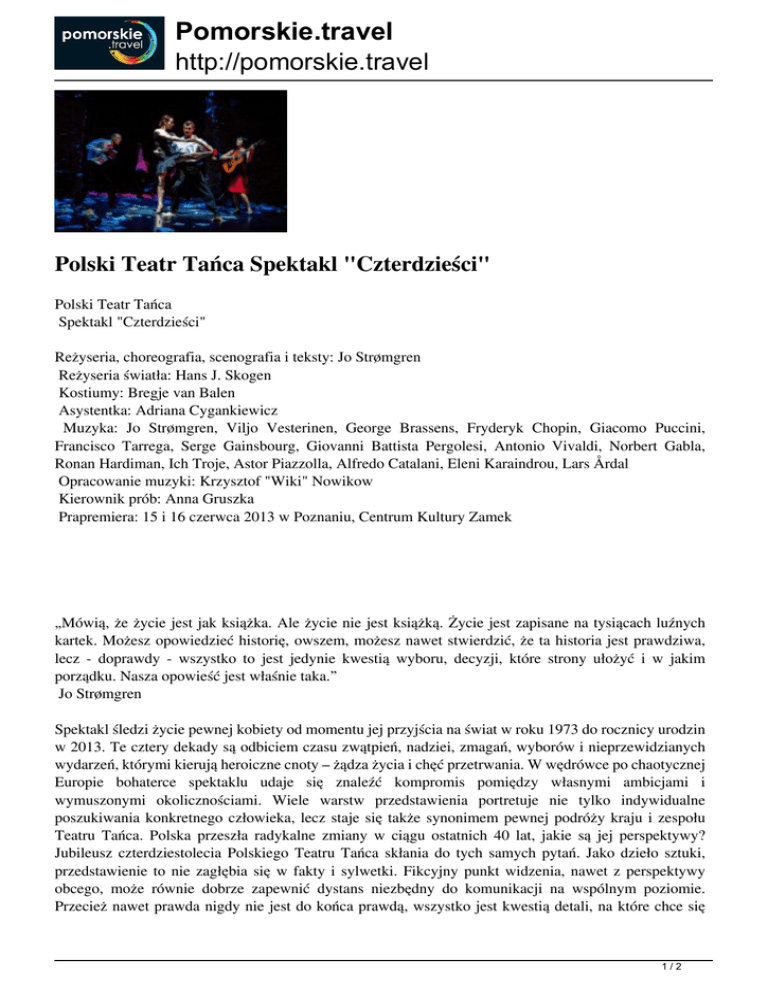 Pomorskie.travel http://pomorskie.travel Polski Teatr Tańca Spektakl "Czterdzieści" Polski Teatr Tańca Spektakl "Czterdzieści" Reżyseria, choreografia, scenografia i teksty: Jo Strømgren Reżyseria światła: Hans J. Skogen Kostiumy: Bregje van Balen Asystentka: Adriana Cygankiewicz Muzyka: Jo Strømgren, Viljo Vesterinen, George Brassens, Fryderyk Chopin, Giacomo Puccini, Francisco Tarrega, Serge Gainsbourg, Giovanni Battista Pergolesi, Antonio Vivaldi, Norbert Gabla, Ronan Hardiman, Ich Troje, Astor Piazzolla, Alfredo Catalani, Eleni Karaindrou, Lars Årdal Opracowanie muzyki: Krzysztof "Wiki" Nowikow Kierownik prób: Anna Gruszka Prapremiera: 15 i 16 czerwca 2013 w Poznaniu, Centrum Kultury Zamek „Mówią, że życie jest jak książka. Ale życie nie jest książką. Życie jest zapisane na tysiącach luźnych kartek. Możesz opowiedzieć historię, owszem, możesz nawet stwierdzić, że ta historia jest prawdziwa, lecz - doprawdy - wszystko to jest jedynie kwestią wyboru, decyzji, które strony ułożyć i w jakim porządku. Nasza opowieść jest właśnie taka.” Jo Strømgren Spektakl śledzi życie pewnej kobiety od momentu jej przyjścia na świat w roku 1973 do rocznicy urodzin w 2013. Te cztery dekady są odbiciem czasu zwątpień, nadziei, zmagań, wyborów i nieprzewidzianych wydarzeń, którymi kierują heroiczne cnoty – żądza życia i chęć przetrwania. W wędrówce po chaotycznej Europie bohaterce spektaklu udaje się znaleźć kompromis pomiędzy własnymi ambicjami i wymuszonymi okolicznościami. Wiele warstw przedstawienia portretuje nie tylko indywidualne poszukiwania konkretnego człowieka, lecz staje się także synonimem pewnej podróży kraju i zespołu Teatru Tańca. Polska przeszła radykalne zmiany w ciągu ostatnich 40 lat, jakie są jej perspektywy? Jubileusz czterdziestolecia Polskiego Teatru Tańca skłania do tych samych pytań. Jako dzieło sztuki, przedstawienie to nie zagłębia się w fakty i sylwetki. Fikcyjny punkt widzenia, nawet z perspektywy obcego, może równie dobrze zapewnić dystans niezbędny do komunikacji na wspólnym poziomie. Przecież nawet prawda nigdy nie jest do końca prawdą, wszystko jest kwestią detali, na które chce się 1/2 Pomorskie.travel http://pomorskie.travel położyć nacisk, zignorować je lub wyolbrzymić. Jo Strømgren Jo Strømgren, urodził się w 1970 roku w norweskim Trondheim, gdzie uczył się baletu klasycznego oraz pracował przez kilka lat jako tancerz tańca współczesnego, zanim kontuzja zmusiła go do poszukiwań bardziej multi dyscyplinarnej kariery twórczej. Jako niezrzeszony choreograf często jest angażowany przez zespoły baletowe, wśród nich: Wiener Staatsopernballet, The Royal Danish Ballet, Staatsoper Nürnberg Ballet, Gothenburg Ballet, Ballet de l'Opera National du Rhin, Royal Swedish Ballet i inne. Obecnie jest związany z Narodowym Baletem Norweskim. Jo stworzył wiele przedstawień tańca współczesnego dla takich zespołów, jak: Cedar Lake Dance Company, Danish Dance Theatre, Carte Blanche Dance Company, Cloud Gate Ensemble, Scottish Dance Theatre, Helsinki Dance Company, Repertory Dance Theatre Utah, Iceland Dance Company, Bern Ballet, Staatsheater am Gärtnerplatz München, czy Staatstheater Braunschweig. Jako reżyser teatralny specjalną miłością darzy dramaty Henrika Ibsena i głównie pracuje w teatrach skandynawskich: The Norwegian National Theatre, The Royal Danish Theatre, Reykjavik City Theatre, The National Theatre of Bergen, Malmö City Theatre. Na scenie międzynarodowej współpracował m.in. z Philadelphia Live Arts i Teatrem Puszkina w Moskwie. Jako dramaturg stworzył ok. 15 sztuk, wystawianych na scenach wielu teatrów. Jest także chwilowo zaangażowany w reżyserię filmową. Jego pierwszy film fabularny, pt. „Destination Moskow” powstał w 2003 r. Natomiast jego film taneczny „The Neighbour” w 2010 r. wygrał prestiżową Rose d’Or w Lausanne. Aktywność Jo Strømgrena na arenie międzynarodowej jest ogromna – w 2013 roku 20 różnych produkcji jego autorstwa było wykonywanych na całym świecie. "Wsparcie udzielone przez Islandię, Liechtenstein oraz Norwegię." http://www.znakiczasu.eu Start: 2015-03-11 19:00 Miejsce: Sala główna Filharmonii Kaszubskiej w Wejherowie Bilety: 20 zł normalne, 15 zł ulgowy PCIT 2/2 Powered by TCPDF (www.tcpdf.org)