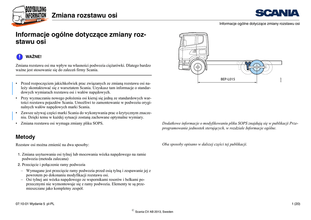 Zmiana rozstawu osi Informacje ogólne dotyczące zmiany rozstawu osi Informacje ogólne dotyczące zmiany rozstawu osi WAŻNE! • Przed rozpoczęciem jakichkolwiek prac związanych ze zmianą rozstawu osi należy skontaktować się z warsztatem Scania. Uzyskasz tam informacje o standardowych wymiarach rozstawu osi i wałów napędowych. • Przy wyznaczaniu nowego położenia osi kieruj się jedną ze standardowych wartości rozstawu pojazdów Scania. Umożliwi to zamontowanie w podwoziu oryginalnych wałów napędowych marki Scania. • Zawsze używaj części marki Scania do wykonywania prac o krytycznym znaczeniu. Dzięki temu w każdej sytuacji zostaną zachowane optymalne wymiary. • Zmiana rozstawu osi wymaga zmiany pliku SOPS. BEP-L015 340 807 Zmiana rozstawu osi ma wpływ na własności podwozia ciężarówki. Dlatego bardzo ważne jest stosowanie się do zaleceń firmy Scania. Dodatkowe informacje o modyfikowaniu pliku SOPS znajdują się w publikacji Przeprogramowanie jednostek sterujących, w rozdziale Informacje ogólne. Metody Oba sposoby opisano w dalszej części tej publikacji. Rozstaw osi można zmienić na dwa sposoby: 1. Zmiana usytuowania osi tylnej lub mocowania wózka napędowego na ramie podwozia (metoda zalecana) 2. Przecięcie i połączenie ramy podwozia – Wymagane jest przecięcie ramy podwozia przed osią tylną i zespawanie jej z powrotem po dokonaniu modyfikacji rozstawu osi. – Osi tylnej ani wózka napędowego ze wspornikami resorów i belkami poprzecznymi nie wymontowuje się z ramy podwozia. Elementy te są przemieszczane jako kompletny zespół. 07:10-01 Wydanie 5 pl-PL 1 (20) © Scania CV AB 2013, Sweden Zmiana rozstawu osi Informacje ogólne dotyczące zmiany rozstawu osi – Firma Scania zaleca wykonanie prac związanych z przecięciem i połączeniem ramy podwozia w jej autoryzowanym warsztacie. 07:10-01 Wydanie 5 pl-PL 2 (20) © Scania CV AB 2013, Sweden Zmiana rozstawu osi Zasady i warunki Zasady i warunki Przesuwanie osi tylnej lub wózka napędowego Niezależnie od wybranej metody zmiana rozstawu osi wymaga przemieszczenia osi tylnej. W celu zmiany rozstawu osi należy najpierw spróbować przemieścić oś tylną lub wózek napędowy na ramie podwozia. Przecinanie ramy podwozia Zmiana rozstawu osi przez przecięcie ramy podwozia nie jest dozwolona w pojazdach następujących typów: • Ciągniki siodłowe • Wywrotki bez ramy pomocniczej Zwiększanie rozstawu osi Wartość rozstawu osi nie może być większa od maksymalnej dozwolonej wartości standardowej określonej dla danego typu pojazdu. Wyjątki:: W pojazdach ze stałą zabudową i o równomiernym rozkładzie obciążenia rozstaw osi może przekraczać maksymalną dozwoloną wartość standardową. Niemniej jednak konstrukcja nadwozia musi zapewniać odpowiednie wzmocnienie ramy podwozia. W przeciwnym razie mogą występować drgania ramy. Zmniejszanie rozstawu osi Wartość rozstawu osi nie może być mniejsza od minimalnej wartości standardowej określonej dla danego typu pojazdu. 07:10-01 Wydanie 5 pl-PL 3 (20) © Scania CV AB 2013, Sweden Zmiana rozstawu osi Zasady i warunki Rozmieszczenie belek poprzecznych • Jeśli nowy rozstaw osi jest jednym z rozstawów standardowych, rozmieść belki poprzeczne w standardowy sposób. • Jeśli nowy rozstaw jest niestandardowy, dostosuj rozmieszczenie belek poprzecznych do długości wałów napędowych. Więcej informacji o rozmieszczeniu belek poprzecznych można znaleźć w publikacji Wymontowanie i zamontowanie belek poprzecznych. Długość i usytuowanie wałów napędowych Zmiana rozstawu osi wiąże się z koniecznością modyfikacji lub wymiany wału napędowego i wszelkich pośrednich wałów napędowych. • Przy wyznaczaniu nowego położenia osi kieruj się jedną ze standardowych wartości rozstawu pojazdów Scania. Umożliwi to zamontowanie w podwoziu oryginalnych wałów napędowych marki Scania. • Dotychczas zamontowane wały napędowe można w razie potrzeby wydłużyć lub skrócić. Uwaga: • Zmiana długości wałów napędowych wymaga użycia specjalnego sprzętu do spawania, prostowania i wyważania wałów. Tego typu modyfikacje należy zawsze skonsultować z warsztatem Scania. • Wszystkie śruby poluzowane w wale napędowym należy wymienić na nowe. Ważne jest użycie śrub właściwego typu. Śruby należy dokręcić odpowiednim momentem. Nie używaj klucza pneumatycznego. Zawsze kontaktuj się z dealerem firmy Scania, aby uzyskać informacje o właściwym rodzaju śrub oraz inne informacje. Długość wału napędowego lub pośredniego wału napędowego nie może być większa niż 2000 mm. Dodatkowe informacje o wartościach kątów przegubów uniwersalnych wału napędowego znajdują się w publikacji Informacje ogólne o przystawkach odbioru mocy, w rozdziale Przystawki odbioru mocy. Kąty przegubów uniwersalnych 07:10-01 Wydanie 5 pl-PL 4 (20) © Scania CV AB 2013, Sweden Zmiana rozstawu osi Zasady i warunki Po zwiększeniu lub zmniejszeniu rozstawu osi czasami konieczne jest zmodyfikowanie jednego lub kilku kątów przegubów uniwersalnych w celu zminimalizowania nieregularności. Wartości kątów przegubów uniwersalnych można zmienić w dowolny z poniższych sposobów: • Modyfikacja lub przesunięcie łożysk podporowych. • Modyfikacja kąta nachylenia osi tylnej. • Zmniejszenie wysokości podnoszenia osi wleczonej (dotyczy pojazdów 6x2). Uwaga: W przypadku zastosowania długich wałów napędowych i ustawienia nieprawidłowych kątów przegubów podwozie i zespół napędowy będą wpadać w wibracje. Modyfikacja kąta nachylenia osi tylnej W pojazdach z zawieszeniem na resorach piórowych kąt nachylenia osi tylnej można zmienić za pomocą klinów umieszczonych między gniazdem resoru a resorem. Uwaga: Wartości tego kąta nie należy zmieniać o więcej niż 3°. W firmie Scania można zamówić następujące kliny: Numer części 300 355 250 539 277 975 246 263 Rozmiar (mm) 220x