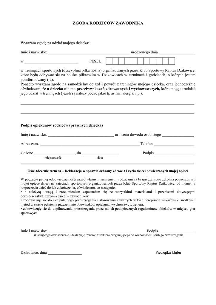 ZGODA RODZICÓW ZAWODNIKA Wyrażam zgodę na udział mojego dziecka: Imię i nazwisko: _________________________________________ urodzonego dnia __________________ w ___________________________ PESEL w treningach sportowych (dyscyplina piłka nożna) organizowanych przez Klub Sportowy Raptus Dzikowice, które będą odbywać się na boisku piłkarskim w Dzikowicach w terminach i godzinach, o których jestem poinformowany (-a). Ponadto wyrażam zgodę na samodzielny dojazd i powrót z treningów mojego dziecka, oraz jednocześnie oświadczam, że u dziecka nie ma przeciwwskazań zdrowotnych i wychowawczych, które mogą utrudniać jego udział w treningach (jeżeli są należy podać jakie tj. astma, alergia, itp.): _______________________________________________________________________________________ _______________________________________________________________________________________ Podpis opiekunów rodziców (prawnych dziecka) Imię i nazwisko: _________________________________ nr i seria dowodu osobistego ________________ Adres zam. __________________________________________________ Telefon ____________________ złożone ____________________ , dn. __________________ miejscowość Podpis ____________________ data Oświadczenie trenera – Deklaracja w sprawie ochrony zdrowia i życia dzieci powierzonych mojej opiece W poczuciu pełnej odpowiedzialności przed własnym sumieniem, rodzicami za bezpieczeństwo zdrowia powierzonych mojej opiece dzieci na zajęciach sportowych organizowanych przez Klub Sportowy Raptus Dzikowice, od momentu rozpoczęcia zajęć do ich zakończenia, oświadczam, co następuje: • z należytą uwagą i zrozumieniem zapoznałem się ze wszystkimi materiałami i przepisami dotyczącymi bezpieczeństwa, zdrowia dzieci – zawodników, • zobowiązuję się do skrupulatnego przestrzegania i stosowania zawartych w tych przepisach wskazówek, środków i metod w czasie pełnienia przeze mnie obowiązków opiekuna, wychowawcy, trenera, • zobowiązuję się do dopilnowania przestrzegania przez moich podopiecznych regulaminów obiektów w miejscu gier sportowych. Imię i nazwisko: _________________________________________ Podpis __________________ składającego oświadczenie i deklarację trenera/instruktora przyjmującego do wiadomości i ścisłego przestrzegania Dzikowice, dnia _________________ Pieczątka klubu