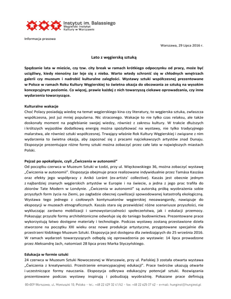 Informacja prasowa Warszawa, 29 Lipca 2016 r. Lato z węgierską sztuką Spędzanie lata w mieście, czy tzw. city break w ramach krótkiego odpoczynku od pracy, może być uciążliwy, kiedy nienośny żar leje się z nieba. Warto wtedy schronić się w chłodnych wnętrzach galerii czy muzeum i nadrobić kulturalne zaległości. Wystawy sztuki współczesnej prezentowane w Polsce w ramach Roku Kultury Węgierskiej to świetna okazja do obcowania ze sztuką na wysokim koncepcyjnym poziomie. Co więcej, prawie każdej z nich towarzyszą ciekawe oprowadzania, czy inne wydarzenia towarzyszące. Kulturalne wakacje Choć Polacy posiadają wiedzę na temat węgierskiego kina czy literatury, to węgierska sztuka, zwłaszcza współczesna, jest już mniej popularna. Nic straconego. Wakacje to nie tylko czas relaksu, ale także doskonały moment na pogłebianie swojej wiedzy, również z zakresu kultury. W trakcie dłuższych i krótszych wyjazdów dodatkową energię można spożytkować na wystawy, nie tylko tradycyjnego malarstwa, ale również sztuki współczesnej. Trwający właśnie Rok Kultury Węgierskiej i związane z nim wydarzenia to świetna okazja, aby zapoznać się z pracami najciekawszych artystów znad Dunaju. Ekspozycje prezentujące różne formy sztuki można zobaczyć przez całe lato w największych miastach Polski. Pejzaż po apokalipsie, czyli „Ćwiczenia w autonomii” Od początku czerwca w Muzeum Sztuki w Łodzi, przy ul. Więckowskiego 36, można zobaczyć wystawę „Ćwiczenia w autonomii”. Ekspozycja obejmuje prace realizowane indywidualnie przez Tamása Kaszása oraz efekty jego współpracy z Anikó Loránt (ex-artists' collective). Kaszás jest obecnie jednym z najbardziej znanych węgierskich artystów w Europie i na świecie, a jedna z jego prac trafiła do zbiorów Tate Modern w Londynie. „Ćwiczenia w autonomii” są autorską próbą wyobrażenia sobie przyszłych form życia na Ziemi, po zagładzie obecnej cywilizacji spowodowanej katastrofą ekologiczną. Wystawa tego jednego z czołowych kontynuatorów węgierskiej neoawangardy, nawiązuje do ekspozycji w muzeach etnograficznych. Kaszás stara się przewidzieć różne scenariusze przyszłości, nie wykluczając zarówno mobilizacji i samowystarczalności społeczeństwa, jak i eskalacji przemocy. Pokazując przyszłe formy architektoniczne odwołuje się do taniego budownictwa. Prezentowane prace wykorzystują łatwo dostępne materiały i technologie. Podczas wystawy zostaną przestawione dzieła stworzone na początku XXI wieku oraz nowe produkcje artystyczne, przygotowane specjalnie dla przestrzeni łódzkiego Muzeum Sztuki. Ekspozycja jest dostępna dla zwiedzających do 25 września 2016. W ramach wydarzeń towarzyszących odbędą się oprowadzenia po wystawie: 14 lipca prowadzone przez Aleksandrę Jach, natomiast 28 lipca przez Marka Styczyńskiego. Edukacja w formie sztuki 24 czerwca w Muzeum Sztuki Nowoczesnej w Warszawie, przy ul. Pańskiej 3 została otwarta wystawa „Ćwiczenia z kreatywności. Przestrzenie emancypacyjnej edukacji”. Prace twórców ukazują otwarte i uczestniczące formy nauczania. Ekspozycja odkrywa edukacyjny potencjał sztuki. Rozwiązania prezentowane podczas wystawy inspirują i pobudzają wyobraźnię. Pokazane prace definiują kreatywność, jako formę działania umożliwiającą wspólnotowe uczenie się, prowadzące do kształtowania się osobowości i relacji międzyludzkich. Tytuł wystawy nawiązuje do nazwy kursu artystycznego, prowadzonego w latach 70-tych w Budapeszcie przez nestorów neoawangardy Miklósa Erdély’ego i Dórę Maurer. Architektura wystawy zaprojektowana przez Tamása Kaszása nawiązuje do „Poipoidromu” Roberta Filliou i Joachima Pfeufera, instalacji architektonicznej zaprojektowanej w latach 60-tych XX wieku, która w swojej przestrzeni odzwierciedlała kolejne etapy procesu twórczego. Ekspozycję będzie można oglądać w Warszawie do 4 września 2016 roku. Wystawie towarzyszy rozbudowany program edukacyjny m.in. bezpłatne warsztaty i oprowadzania zarówno dla dzieci jak i dorosłych. Polsko-węgierski dialog sztuki Wystawę zbiorową „POLISH(ED)HUNGARIAN”, można zobaczyć do 2 września 2016 r. w Węgierskim Instytucie Kultury w Warszawie przy ul. Moniuszki 10. Jest ona rezultatem współpracy pięciu galerii z Węgier (Erika Deák, Inda, Ani Molnár, Várfok, Viltin) i pięciu z Polski (Apteka Sztuki, Czułość, Leto, Propaganda, Starter). Galerie te są także wystawcami na prestiżowych targach Art Market Budapest. Podczas tego październikowego wydarzenia, polska sztuka, we współpracy z CAFe Budapest Contemporary Art. Festival, znajdzie się w centrum uwagi. Wystawa „POLISH(ED)HUNGARIAN” stała się pretekstem do połączenia koncepcji kuratorskich, z których każda wyłania i angażuje reprezentujących je twórców. Efektem tej pracy jest unikalna ekspozycja. Wystawa jest zachętą do artystycznego dialogu pomiędzy wiodącymi twórcami polskiej i węgierskiej sztuki oraz inicjacją trwałej współpracy i wzmocnieniem związków kulturowych w regionie. Zaangażowani artyści stworzyli dzieła wykorzystując różne formy sztuki. Dzięki temu, ekspozycja jest niezwykle interesującym przykładem zestawienia polskich i węgierskich dzieł. Wernisaż wystawy odbył się w warszawskiej Aptece Sztuki podczas Warszawskich Tragów Książki, których Węgry były Gościem Honorowym. 60. rocznica Rewolucji Wystawa „1956 Polska – Węgry. Historia i pamięć” upamiętnia wydarzenia z 1956 roku. 60 lat temu, 23 października wybuchło powstanie węgierskie, które trwało do 10 listopada. Zryw miał na celu uwolnienie narodu spod sowieckiej władzy. Ważną rolę odegrały tu także wcześniejsze, czerwcowe wydarzenia w Poznaniu, gdzie w tym samym roku doszło do antykomunistycznej rewolty mieszkańców miasta. Ekspozycja pokazuje losy dwóch narodów, które mimo różnego przebiegu historii, w czasie II