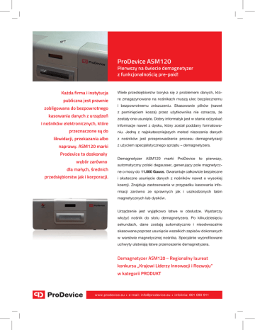 ProDevice ASM120 Pierwszy na świecie demagnetyzer z funkcjonalnością pre-paid! Każda firma i instytucja Wiele przedsiębiorstw boryka się z problemem danych, któ- publiczna jest prawnie re zmagazynowane na nośnikach muszą ulec bezpiecznemu zobligowana do bezpowrotnego kasowania danych z urządzeń i nośników elektronicznych, które i bezpowrotnemu zniszczeniu. Skasowanie plików (nawet z pominięciem kosza) przez użytkownika nie oznacza, że zostały one usunięte. Dobry informatyk jest w stanie odzyskać informacje nawet z dysku, który został poddany formatowa- przeznaczone są do niu. Jedną z najskuteczniejszych metod niszczenia danych likwidacji, przekazania albo z nośników jest przeprowadzenie procesu demagnetyzacji naprawy. ASM120 marki Prodevice to doskonały wybór zarówno dla małych, średnich przedsiębiorstw jak i korporacji. z użyciem specjalistycznego sprzętu – demagnetyzera. Demagnetyzer ASM120 marki ProDevice to pierwszy, automatyczny polski degausser, generujący pole magnetyczne o mocy do 11.000 Gauss. Gwarantuje całkowicie bezpieczne i skuteczne usunięcie danych z nośników nawet o wysokiej koercji. Znajduje zastosowanie w przypadku kasowania informacji zarówno ze sprawnych jak i uszkodzonych taśm magnetycznych lub dysków. Urządzenie jest wyjątkowo łatwe w obsłudze. Wystarczy włożyć nośnik do slotu demagnetyzera. Po kilkudziesięciu sekundach, dane zostają automatycznie i nieodwracalnie skasowane poprzez usunięcie wszelkich zapisów dokonanych w warstwie magnetycznej nośnika. Specjalnie wyprofilowane uchwyty ułatwiają łatwe przenoszenie demagnetyzera. konkursu „Krajowi Liderzy Innowacji i Rozwoju” w kategorii PRODUKT www.prodevice.eu • e-mail: [email protected] • infolinia: 801 090 911 ProDevice ASM120 Licencjonowanie w trybie MaaS (Machine as a Service) Prodevice to marka najwyższej klasy urządzeń do niszczenia danych z nośników magnetycznych. Po przeprowadzeniu demagnetyzacji, informacje na taśmach LTO, 3592, T10K oraz dyskach twardych 2,5”/3,5” zostają bezpowrotnie utracone. Niektóre nośniki taśmowe, zwłaszcza starszej technologii jak DLT, DDS, kasety audio czy video (analogowe) odzyskują swoje pierwotne właściwości Demagnetyzer ASM120 to INNOWACYJNE urządzenie, które zapewnia pełny komfort użytkowania. Wyposażony jest w ekran LCD, który informuje nie tylko o całkowitej ilości wykonanych cykli, ale także o ilości zdemagnetyzowanych nośników w trakcie bieżącej sesji. Na wyświetlaczu prezentowana jest również informacja o postępie procesu ładowania. ASM120 został wyposażony w nowoczesne oprogramowanie narzędziowe, zapewniające odczyt danych historycznych: data, nr cyklu oraz ocena prawidłowości wygenerowanego impulsu. Co ważne – pamięć przechowuje przynajmniej 1000 rekordów, w przypadku zapełnienia banku danych, najstarszy z nich jest nadpisywany. W odróżnieniu od innych urządzeń, ASM120 umożliwia programowanie dozwolonej ilości cykli kasowania informacji, po przekroczeniu których następuje jego automatyczna blokada. Dodatkowo, co jest również nowością, demagnetyzer oferuje pracę w dwóch trybach dostępu: • poziom ADMIN – dla Klientów którzy zakupili urządzenie • poziom PPMS USER – NOWOŚĆ: dla Klientów wypożyczających demagnetyzer istnieje możliwość zdalnego doładowania magnetyczne. urządzenia na określoną ilość cykli kasowania! Gwarantuje to innowacyjna technologia PPMS (Pre-Paid Management System) Nośniki kwalifikujące się do demagnetyzacji: • dyski HDD 2,5’ i 3,5’cala • dyski z macierzy z obudową • taśmy do streamerów: LT01 - LT06, DLT, SDLT, DDS, DAT, AIT, Travan, SLR, QIC, 3592, 3590E, 3490E, 3480, 9840, 9940, T10K, VHS • dyskietki komputerowe, kasety audio, video Specyfikacja techniczna: Maksymalny rozmiar nośnika 200 mm x 120 mm x 50 mm Pole magnetyczne do 1,1T= 11 000 Gauss Cykl kasowania 30 s / nośnik Zasilanie 115 V, 230 V/50 Hz, 60 Hz Wyświetlacz LCD Tak Interfejs TCP/IP - komunikacja z oprogramowaniem narzędziowym Tak Wymiary Wys. 200 mm. x Szer. 465 mm. x Gł. 325 mm Waga 30 kg www.prodevice.eu • e-mail: [email protected] • infolinia: 801 090 911