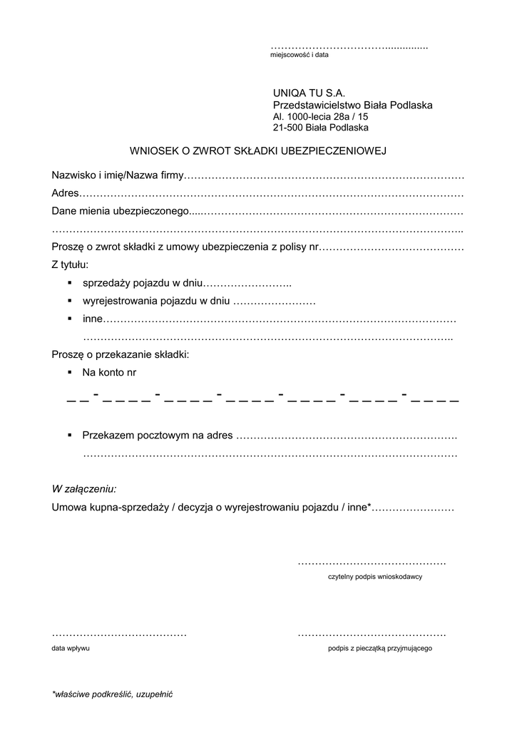 ……………………………............... miejscowość i data UNIQA TU S.A. Przedstawicielstwo Biała Podlaska Al. 1000-lecia 28a / 15 21-500 Biała Podlaska WNIOSEK O ZWROT SKŁADKI UBEZPIECZENIOWEJ Nazwisko i imię/Nazwa firmy……………………………………………………………………… Adres………………………………………………………………………………………………… Dane mienia ubezpieczonego.....………………………………………………………………… ……………………………………………………………………………………………………….. Proszę o zwrot składki z umowy ubezpieczenia z polisy nr…………………………………… Z tytułu: sprzedaży pojazdu w dniu…………………….. wyrejestrowania pojazdu w dniu …………………… inne………………………………………………………………………………………… …………………………………………………………………………………………….. Proszę o przekazanie składki: Na konto nr __-____-____-____-____-____-____ Przekazem pocztowym na adres ………………………………………………………. ……………………………………………………………………………………………… W załączeniu: Umowa kupna-sprzedaży / decyzja o wyrejestrowaniu pojazdu / inne*…………………… ……………………………………. czytelny podpis wnioskodawcy ………………………………… data wpływu *właściwe podkreślić, uzupełnić ……………………………………. podpis z pieczątką przyjmującego