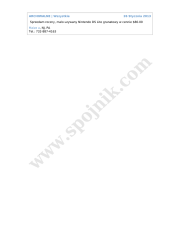 ARCHIWALNE | Wszystkie 26 Stycznia 2013 Sprzedam roczny, malo uzywany Nintendo DS Lite granatowy w cennie $80.00 w w w .s po jn ik .c o m Maize a, NJ, PA Tel.: 732-887-4163