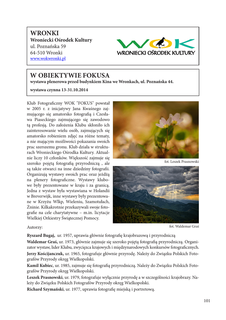 WRONKI Wroniecki Ośrodek Kultury ul. Poznańska 59 64-510 Wronki www.wokwronki.pl W OBIEKTYWIE FOKUSA wystawa plenerowa przed budynkiem Kina we Wronkach, ul. Poznańska 44. wystawa czynna 13-31.10.2014 Klub Fotograficzny WOK "FOKUS" powstał w 2005 r. z inicjatywy Jana Kwaśnego zajmującego się amatorsko fotografią i Czesława Piaseckiego zajmującego się zawodowo tą profesją. Do założenia Klubu skłoniło ich zainteresowanie wielu osób, zajmujących się amatorsko robieniem zdjęć na różne tematy, a nie mającym możliwości pokazania swoich prac szerszemu gronu. Klub działa w strukturach Wronieckiego Ośrodka Kultury. Aktualnie liczy 10 członków. Większość zajmuje się szeroko pojętą fotografią przyrodniczą , ale są także otwarci na inne dziedziny fotografii. Organizują wystawy swoich prac oraz jeżdżą na plenery fotograficzne. Wystawy klubowe były prezentowane w kraju i za granicą. Jedna z wystaw była wystawiana w Holandii w Breverwijk, inne wystawy były prezentowane w Krzyżu Wlkp, Wieleniu, Szamotułach, Żninie. Kilkakrotnie przekazywali swoje fotografie na cele charytatywne – m.in. licytacje Wielkiej Orkiestry Świątecznej Pomocy. Autorzy: fot. Leszek Prasnowski fot. Waldemar Graś Ryszard Bugaj, ur. 1957, uprawia głównie fotografię krajobrazową i przyrodniczą Waldemar Graś, ur. 1973, głównie zajmuje się szeroko pojętą fotografią przyrodniczą. Organizator wystaw, lider Klubu, zwycięzca krajowych i międzynarodowych konkursów fotograficznych. Jerzy Kościjanczuk, ur. 1965, fotografuje głównie przyrodę. Należy do Związku Polskich Fotografów Przyrody okręg Wielkopolski. Kamil Kubiec, ur. 1985, zajmuje się fotografią przyrodniczą. Należy do Związku Polskich Fotografów Przyrody okręg Wielkopolski. Leszek Prasnowski, ur. 1979, fotografuje wyłącznie przyrodę a w szczególności krajobrazy. Należy do Związku Polskich Fotografów Przyrody okręg Wielkopolski. Richard Szymański, ur. 1977, uprawia fotografię miejską i portretową. 101