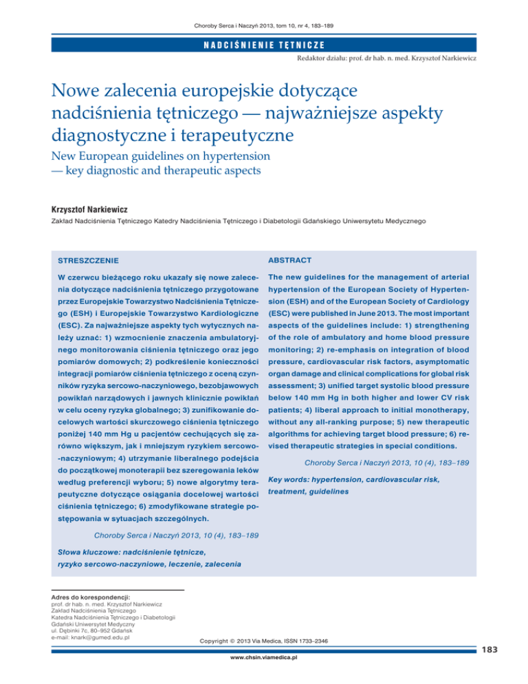 Choroby Serca i Naczyń 2013, tom 10, nr 4, 183–189 NADCIŚNIENIE TĘTNICZE Redaktor działu: prof. dr hab. n. med. Krzysztof Narkiewicz Nowe zalecenia europejskie dotyczące nadciśnienia tętniczego — najważniejsze aspekty diagnostyczne i terapeutyczne New European guidelines on hypertension — key diagnostic and therapeutic aspects Krzysztof Narkiewicz Zakład Nadciśnienia Tętniczego Katedry Nadciśnienia Tętniczego i Diabetologii Gdańskiego Uniwersytetu Medycznego STRESZCZENIE ABSTRACT W czerwcu bieżącego roku ukazały się nowe zalece- The new guidelines for the management of arterial nia dotyczące nadciśnienia tętniczego przygotowane hypertension of the European Society of Hyperten- przez Europejskie Towarzystwo Nadciśnienia Tętnicze- sion (ESH) and of the European Society of Cardiology go (ESH) i Europejskie Towarzystwo Kardiologiczne (ESC) were published in June 2013. The most important (ESC). Za najważniejsze aspekty tych wytycznych na- aspects of the guidelines include: 1) strengthening leży uznać: 1) wzmocnienie znaczenia ambulatoryj- of the role of ambulatory and home blood pressure nego monitorowania ciśnienia tętniczego oraz jego monitoring; 2) re-emphasis on integration of blood pomiarów domowych; 2) podkreślenie konieczności pressure, cardiovascular risk factors, asymptomatic integracji pomiarów ciśnienia tętniczego z oceną czyn- organ damage and clinical complications for global risk ników ryzyka sercowo-naczyniowego, bezobjawowych assessment; 3) unified target systolic blood pressure powikłań narządowych i jawnych klinicznie powikłań below 140 mm Hg in both higher and lower CV risk w celu oceny ryzyka globalnego; 3) zunifikowanie do- patients; 4) liberal approach to initial monotherapy, celowych wartości skurczowego ciśnienia tętniczego without any all-ranking purpose; 5) new therapeutic poniżej 140 mm Hg u pacjentów cechujących się za- algorithms for achieving target blood pressure; 6) re- równo większym, jak i mniejszym ryzykiem sercowo- vised therapeutic strategies in special conditions. -naczyniowym; 4) utrzymanie liberalnego podejścia Choroby Serca i Naczyń 2013, 10 (4), 183–189 do początkowej monoterapii bez szeregowania leków według preferencji wyboru; 5) nowe algorytmy tera- Key words: hypertension, cardiovascular risk, peutyczne dotyczące osiągania docelowej wartości treatment, guidelines ciśnienia tętniczego; 6) zmodyfikowane strategie postępowania w sytuacjach szczególnych. Choroby Serca i Naczyń 2013, 10 (4), 183–189 Słowa kluczowe: nadciśnienie tętnicze, ryzyko sercowo-naczyniowe, leczenie, zalecenia Adres do korespondencji: prof. dr hab. n. med. Krzysztof Narkiewicz Zakład Nadciśnienia Tętniczego Katedra Nadciśnienia Tętniczego i Diabetologii Gdański Uniwersytet Medyczny ul. Dębinki 7c, 80–952 Gdańsk e-mail: [email protected] Copyright © 2013 Via Medica, ISSN 1733–2346 www.chsin.viamedica.pl 183 Choroby Serca i Naczyń 2013, tom 10, nr 4 WPROWADZENIE W czerwcu bieżącego roku ukazały się nowe zalecenia dotyczące nadciśnienia tętniczego przygotowane przez Europejskie Towarzystwo Nadciśnienia Tętniczego (ESH, European Society of Hypertension) i Europejskie Towarzystwo Kardiologiczne (ESC, European Society of Cardiology) [1]. Poprzednie europejskie wytyczne ukazały się w latach 2003 [2] i 2007 [3]. Opublikowanie nowych zaleceń jest efektem kilkuletniego wysiłku ESH i ESC. Decyzja o ich przygoto waniu zapadła w 2010 roku. Sam proces przygotowywania dokumentu trwał 18 miesięcy; nadzorowało go bezpośrednio dwóch przewodniczących Task Force (Prof. Giuseppe Mancia z ESH i Prof. Robert Fagard z ESC) oraz trzech koordynatorów. W opracowanie dokumentu było zaangażowanych 20 autorów oraz 42 recenzentów reprezentujących oba towarzystwa. Ogromnym wyzwaniem była szczegółowa analiza wyników wcześniejszych badań (ostatecznie piśmiennictwo objęło ponad 700 pozycji) oraz przygotowanie zaleceń z uwzględnieniem stopnia rekomendacji (I, IIa, IIb i III) i poziomu dowodów (A, B i C). Zalecenia ukazały się jednocześnie w oficjalnych czasopismach ESH („Journal of Hypertension” i „Blood Pressure”) oraz ESC („European Heart Journal”). Celem niniejszego artykułu jest omówienie najważniejszych aspektów diagnostycznych i terapeutycznych tego dokumentu. KLASYFIKACJA CIŚNIENIA TĘTNICZEGO Utrzymano wcześniejszą klasyfikację nadciśnienia tętniczego (na podstawie pomiarów gabinetowych) z podziałem na trzy stopnie i wyróżnieniem podtypu izolowanego 184 Tabela 1. Klasyfikacja ciśnienia tętniczego w pomiarach gabinetowych (na podstawie [1]) Kategoria SBP DBP Ciśnienie optymalne < 120 i < 80 Ciśnienie prawidłowe 120–129 i/lub 80–84 Ciśnienie wysokie prawidłowe 130–139 i/lub 85–89 Nadciśnienie 1. stopnia 140–159 i/lub 90–99 Nadciśnienie 2. stopnia 160–179 i/lub 100–109 Nadciśnienie 3. stopnia ≥ 180 i/lub ≥ 110 Izolowane nadciśnienie skurczowe ≥ 140 i < 90 aKategoria ciśnienia tętniczego jest definiowana przez wyższe ciśnienie skurczowe (SBP, systolic blood pressure) lub rozkurczowe (DBP, diastolic blood pressure). Izolowane nadciśnienie skurczowe należy dzielić na stopnie 1., 2. i 3., zgodnie z podanymi kategoriami ciśnienia skurczowego nadciśnienia skurczowego. W klasyfikacji zachowano również podział prawidłowych wartości ciśnienia na optymalne, prawidłowe i wysokie prawidłowe (tab. 1). OCENA RYZYKA SERCOWO-NACZYNIOWEGO W zaleceniach podkreślono konieczność integracji pomiarów ciś nienia tętniczego z oceną czynników ryzyka sercowo-naczyniowego, bezobjawowych powikłań narządowych i jawnych klinicznie powikłań w celu oceny ryzyka globalnego. Czynniki wpływające na rokowanie i wykorzystywane do stratyfikacji globalnego ryzyka sercowo-naczyniowego przedstawiono w tabeli 2. Należy podkreślić, że za czynnik ryzyka sercowo-naczyniowego uznano ciśnienie tętna (różnicę między skurczowym [