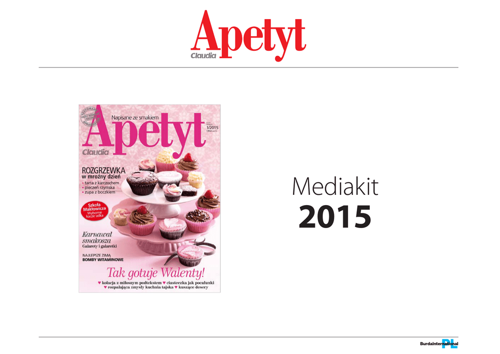 Mediakit 2015 Słowo wstępu Magazyn kulinarny Claudia Apetyt powstał z myślą o miłośnikach dobrego jedzenia, którzy szukają nowych kulinarnych inspiracji. Pismo skierowane jest do tych, dla których bardzo ważna jest jakość i sposób podania posiłku celebrowanego z rodziną czy przyjaciółmi. Apetyt to idealny towarzysz podczas codziennych kulinarnych przygód: podsuwa pomysły, inspiruje, pokazuje najnowsze trendy. Wszystko to czyni w bardzo przystępny i przyjacielski sposób, stawiając na jakość, wiarygodność i nowoczesność. Gotowanie z Apetytem jest przyjemnością, relaksem, radosnym twórczym wyzwaniem. Z Apetytem życie nabiera wyjątkowego smaku. Anetta Sokołowska redaktor naczelna wstęp Informacje o tytule W każdym wydaniu APETYTU czytelnicy znajdą takie działy jak: ● „Na każdy dzień. Od poniedziałku do piątku” – proste dania z pomysłem dla zapracowanych ● „Kuchnia sezonowa” – przepisy na dania z najsmaczniejszych o danej porze roku produktów ● „Na weekend” – eleganckie potrawy, którym można poświęcić nieco więcej czasu, dania tworzone dla przyjemności, propozycje szefów kuchni ● „Wokół stołu” – reportaże, ciekawostki, aktualności związane z kulinariami o tytule Formaty i cennik rozkładówka cała strona 2 x (5+210+5) (5+210+5) x (5+275+5) mm (5+275+5) mm x 1/2 strony pion 1/2 strony poziom 1/3 strony pion 1/3 strony poziom (5+102+5) (5+210+5) (5+67+5) (5+210+5) x x (5+135+5) mm (5+275+5) mm x (5+275+5) mm x (5+88+5) mm rozkładówka II okładka III okładka IV okładka cała strona 1/2 strony 1/3 strony 1/4 strony junior page 43 900 zł 26 900 zł 26 900 zł 28 900 zł 24 900 zł 16 900 zł 11 900 zł 9 900 zł 21 900 zł Dopłaty 1/4 strony pion 1/4 strony kwadrat 1/4 strony poziom Junior page (5+56+5) x (5+275+5) mm (5+102+5) (5+210+5) (5+134+5) x x x (5+135+5) mm (5+69+5) mm (5+165+5) mm Reklama w pierwszej 1/2 pisma Reklama w pierwszej 1/3 pisma Reklama przy wybranym materiale Drugi reklamodawca 15% 30% 15% 10% Inne niestandardowe reklamy na podstawie odrębnych kalkulacji. Do cen należy dodać podatek VAT w obowiązującej stawce. formaty i cennik Harmonogram wydawniczy harmonogram Numer wydania Termin dostarczenia materiałów Pierwszy dzień sprzedaży 1/2015 05.01.2015 19.01.2015 2/2015 04.03.2015 18.03.2015 3/2015 28.04.2015 13.05.2015 4/2015 01.07.2015 15.07.2015 5/2015 02.09.2015 16.09.2015 6/2015 29.10.2015 12.11.2015 Dane techniczne i zasady przyjmowania reklam Format netto 210x275 mm Pliki PDF (format preferowany) Photoshop: TIFF, EPS, 300 dpi, CMYK Illustrator: EPS, CMYK, teksty zamienione na krzywe Total Ink Limit (TIL): 3 20% Spady min. 5 mm; minimalna odległość istotnych elementów od linii cięcia: 5 mm Nośniki CD Pliki do 10 MB e-mail: [email protected] ftp://ftp.burdamedia.pl/ login: reklama hasło: burdamedia Druk offset Szczegółową specyfikację techniczną przesyłamy na życzenie klienta. W razie pytań technicznych prosimy o kontakt: Tomasz Langsam, tel. +48 71 37 62 828, e-mail: [email protected] dane techniczne Szczegółowe warunki sprzedaży powierzchni reklamowej, w tym procedury zamawiania, publikacji oraz emisji ogłoszeń i/lub reklam w czasopismach wydawanych przez Burda Media Polska Sp. z o.o. oraz Spółki z grupy Burda Polska, tj. Burda Communications Sp. z o.o., Burda Publishing Polska Sp. z o.o. Sp. Komandytowa, Burda GL Polska Sp. z o.o. oraz Burda NG Polska Sp. z o.o. Sp. Komandytowa, określone są w Regulaminie Zamieszczania Reklam i Ogłoszeń, dostępnym pod adresem www.burdamedia.pl Dlaczego prasa 1 2 Prasa angażuje – czytanie odbywa się w skupieniu; trudno przy lekturze prasy oddawać się jednocześnie innym czynnościom. Prasa buduje wiarygodność – poprzez „towarzyszenie” czytelnikom i „rozmawianie” z nimi (poprzez e-maile, listy, ankiety, komentarze, polemiki) prasa ma opinię doradcy, który umożliwia dokonywanie wyboru. Zaufanie, jakim darzą czytelnicy swoje tytuły i ich wiarygodność wzmacniają przekaz reklamowy. 3 Prasa pogłębia przekaz – poprzez umieszczanie w reklamie pogłębionego komunikatu odbiorca może dowiedzieć się więcej o produkcie. Reklamy prasowe mogą świadomie prezentować inne treści i formy wyrazu niż reklama w innych mediach. W ten sposób reklama prasowa może wzmacniać i modyfikować wizerunek produktu. 4 Prasa dociera precyzyjnie – bogactwo tematyczne prasy oraz szeroko zakrojone badania czytelnictwa i badania konsumenckie pozwalają na precyzyjne opisanie czytelnika i tym samym dobre dopasowanie medium do reklamowanych produktów. benefity 5 Prasa to medium kreatywne – oferta dla reklamodawców jest bardzo szeroka. Poza ogromną liczbą formatów na stronach pisma istnieje cały szereg różnorodnych form, takich jak wrzutki, wklejki, wszywki, banderole, paski zapachowe, zakładki, kalki i wiele innych, które zapadają w pamięć i otwierają nowy rozdział w reklamie prasowej. Możliwości są niemal nieograniczone. 6 Prasa to intymny kontakt z czytelnikiem – jak wynika z badań prasy kobiecej, większości czytelnikom czytanie kojarzy się z relaksem i pewnego rodzaju intymnością, co wpływa na odbiór reklamy. Pismo skłania do dyskusji z koleżankami: o artykułach, kosmetykach, o tym, co jest skuteczne, co warto polecić. 7 Prasa nie irytuje – z najnowszych badań wynika, że widownia telewizyjna jest poirytowana liczbą reklam emitowanych w telewizji. Aż 80%* respondentów uznało reklamę telewizyjną za najbardziej dokuczliwą, podczas gdy reklamę w prasie za dokuczliwą uważa tylko 8%*. * Źródło: prezentacja PRO Media House na podstawie badania Demoskopu. Kontakt www.burdamedia.pl Biuro Reklamy ul. Marynarska 15, 02-674 Warszawa BURDA MEDIA POLSKA SP. Z O.O. ul. Marynarska 15 02-674 Warszawa NIP: 101-00-01-332 Konto bankowe: Raiffeisen Bank Polska SA Oddział we Wrocławiu, ul. Powstańców Śląskich 7a 49 1750 1064 0000 0000 0721 7242 Termi płatności: po p