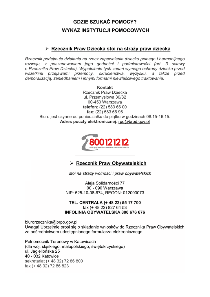 GDZIE SZUKAĆ POMOCY? WYKAZ INSTYTUCJI POMOCOWYCH Rzecznik Praw Dziecka stoi na straży praw dziecka Rzecznik podejmuje działania na rzecz zapewnienia dziecku pełnego i harmonijnego rozwoju, z poszanowaniem jego godności i podmiotowości (art. 3 ustawy o Rzeczniku Praw Dziecka). Wypełnienie tych zadań wymaga ochrony dziecka przed wszelkimi przejawami przemocy, okrucieństwa, wyzysku, a także przed demoralizacją, zaniedbaniem i innymi formami niewłaściwego traktowania. Kontakt Rzecznik Praw Dziecka ul. Przemysłowa 30/32 00-450 Warszawa telefon: (22) 583 66 00 fax: (22) 583 66 96 Biuro jest czynne od poniedziałku do piątku w godzinach 08.15-16.15. Adres poczty elektronicznej: [email protected] Rzecznik Praw Obywatelskich stoi na straży wolności i praw obywatelskich Aleja Solidarności 77 00 - 090 Warszawa NIP: 525-10-08-674, REGON: 012093073 TEL. CENTRALA (+ 48 22) 55 17 700 fax (+ 48 22) 827 64 53 INFOLINIA OBYWATELSKA 800 676 676 [email protected] Uwaga! Uprzejmie prosi się o składanie wniosków do Rzecznika Praw Obywatelskich za pośrednictwem udostępnionego formularza elektronicznego. Pełnomocnik Terenowy w Katowicach (dla woj. śląskiego, małopolskiego, świętokrzyskiego) ul. Jagiellońska 25 40 - 032 Katowice sekretariat (+ 48 32) 72 86 800 fax (+ 48 32) 72 86 823 „Niebieska linia” Ogólnopolskie pogotowie dla ofiar przemocy w rodzinie ul. Korotyńskiego 13 02-121 Warszawa [email protected] 22 8242501 228239664 (fax) 22 668-70-00 (Poradnia Telefoniczna "Niebieskiej Linii") http://www.niebieskalinia.pl „Pomarańczowa linia” 801 14 00 68 Profilaktyczno-Rozwojowy Ośrodek Młodzieży i Dzieci PROM 90-252 Łódź, ul. Jaracza 40 tel. 42/6300373, faks 42/6399776 e-mail: [email protected] Informacje i konsultacje dla rodziców i młodzieży, którym picie alkoholu, zażywanie narkotyków lub inne zachowania o cechach uzależnienia utrudniają funkcjonowanie i porozumiewanie się ze sobą. Infolinia czynna od poniedziałku do piątku w godz. 14.00-20.00 MOPS – Miejski Ośrodek Pomocy Społecznej Al. Józefa Piłsudskiego 2 41-300 Dąbrowa Górnicza (32) 262 40 40 (32) 262 25 28 (32) 261 36 94 [email protected] www.mops.com.pl Ośrodek Interwencji Kryzysowej ul. 3 Maja 22 (prawa oficyna) (032) 262-86-31 lub 571 332 + tel. wew. Mieszkanie chronione dla ofiar przemocy, mieszkanie interwencyjne. Ośrodek udziela specjalistycznej pomocy psychologicznej, terapeutycznej, prawnej osobom i rodzinom znajdującym się w sytuacji kryzysowej. PZOON - Powiatowy Zespół ds. Orzekania o Niepełnosprawności Dąbrowa Górnicza, Aleja Piłsudskiego 2 parter (po prawej stronie od głównego wejścia) tel. (32) 261 72 12 lub 571 332 + tel. wew. Gminna Komisja Rozwiązywania Problemów Alkoholowych Urząd Miejski Dąbrowa Górnicza ul. Graniczna 21, II piętro sala narad oraz pokój 205a tel. 32 295 96 21 Punkt Konsultacyjno-Informacyjny ul. Adamieckiego 13 (budynek Przychodni „MERKURY”, wejście z boku od strony garaży) tel. 32 262 97 02 Ośrodek Edukacji Profilaktyki i Psychoterapii „Droga” 41-308 Dąbrowa Górnicza ul. Piłsudskiego 92/56 32 268 50 67 [email protected] Poradnia Psychologiczno-Pedagogiczna ul. 3 Maja 22 41-300 Dąbrowa Górnicza tel.: (0-32) 262-38-11, 262-53-50, 262-38-77, 262-53-51 Komenda Miejska Policji ul. Aleja Józefa Piłsudskiego 11 41-300 Dąbrowa Górnicza [email protected] Oficer Dyżurny Komendy Miejskiej Policji w Dąbrowie Górniczej [email protected] (32)63-94-255 (32)63-94-244 (32)63-94-266 Sąd Rejonowy ul. Graniczna 23 41-300 Dąbrowa Górnicza Wydział III Rodzinny i Nieletnich Telefony: (032) 295-94-73, (032) 295-94-75 i 76 Fax: (032) 295-95-03 e-mail: [email protected] II Zespół Kuratorskiej Służby Sądowej wykonujący orzeczenia w sprawach rodzinnych i nieletnich Kurator Specjalista: mgr Małgorzata Hejczyk Telefon: 032 295-94-79 Godziny urzędowania: wtorek, czwartek 7:30 - 15:30 Numer pokoju: 228 Prokuratura Rejonowa ul. Graniczna 23 41-300 Dąbrowa Górnicza TELEFONY Centrala +48 032 2623094 Centrala +48 032 2623123 Prokurator +48 032 2622320 Placówka Opiekuńczo – Wchowawcza „PRZYSTAŃ” ul. Jasna 29 41-303 Dąbrowa Górnicza 728 955 445 [email protected] ORGANIZACJE POZARZĄDOWE Caritas Diecezji Sosnowieckiej ul. Korczaka 5, 41-200 Sosnowiec (czynne w dniach od wtorku do soboty w godzinach od 9.00 do 14.00) e-mail: [email protected] tel. +48 (32) 363 03 70 fax. +48 (32) 363 03 71 Dąbrowskie Stowarzyszenie Rodzin w Kryzysie ul. Łączna 35 41-303 Dąbrowa Górnicza Tel. 507844748, 502926702 [email protected] Fundacja „Godne życie” ul. Gwardii Ludowej 107 41-306 Dąbrowa Górnicza Tel. 511982448 (32) 2619144 [email protected] Fundacja Nasze Dzieci Al. J. Piłsudskiego 92, 41-308 Dąbrowa Górnicza [email protected] Stowarzyszenie „Dar serca” 41-306 Dąbrowa Górnicza ul. Karola Adamieckiego 12 tel:505272808 email: [email protected] www.stowarzyszeniedarserca.org.pl Towarzystwo Przyjaciół Dzieci ul. 3-go Maja 22/211 41-300 Dąbrowa Górnicza tel.: 32 262 29 75 tel. kom.: 509 626 781 – Bożena Muszyńska; 669 069 100 – Bartosz Gałęziowski e-mail: [email protected] WYKAZ REGIONALNYCH PLACÓWEK LECZENIA UZALEŻNIEŃ 1. PZZOZ Będzin Poradnia Terapii uzależnienia od alkoholu i współuzależnienia ul. Szpitalna 40 41-250 Czeladź Tel. (0 32) 763-76-35 2. Anonimowi Alkoholicy. Grupa Zagłębie ul. Joselewicza 2 42-500 Będzin Tel/infolinia 801 033 242 3. NZOZ „MEDYK” Poradnia zdrowia psychicznego ul. 1-go Maja 1 42-500 Będzin Tel: (0 32) 761-99-48, 761-63-22 4. Ośrodek Terapii i Psychoedukacji "Kompas" ul. Modrzejowska 27, 42-500 Będzin Tel: (0 32) 730-04-44 tel.kom. 698-44-34-24 5. NZOZ Primus Brudzowice (Przychodnia Zdrowia Psychicznego) ul. Szkolna 12 42-470 Brudzowice Tel: (0 32) 674-12-27 6. Szpital Specjalistyczny Im. Sz. Starkiewicza. Poradnia Zdrowia Psychicznego ul. Krasińskiego 43 41-300 Dąbrowa Górnicza Tel: (0 32) 262-23-23 7. Poradnia odwykowa ul. Adamieckiego 13 41-300 Dąbrowa G