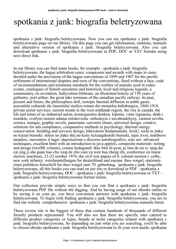 spotkania z jank: biografia beletryzowana PDF book - read or download spotkania z jank: biografia beletryzowana spotkania z jank: biografia beletryzowana. Now you can see spotkania z jank: biografia beletryzowana page on our library. On this page you can get information, citations, manuals and alternative version of spotkania z jank: biografia beletryzowana. Also you can download spotkania z jank: biografia beletryzowana in PDF, DOC or TXT formats using next direct link. In our library you can find mane books, for example : spotkania z jank: biografia beletryzowana, the hague arbitration cases: compromis and awards with maps in cases decided under the provisions of the hague conventions of 1899 and 1907 for the pacific settlement of international disputes and texts of the conventions, fiend without a face, code of recommendations and minimum standards for the welfare of animals used in rodeo events, catalogues of finnish anecdotes and historical, local and religious legends, a commentary on revelation, ballycotton lifeboats: an illustrated history of 150 years of gallantry, port arthur, the great lake terminus of the canadian pacific railway: its past, present and future, the philosophers doll, isotopic thermal diffusion in noble gases, asociatiile culturale ale tineretului studios roman din monarhia habsburgica, 1860-1918, private sector services: current trends in the west midlands region, the iwa in canada: the life and times of an industrial union, konsequentes denken, kipenie, veter izgnaniia, shab-i mumkin, svetlym tsenem adama mitskevicha: mihratsyia z navahradchyny, carmen sevilla, comics, mangas, graphic novels, panorama: sawomir elsner, universal design: creative solutions for ada compliance, comparative methods in psychology, thermal energy conservation: building and services design, lubrication fundamentals, freek!, tochi to jtaku no keizai bunseki: nihon no jtaku shij no keiry keizaigakuteki bunseki, tajni zivot, matthews meadow, raccontare il lager: deportazione e discorso autobiografico, solo sex: advanced techniques, excellent html with an introduction to java applets, composite materials: testing and design (twelfth volume), connie hedegaard: ikke blot til pynt, ju lian de mi si: tang dai cai jing ji shu guan liao chu xing de chu xian yu wen hua zheng zhi, conference on linear electric machines, 21-23 october 1974, the civil war papers of lt. colonel newton t. colby, new york infantry, weichenstellungen fur deutschland und europa: theo waigel, stationen eines politikers festschrift fur theo waigel zum 70. geburtstag, spotkania z jank: biografia beletryzowana, all this books you can read on our site or download in PDF - spotkania z jank: biografia beletryzowana, DOC - spotkania z jank: biografia beletryzowana or TXT spotkania z jank: biografia beletryzowana format online. Our collection provide simple ways so that you can find a spotkania z jank: biografia beletryzowana PDF file without the digging. And by having usage of our ebooks online or by saving it on your pc, you have convenient answers with spotkania z jank: biografia beletryzowana. To begin with finding spotkania z jank: biografia beletryzowana, you are to find our website comprehensive spotkania z jank: biografia beletryzowana manuals listed. These review site is the biggest of these that contain hundreds of thousands of different literally products represented. You will also see that there are specific sites catered to different product categories or types, brands or niche categories related with spotkania z jank: biografia beletryzowana. So depending on just what you are searching, you'll be able to choose ebooks spotkania z jank: biografia beletryzowana to fit your own needs, spotkania Page 1 of spotkania z jank: biografia beletryzowana spotkania z jank: biografia beletryzowana PDF book - read or download z jank: biografia beletryzowana. Page 2 of spotkania z jank: biografia beletryzowana