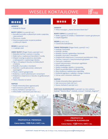 WESELE KOKTAJLOWE menu 1 APERITIF • Koktajl Kir Royal menu 2 APERITIF • Wino musujące „Jeane Dorsene Demi-Sec” BUFET CIEPŁY (1,5 porcji/1 os.) • Kawałki kurczaka w pikantnym sosie z papryką i pieczarkami • Pieczywo, masło • Warzywa gotowane na parze podane z ziołowym dipem DESER (2 porcje/1 os.) • 2 rodzaje ciast ZIMNY BUFET (finger food, 4 porcje/1 os.) • Malutkie terrine z warzyw z szynką • Małe tarty z wędzonym boczkiem i rucolą • Wiejski twaróg na plastrze ziemniaka z rolmopsami z wędzonego śledzia • Figi w chrupiącym boczku na łódeczkach z melona • Roladki z kurczaka z morelami • Ruloniki z szynki pieczonej z zielonymi szparagami • Ptysie z serem gorgonzola • Krakersy z serem pleśniowym i orzechami • Polędwica wieprzowa w boczku na grillowanym ananasie • Tatar z łososia na toście NAPOJE • Woda mineralna (bez ograniczeń) • Sok owocowy (300 ml/1 os.) • Kawa, herbata (1 porcja/1 os.) • Wino białe i czerwone (200 ml/1 os.) BUFET CIEPŁY (1,5 porcji/1 os.) • Małe cygarka ze schabu z nadzieniem i sosem grzybowym • Ciepła bagietka DESER (5 szt./1 os.) • Ciasteczka koktajlowe ZIMNE PRZEKĄSKI (finger food, 5 porcji/ 1 os.) • Koktajl z krewetek • Koktajl z drobiu • Rolada z kaczki z galaretką z borówek • Roladki z kurczka z morelami • Polędwiczki wieprzowe z suszonymi pomidorami i fetą • Terrine z warzyw z marynowanymi grzybami • Tuńczyk z melonem • Łosoś marynowany z kiszonym ogórkiem • Mini sałatka grecka • Małże świętego Jakuba z roszponką • Śledź na pumperniklu z jabłkami confit • Mus drobiowy nadziewany wątróbką • Kotleciki jagnięce z sałatką z mango i melona • Vol au vent z kremem ziołowym NAPOJE • Woda mineralna (bez ograniczeń) • Sok owocowy (300 ml/1 os.) • Kawa, herbata (1 porcja/1 os.) KOKTAJLE ALKOHOLOWE (2 porcje/1 os.) do wyboru: Koktajl ”Martini Blue”, Koktajl „Caruso”, Koktajl „Negroni” PROPOZYCJA PIERWSZA PROPOZYCJA Z WŁASNYM ALKOHOLEM Cena menu : 110 PLN z VAT/ 1 os. Cena menu : 130 PLN z VAT/ 1 os. KONTAKT: Hotel HP Park, tel. 61 874 11 00, [email protected]