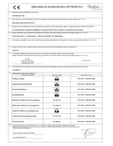 DEKLARACJA WŁAŚCIWOŚCI UŻYTKOWYCH 1. Niepowtarzalny kod identyfikacyjny typu wyrobu: 0100208-DoP-306 2. Numer typu, partii, serii lub jakikolwiek inny element umożliwiający identyfikację wyrobu budowlanego, wymagany zgodnie z art. 11 ust. 4: Marmoleum Sport (EN-ISO 24011) 3. Przewidziane przez producenta zamierzone użytkowanie lub użytkowania wyrobu budowlanego, zgodnie z mającą zastosowanie zharmonizowaną normą: Do stosowania jako wykładzina podłogowa w budynkach (EN 14041), zgodnie ze specyfikacją producenta. 4. Nazwa, zastrzeżona nazwa handlowa lub zastrzeżony znak towarowy oraz adres kontaktowy producenta, wymagany zgodnie z art. 11 ust. 5: Forbo Flooring B.V., Industrieweg 12, 1566 JP Assendelft, The Netherlands 5. 6. W stosownych przypadkach nazwa i adres kontaktowy upoważnionego przedstawiciela, którego pełnomocnictwo obejmuje zadania określone w art. 12 ust. 2: System lub systemy oceny i weryfikacji stałych właściwości użytkowych wyrobu budowlanego, określone w załączniku V: system 3 7. W przypadku deklaracji właściwości użytkowych dotyczącej wyrobu budowlanego objętego normą zharmonizowaną: Nazwa, zastrzeżona nazwa handlowa lub zastrzeżony znak towarowy oraz adres kontaktowy producenta, wymagany zgodnie z art. 11 ust. 5: MPA NRW Marsbruchstrasse 186 44287 Dortmund, Deutschland Notified Laboratory n°432 8. 0432-CPD-13 5778 W przypadku deklaracji właściwości użytkowych dotyczącej wyrobu budowlanego, dla którego wydana została europejska ocena techniczna: nie dotyczy 9. Deklarowane właściwości użytkowe Zasadnicze charakterystyki Reakcja na ogień T Zharmonizow ana norma EN 14041: 2004/AC:2006 Zawartość pięciochlorofenolu EN 14041: 2004/AC:2006 Emisja formaldehydu EN 14041: 2004/AC:2006 Z EN 14041: 2004/AC:2006 Właściwości elektryczne (rozpraszająca) nie dotyczy EN 14041: 2004/AC:2006 Właściwości elektryczne (przewodząca) nie dotyczy EN 14041: 2004/AC:2006 Własności elektryczne (antystatyczna) L EN 14041: 2004/AC:2006 Współczynnik przewodzenia ciepła 0.17 W/m.K EN 14041: 2004/AC:2006 Wodoszczelność nie dotyczy EN 14041: 2004/AC:2006 Antypoślizgowość 10. Właściw ości użytkow e Właściwości użytkowe wyrobu określone w pkt 1 i 2 są zgodne z właściwościami użytkowymi deklarowanymi w pkt 9. Niniejsza deklaracja właściwości użytkowych wydana zostaje na wyłączną odpowiedzialność producenta określonego w pkt 4. W imieniu producenta podpisał(-a): Director Operations: Jelle van der Zwaan Assendelft, 30-06-2013