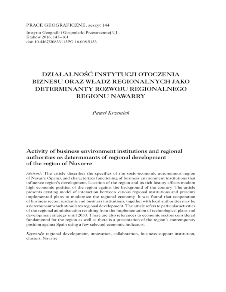 Prace Geograficzne, zeszyt 144 Instytut Geografii i Gospodarki Przestrzennej UJ Kraków 2016, 143 – 161 doi: 10.4467/20833113PG.16.008.5133 DZIAŁALNOŚĆ INSTYTUCJI OTOCZENIA BIZNESU ORAZ WŁADZ REGIONALNYCH JAKO DETERMINANTY ROZWOJU REGIONALNEGO REGIONU NAWARRY Paweł Krzemień Activity of business environment institutions and regional authorities as determinants of regional development of the region of Navarre Abstract: The article describes the specifics of the socio-economic autonomous region of Navarre (Spain), and characterizes functioning of business environment institutions that influence region’s development. Location of the region and its rich history affects modern high economic position of the region against the background of the country. The article presents existing model of interaction between various regional institutions and presents implemented plans to modernize the regional economy. It was found that cooperation of business sector, academic and business institutions, together with local authorities may be a determinant which stimulates regional development. The article refers to particular activities of the regional administration resulting from the implementation of technological plans and development strategy until 2030. There are also references to economic sectors considered fundamental for the region as well as there is a presentation of the region’s contemporary position against Spain using a few selected economic indicators. Keywords: regional development, innovation, collaboration, business support institution, clusters, Navarre 144 Prace Geograficzne, zeszyt 144 Zarys treści: W artykule omówiono specyfikę społeczno-gospodarczą regionu autonomicznego Nawarry (Hiszpania) oraz scharakteryzowano sposób funkcjonowania instytucji otoczenia biznesu oddziałujących na jego rozwój. Położenie regionu oraz bogata przeszłość wpływają na wysoką pozycję gospodarczą regionu na tle kraju. W artykule zaprezentowano funkcjonujący w regionie Nawarry model współdziałania różnych instytucji regionalnych oraz przedstawiono wdrażane plany unowocześnienia gospodarki regionalnej. Stwierdzono, że współpracę pomiędzy sektorem gospodarczym, naukowym a instytucjami otoczenia biznesu i władzami lokalnymi można uważać za determinantę rozwoju regionalnego. W artykule odniesiono się do konkretnych działań administracji regionalnej wynikających z wdrażania planów technologicznych oraz strategii rozwoju do roku 2030. Odniesiono się również do branż gospodarki uznanych za kluczowe w regionie oraz ukazano pozycję regionu na tle Hiszpanii z wykorzystaniem wybranych wskaźników ekonomicznych. Słowa kluczowe: rozwój regionalny, innowacje, współpraca, instytucje otoczenia biznesu, klastry, Nawarra Wstęp Regiony, które posiadają odpowiednie zasoby wiedzy i wykorzystują rozwiązania organizacyjne, będą się lepiej rozwijać niż regiony o mniej konkurencyjnych technologiach oraz mniejszym kapitale ludzkim i społecznym (Domański 2006). Celem pracy jest opisanie modelu współpracy różnych aktorów wywierających wpływ na rozwój regionu Nawarry. Skoncentrowano się na wprowadzaniu innowacyjnych rozwiązań mających szczególny wpływ na rozwój regionu1. W literaturze przedmiotu nie istnieje jedna, uniwersalna definicja regionu. Najogólniej regiony można podzielić na fizyczno-geograficzne i ekonomiczne. Ze względu na charakter opracowania pominięto opis regionów fizyczno-geograficznych. W literaturze przedmiotu istnieją różne definicje regionu ekonomicznego. Wyróżnia się regiony strefowe, węzłowe i kompleksowe (Szymla 2000). Różny sposób definiowania regionu podkreśla także Nowakowska (2009), która wskazuje za Cookiem (2001), że w badaniach nad regionalnym kontekstem procesów innowacji przewijają się głównie dwie definicje pojęcia regionu. W pierwszym ujęciu (tradycyjnym) region traktowany jest jako geograficznie zdefiniowany i wspierany administracyjnie układ relacji, sieci oraz instytucji silnie współdziałającymi z podmiotami procesów innowacji zlokalizowanymi w danym regionie. W drugim ujęciu (analitycznym) kładzie się nacisk na kontekst społeczno-kulturowy regionu oraz naturalne więzi wewnątrz tej struktury (Nowakowska 2009). Inspiracją do napisania niniejszego artykułu była wizyta autora w regionie Nawarry w 2008 r. podczas stażu organizowanego w ramach europejskiego programu Leonardo da Vinci. 1 Działalność instytucji otoczenia biznesu oraz władz regionalnych ... 145 W literaturze można wyróżnić kilka głównych czynników mających wpływ na rozwój regionów. Według Kudłacza (1999) programowaniem rozwoju regionalnego są najczęściej obejmowane: środowisko przyrodnicze, zagospodarowanie infrastrukturalne (głównie infrastruktura techniczna), w mniejszym stopniu społeczna, układy lokalizacyjne oraz zjawiska i procesy gospodarcze – tworzenie odpowiednich warunków do prowadzenia działalności gospodarczej, restrukturyzacja gospodarki regionalnej, wzrost jej innowacyjności, kształtowanie efektów zewnętrznych rozwoju gospodarczego (Kudłacz 1999). Szymla (2000) wskazuje z kolei, że w klasycznym podejściu do czynników rozwoju regionalnego zalicza się najczęściej pracę, kapitał i ziemię. Wśród badaczy zajmujących się problematyką czynników wpływających na rozwój regionu można wymienić Secomskiego (1956), który wskazał na czynniki ekonomiczne, przestrzenne, ekologiczne, lokalne i społeczne. Z kolei Blakely (1989) wśród czynników rozwoju lokalnego wymienia zatrudnienie, korzyści miejsca, bazę rozwojową czy zasoby. Z istniejących koncepcji rozwoju regionalnego należy wymienić teorię lokalizacji (Weber 1929) czy biegunów wzrostu (Perroux 1964). W przytoczonej już pracy Szymli (2000) można znaleźć kompleksowe podsumowanie powyższych teorii rozwoju regionalnego oraz wskazanie innych, jak: koncepcja rozwoju egzogenicznego (nawiązanie