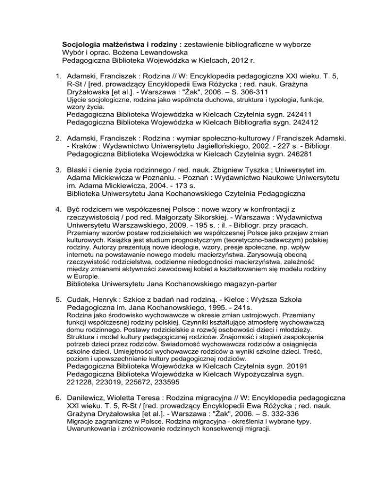 Socjologia małżeństwa i rodziny : zestawienie bibliograficzne w wyborze Wybór i oprac. Bożena Lewandowska Pedagogiczna Biblioteka Wojewódzka w Kielcach, 2012 r. 1. Adamski, Franciszek : Rodzina // W: Encyklopedia pedagogiczna XXI wieku. T. 5, R-St / [red. prowadzący Encyklopedii Ewa Różycka ; red. nauk. Grażyna Dryżałowska [et al.]. - Warszawa : "Żak", 2006. – S. 306-311 Ujęcie socjologiczne, rodzina jako wspólnota duchowa, struktura i typologia, funkcje, wzory życia. Pedagogiczna Biblioteka Wojewódzka w Kielcach Czytelnia sygn. 242411 Pedagogiczna Biblioteka Wojewódzka w Kielcach Bibliografia sygn. 242412 2. Adamski, Franciszek : Rodzina : wymiar społeczno-kulturowy / Franciszek Adamski. - Kraków : Wydawnictwo Uniwersytetu Jagiellońskiego, 2002. - 227 s. - Bibliogr. Pedagogiczna Biblioteka Wojewódzka w Kielcach Czytelnia sygn. 246281 3. Blaski i cienie życia rodzinnego / red. nauk. Zbigniew Tyszka ; Uniwersytet im. Adama Mickiewicza w Poznaniu. - Poznań : Wydawnictwo Naukowe Uniwersytetu im. Adama Mickiewicza, 2004. - 173 s. Biblioteka Uniwersytetu Jana Kochanowskiego Czytelnia Pedagogiczna 4. Być rodzicem we współczesnej Polsce : nowe wzory w konfrontacji z rzeczywistością / pod red. Małgorzaty Sikorskiej. - Warszawa : Wydawnictwa Uniwersytetu Warszawskiego, 2009. - 195 s. : il. - Bibliogr. przy pracach. Przemiany wzorów postaw rodzicielskich we współczesnej Polsce jako przejaw zmian kulturowych. Książka jest studium prognostycznym (teoretyczno-badawczym) polskiej rodziny. Autorzy prezentują nowe ideologie, wzory, presje społeczne, np. wpływ internetu na powstawanie nowego modelu macierzyństwa. Zarysowują obecną rzeczywistość rodzicielstwa, codzienne niedogodności macierzyństwa, zależność między zmianami aktywności zawodowej kobiet a kształtowaniem się modelu rodziny w Europie. Biblioteka Uniwersytetu Jana Kochanowskiego magazyn-parter 5. Cudak, Henryk : Szkice z badań nad rodziną. - Kielce : Wyższa Szkoła Pedagogiczna im. Jana Kochanowskiego, 1995. - 241s. Rodzina jako środowisko wychowawcze w okresie zmian ustrojowych. Przemiany funkcji współczesnej rodziny polskiej. Czynniki kształtujące atmosferę wychowawczą domu rodzinnego. Postawy rodzicielskie a rozwój osobowości dzieci i młodzieży. Struktura i model kultury pedagogicznej rodziców. Znajomość i stopień zaspokojenia potrzeb dzieci przez rodziców. Świadomość wychowawcza rodziców a osiągnięcia szkolne dzieci. Umiejętności wychowawcze rodziców a wyniki szkolne dzieci. Treść, poziom i upowszechnianie kultury pedagogicznej rodziców. Pedagogiczna Biblioteka Wojewódzka w Kielcach Czytelnia sygn. 20191 Pedagogiczna Biblioteka Wojewódzka w Kielcach Wypożyczalnia sygn. 221228, 223019, 225672, 233595 6. Danilewicz, Wioletta Teresa : Rodzina migracyjna // W: Encyklopedia pedagogiczna XXI wieku. T. 5, R-St / [red. prowadzący Encyklopedii Ewa Różycka ; red. nauk. Grażyna Dryżałowska [et al.]. - Warszawa : "Żak", 2006. – S. 332-336 Migracje zagraniczne w Polsce. Rodzina migracyjna - określenia i wybrane typy. Uwarunkowania i zróżnicowanie rodzinnych konsekwencji migracji. Pedagogiczna Biblioteka Wojewódzka w Kielcach Czytelnia sygn. 242411Pedagogiczna Biblioteka Wojewódzka w Kielcach Bibliografia sygn. 242412 7. Danilewicz, Wioletta Teresa : Sytuacja życiowa dzieci w rodzinach migracyjnych. Białystok : Trans Humana, 2006. - 192 s. : il. Publikacja złożona z 3 części: teoretycznej, metodologicznej i empirycznej. W części pierwszej autorka omawia m.in. historię migracji zagranicznych, ich rodzaje oraz wpływ na rodziny. W drugiej - teoretyczne podstawy badania sytuacji dzieci w rodzinach rozłączonych. W ostatniej prezentuje wyniki badań rodzin: sytuacja społecznoekonomiczna, emocjonalna, szkolna, konsekwencje migracji. Kraków - Biblioteka Główna Uniwersytetu Pedagogicznego Kraków - Biblioteka Jagiellońska i Biblioteka Collegium Medicum Uniwersytetu Jagiellońskiego Kraków - Biblioteka Naukowa Polskiej Akademii Umiejętności i Polskiej Akademii Nauk 8. Dylematy współczesnych rodzin / red. nauk. Anna Michalska. - Poznań : Wydawnictwo Naukowe UAM, 2005. - 277 s. : wykr. Biblioteka Uniwersytetu Jana Kochanowskiego w Kielcach Czytelnia Pedagogiczna 9. Dziecko i rodzina : społeczne powinności opieki i wychowania / pod red. Urszuli Grucy-Miąsik. - Rzeszów : Wydawnictwo Uniwersytetu Rzeszowskiego, 2007. - 213 s., [1] k. tabl. Praca zbiorowa na temat opiekuńczo-wychowawczych funkcji rodziny oraz instytucji wspierających. Wśród przedstawionych zagadnień znajdują się takie, jak: rodzina jako środowisko życia i wychowania, mechanizm przenoszenia zachowań dewiacyjnych w rodzinie, wychowanie moralne, młodzież z upośledzeniem umysłowym a rodzina, ojcostwo, agresja i przemoc w mediach, terapia przez sztukę, placówki socjalizacyjne, dzieci niepełnosprawne intelektualnie w domach dziecka, socjoterapia, szkoły dla rodziców. Kraków - Biblioteka Główna Uniwersytetu Pedagogicznego Kraków - Biblioteka Jagiellońska i Biblioteka Collegium Medicum Uniwersytetu Jagiellońskiego 10. Gruca-Miąsik, Urszula : Rodzina toksyczna // W: Encyklopedia pedagogiczna XXI wieku. T. 5, R-St / [red. prowadzący Encyklopedii Ewa Różycka ; red. nauk. Grażyna Dryżałowska [et al.]. - Warszawa : "Żak", 2006. – S. 351-355 Rodzina dysfunkcjonalna. Toksyczni rodzice. Maltretowanie. Pedagogiczna Biblioteka Wojewódzka w Kielcach Czytelnia sygn. 242411 Pedagogiczna Biblioteka Wojewódzka w Kielcach Bibliografia sygn. 242412 11. Izdebska, Jadwiga : Dom rodzinny postrzegany przez dzieci : w kontekście społeczno-kulturowych zróżnicowań współczesnej rodziny. - Białystok : Trans Humana, 2006. - 144 s. : il. Autorka w części teoretyczno-metodologicznej oraz empirycznej przedstawia badania nad domem rodzinnym: definicje, teorie rodziny i dzieciństwa, prawa dziecka i potrzeby ludzkie. W badaniach wykorzystuje techniki projekcyjne i wytw