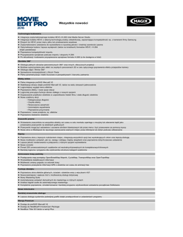 Wszystkie nowości Technologia kodowania ➤ Integracja zoptymalizowanego kodeka HEVC-/H.265 Intel Media Server Studio ➤ Integracja kodeka HEVC z własną technologią analizy składnikowej, zapewniająca kompatybilność np. z kamerami firmy Samsung ➤ Eksport do HEVC przez menu pliku lub przetwarzanie wsadowe ➤ Zoptymalizowane ustawienia do wyświetlania w wysokiej jakości i średniej szerokości pasma ➤ Optymalizacja kodera i lepsza wydajność (także na ścieżkach) formatów HEVC i H.264 dzięki paralelizacji ➤ Poprawiona kompatybilność importu ➤ Przyspieszenie sprzętowe podczas importu i eksportu H.264 ➤ Po aktualizacji: kodowanie przyspieszone sprzętowo formatu H.265 (o ile dostępne w Intel) Obróbka 360° ➤ Obsługa pełnych obrazów panoramicznych 360° oraz innych, sferycznych projekcji ➤ Możliwe wykorzystanie jako efekt na zwykłych panoramach 2D w celu optycznego poprawienia efektu przejazdów kamery ➤ Obsługa zdjęć i filmów 360° ➤ Sprawdzona kompatybilność z Ricoh Theta ➤ Pełna parametryzacja i klatki kluczowe w perspektywach i kierunku patrzenia Efekty wideo ➤ Pełna integracja proDAD Mercalli V2 ➤ Stabilizacja obrazu dzięki proDAD Mercalli V2, także na wielu obrazach jednocześnie ➤ Logiczniejszy wygląd menu efektów ➤ Poprawione efekty i nowe opcje edycji ➤ Logiczniej pracująca funkcja obrazu stałego z nowymi opcjami ➤ Dopasowanie prędkości obiektów w częstotliwości klatek filmu i stała długość obiektów ➤ Nowe szablony akcji • Kategoryzacja długości • Zwykłe efekty • Nowoczesna zawartość • Automatyka wypełniania • Poprawione przycinanie ➤ Poprawione i nowe przejścia, np. efektów ➤ Poprawione śledzenie obiektów Znaczniki przerw ➤ Wstawianie znaczników na wszystkie obiekty osi czasu w celu montażu opartego o muzykę lub zdarzenie bądź jako uniwersalne przerywniki na obiektach graficznych ➤ Przerywniki mogą być wstawiane i usuwane skrótem klawiszowym lub przez menu i być przesuwane za pomocą myszy ➤ Nowe okno w Mediapool do ręcznego zaznaczania ważnych miejsc przez kliknięcie lub dotyk podczas odtwarzania Napisy ➤ Poprawione okno z lepszym rozłożeniem miejsc, integracją wszystkich opcji bez wyskakujących okien oraz lepszą obsługą ➤ Nowe możliwości ustawień, jak np. zasięg i odstępy między akapitami oraz poprawione dotychczasowe ustawienia ➤ Lepsza jakość renderowania w połączeniu z różnymi opcjami wyświetlania ➤ Nowe czcionki ➤ Ponad 250 unowocześnionych szablonów od neutralnych/poważnych do kompleksowych/kinowych ➤ Bardziej logiczna i przyjazna dla użytkownika struktura kategorii szablonów Animowane trasy podróży ➤ Przełączanie map pomiędzy OpenStreetMap Mapnik, CycleMap, TransportMap oraz OpenTopoMap ➤ Wyświetlanie dodatkowych informacji ➤ Możliwość zmiany pojazdu co odcinek trasy ➤ Poprawione przesyłanie informacji GPS z obiektów osi czasu do animacji tras Funkcje dźwięku ➤ Poprawione okna efektów głównych, ścieżek i obiektów wraz z wtyczkami VST ➤ Nowocześniejsze i większe GUI z możliwością obsługi dotykowej ➤ Nowy Mastering Suite ➤ Automatyzacja ustawień domyślnych do masteringu w różnych stylach ➤ Analiza nagrań audio do automatycznego masteringu ➤ Kompletnie poprawione, zmodernizowane i bardziej przyjazne użytkownikowi ustawienia początkowe DeNoisera Nowe intro/outro Bardziej zrozumiała obsługa ➤ Lepsza obsługa systemów podwójnej grafiki dzięki przełącznikowi w ustawieniach programu Wersja Premium ➤ Dostęp do proDAD Mercalli V4 ➤ Dostęp do NewBlueFX ActionCam Package ➤ NewBlue Titler EX także w wersji Plus