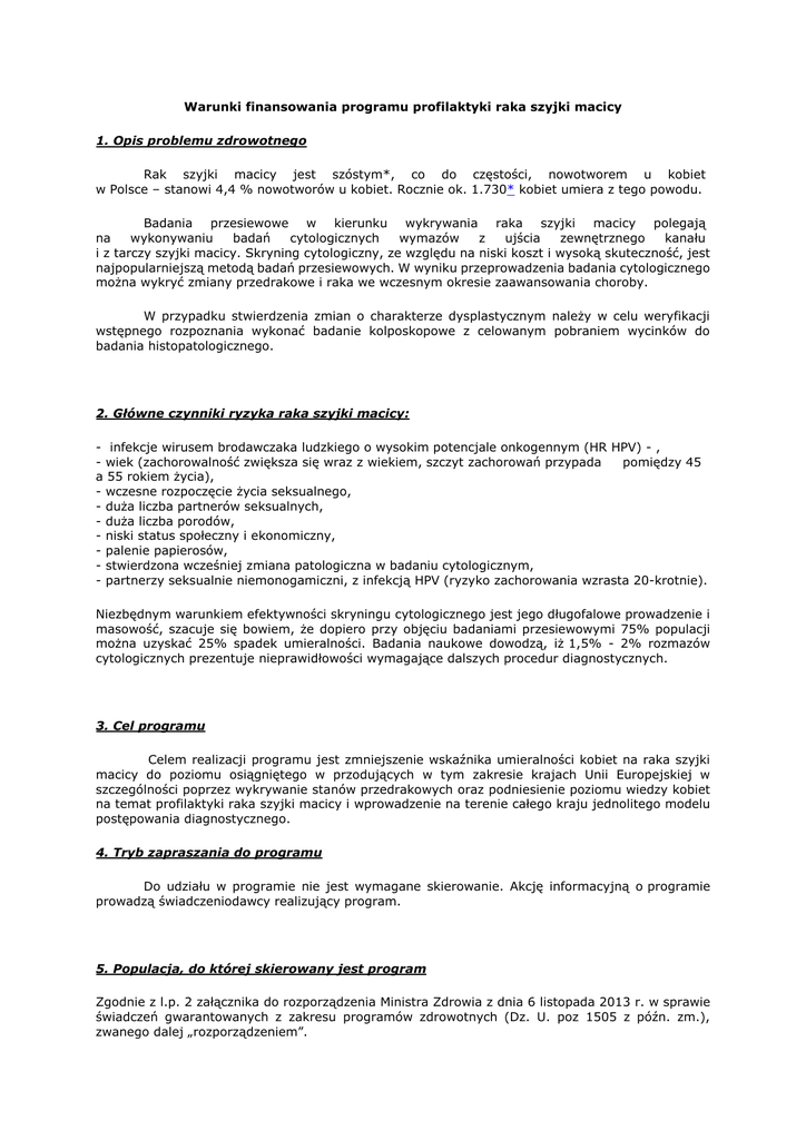 Warunki finansowania programu profilaktyki raka szyjki macicy 1. Opis problemu zdrowotnego Rak szyjki macicy jest szóstym*, co do częstości, nowotworem u kobiet w Polsce – stanowi 4,4 % nowotworów u kobiet. Rocznie ok. 1.730* kobiet umiera z tego powodu. Badania przesiewowe w kierunku wykrywania raka szyjki macicy polegają na wykonywaniu badań cytologicznych wymazów z ujścia zewnętrznego kanału i z tarczy szyjki macicy. Skryning cytologiczny, ze względu na niski koszt i wysoką skuteczność, jest najpopularniejszą metodą badań przesiewowych. W wyniku przeprowadzenia badania cytologicznego można wykryć zmiany przedrakowe i raka we wczesnym okresie zaawansowania choroby. W przypadku stwierdzenia zmian o charakterze dysplastycznym należy w celu weryfikacji wstępnego rozpoznania wykonać badanie kolposkopowe z celowanym pobraniem wycinków do badania histopatologicznego. 2. Główne czynniki ryzyka raka szyjki macicy: - infekcje wirusem brodawczaka ludzkiego o wysokim potencjale onkogennym (HR HPV) - , - wiek (zachorowalność zwiększa się wraz z wiekiem, szczyt zachorowań przypada pomiędzy 45 a 55 rokiem życia), - wczesne rozpoczęcie życia seksualnego, - duża liczba partnerów seksualnych, - duża liczba porodów, - niski status społeczny i ekonomiczny, - palenie papierosów, - stwierdzona wcześniej zmiana patologiczna w badaniu cytologicznym, - partnerzy seksualnie niemonogamiczni, z infekcją HPV (ryzyko zachorowania wzrasta 20-krotnie). Niezbędnym warunkiem efektywności skryningu cytologicznego jest jego długofalowe prowadzenie i masowość, szacuje się bowiem, że dopiero przy objęciu badaniami przesiewowymi 75% populacji można uzyskać 25% spadek umieralności. Badania naukowe dowodzą, iż 1,5% - 2% rozmazów cytologicznych prezentuje nieprawidłowości wymagające dalszych procedur diagnostycznych. 3. Cel programu Celem realizacji programu jest zmniejszenie wskaźnika umieralności kobiet na raka szyjki macicy do poziomu osiągniętego w przodujących w tym zakresie krajach Unii Europejskiej w szczególności poprzez wykrywanie stanów przedrakowych oraz podniesienie poziomu wiedzy kobiet na temat profilaktyki raka szyjki macicy i wprowadzenie na terenie całego kraju jednolitego modelu postępowania diagnostycznego. 4. Tryb zapraszania do programu Do udziału w programie nie jest wymagane skierowanie. Akcję informacyjną o programie prowadzą świadczeniodawcy realizujący program. 5. Populacja, do której skierowany jest program Zgodnie z l.p. 2 załącznika do rozporządzenia Ministra Zdrowia z dnia 6 listopada 2013 r. w sprawie świadczeń gwarantowanych z zakresu programów zdrowotnych (Dz. U. poz 1505 z późn. zm.), zwanego dalej „rozporządzeniem”. 6. Warunki finansowania świadczeń w poszczególnych etapach realizacji programu Świadczeniodawca obowiązany jest posiadać dostęp do internetu umożliwiający prowadzenie elektronicznej sprawozdawczości realizacji Programu w oparciu o narzędzie informatyczne udostępnione przez Narodowy Fundusz Zdrowia. Etap podstawowy Pobranie materiału do przesiewowego badania cytologicznego (etap podstawowy programu profilaktyki raka szyjki macicy) jest realizowane w ramach: a) ambulatoryjnej opieki specjalistycznej w zakresie położnictwa i ginekologii, jako porada z katalogu specjalistycznych świadczeń odrębnych, b) podstawowej opieki zdrowotnej przez położną POZ. Warunki pobierania wymazu opisane są w rozporządzeniu, a zakres finansowania etapu podstawowego programu określono: a) w załączniku nr 5b do obowiązującego zarządzenia Prezesa Narodowego Funduszu Zdrowia w sprawie określenia warunków zawierania i realizacji umów w rodzaju ambulatoryjna opieka specjalistyczna, b) w rozdziale 6 obowiązującego zarządzenia Prezesa Narodowego Funduszu Zdrowia w sprawie warunków zawarcia i realizacji umów o udzielanie świadczeń opieki zdrowotnej w zakresie podstawowej opieki zdrowotnej. Świadczeniodawca obowiązany jest do zarejestrowania świadczeniobiorcy w systemie informatycznym udostępnionym przez Narodowy Fundusz Zdrowia nie później niż w dniu badania. Etap diagnostyczny wykonanie oceny mikroskopowej materiału cytologicznego przesłanego przez realizatora etapu podstawowego programu i jego opisanie w systemie informatycznym udostępnionym przez Narodowy Fundusz Zdrowia w celu prowadzenia elektronicznej sprawozdawczości, w module przypisanym danej pacjentce;<s> </s> 2) przesłanie wyniku do poradni, która pobrała materiał do badania; 3) prowadzenie elektronicznej sprawozdawczości w zakresie badanych kobiet oraz wyników badań cytologicznych w systemie informatycznym udostępnionym przez Narodowy Fundusz Zdrowia; 1) Etap pogłębionej diagnostyki 1) 2) 3) 4) zarejestrowanie (wprowadzenie do bazy danych w systemie informatycznym udostępnionym przez Narodowy Fundusz Zdrowia) kobiety skierowanej do badania w ramach realizacji programu nie później niż w dniu badania; wykonanie badania kolposkopowego; w przypadku zaistnienia wskazań do weryfikacji uzyskanego obrazu kolposkopowego – pobranie celowanych wycinków do badania histopatologicznego; badanie histopatologiczne pobranego w wyniku biopsji materiału; 5) postawienie rozpoznania na podstawie przeprowadzonych badań; 6) podjęcie decyzji dotyczącej dalszego postępowania diagnostyczno – leczniczego do leczenia lub określenie terminu kolejnego badania cytologicznego); 7) 8) (skierowanie w przypadku potwierdzenia nowotworu złośliwego - wystawienie karty diagnostyki i leczenia onkologicznego, w celu realizacji „diagnostyki pogłębionej z zakresu nowotworów macicy;” prowadzenie elektronicznej sprawozdawczości w zakresie badanych kobiet i wyników badań w systemie informatycznym udostępnionym przez Narodowy Fundusz Zdrowia. W celu realizacji programu świadczeniodawca zobowiązany jest do uzyskania od świadczeniobiorcy udokumentowanej zgody, która zapewni możliwość przekazywania w uzasadnionych pr