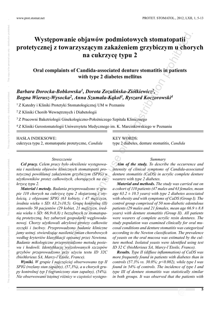 ed . Występowanie objawów podmiotowych stomatopatii protetycznej z towarzyszącym zakażeniem grzybiczym u chorych na cukrzycę typu 2 tio np roh ibit - PROTET. STOMATOL., 2012, LXII, 1, 5-13 Oral complaints of Candida-associated denture stomatitis in patients with type 2 diabetes mellitus Katedry i Kliniki Protetyki Stomatologicznej UM w Poznaniu 2Z Kliniki Chorób Wewnętrznych i Diabetologii 3Z Pracowni Baketriologii Ginekologiczno-Położniczego Szpitala Klinicznego 4Z Kliniki Gerostomatologii Uniwersytetu Medycznego im. K. Marcinkowskiego w Poznaniu -d istr 1Z KEY WORDS: type 2 diabetes, denture stomatitis, Candida Summary Aim of the study. To describe the occurrence and intensity of clinical symptoms of Candida-associated denture stomatitis (CaDS) in acrylic complete denture wearers with type 2 diabetes. Material and methods. The study was carried out on a cohort of 110 patients (47 males and 63 females, mean age 63.2 ± 10.5 years) with type 2 diabetes associated with obesity and with symptoms of CaDS (Group I). The control group comprised of 50 non-diabetic edentulous patients (29 males and 21 females, mean age 66.9 ± 8.8 years) with denture stomatitis (Group II). All patients were wearers of complete acrylic resin dentures. The study population was examined clinically for oral mucosal conditions and denture stomatitis was categorized according to the Newton classification. The prevalence of yeasts on the oral mucosa was estimated by the culture method. Isolated yeasts were identified using test ID 32 C (bioMerieux SA, Marcy-l’Etoile, France). Results. Type II (diffuse inflammation) of CaDS was more frequently found in patients with diabetes than in controls (57.3% vs. 30.0%; p<0.002), while type I was found in 54% of controls. The incidence of type I and type III of denture stomatitis was statistically similar in both groups. It was observed that the patients with is c op y is for pe rs on al us Streszczenie Cel pracy. Celem pracy było określenie występowania i nasilenia objawów klinicznych stomatopatii protetycznej powikłanej zakażeniem grzybiczym (SPIG) u użytkowników protez całkowitych, chorujących na cukrzycę typu 2. Materiał i metody. Badania przeprowadzono w grupie 110 chorych na cukrzycę typu 2 skojarzoną z otyłością, z objawami SPIG (63 kobiety, i 47 mężczyzn, średnia wieku ± SD: 63,2±10,5). Grupę kontrolną (II) stanowiło 50 pacjentów (29 kobiet, 21 mężczyzn, średnia wieku ± SD: 66,9±8,8) z bezzębnych ze stomatopatią protetyczną, bez zaburzeń gospodarki węglowodanowej. Chorzy użytkowali akrylowe protezy całkowite szczęki i żuchwy. Przeprowadzono badanie kliniczne jamy ustnej. stwierdzając nasilenie zmian chorobowych według kryteriów klasyfikacji opisanej przez Newtona. Badanie mikologiczne przeprowadzono metodą posiewu i hodowli. Identyfikację wyizolowanych szczepów grzybów przeprowadzono przy użyciu testu ID 32C (bioMerieux SA, Marcy-l’Etoile, France). Wyniki. W grupie I najczęściej obserwowano typ II SPIG (rozlany stan zapalny), (57,3%), a u chorych grupy kontrolnej typ I (ograniczony stan zapalny), (54%). Nie obserwowano istotnej różnicy w częstości występo- eo nly HASŁA INDEKSOWE: cukrzyca typu 2, stomatopatie protetyczne, Candida Th This copy is for personal use only - distribution prohibited. This copy is for personal use only - distribution prohibited. - ibu Barbara Dorocka-Bobkowska1, Dorota Zozulińska-Ziółkiewicz2, Bogna Wierusz-Wysocka2, Anna Szumała-Kąkol3, Ryszard Koczorowski4 - This copy is for personal use only - distribution prohibited. - This copy is for personal use only - distribution prohibited. www.prot.stomat.net 5 eo nly -d istr ibu tio np roh ibit ed . diabetes were more likely to report oral complaints of CaDS compared with controls (60.9% vs. 24.0%; p<0.001). Burning sensation in the mouth was the most frequent complaint of denture stomatitis in both groups, (51.8% vs. 24.0%; p<0.001). Dryness of the oral mucosa was found to be more frequent in the persons with diabetes (50.9% vs. 6.0%; p<0.001). Additionally, the diabetic patients manifested a significantly greater prevalence of angular cheilitis, (26.4% vs. 8.0%; p<0.01) and glossitis, (27.3% vs. 6.0%; p<0.003). This study indicates that in all diabetic patients denture stomatitis was associated with Candida colonization, (100% vs. 50%; p<0.001). Conclusion. In patients with type 2 diabetes denture stomatitis is more severe and more frequently associated with Candida infection. Diabetic patients show an increased severity of subjective oral complaints, of which burning mouth sensation is most common. al us wania stomatopatii typu III (zapalenie przerostowe) w obu badanych grupach (12,7% vs 16%; NS). Stwierdzono częstsze występowanie objawów podmiotowych stomatopatii u chorych na cukrzycę w porównaniu z grupą kontrolną (60,9% vs 24%; p<0,001). Najczęściej zgłaszanym objawem podmiotowym u chorych w obu badanych grupach było pieczenie błony śluzowej jamy ustnej, przy czym objaw ten występował znacząco częściej u chorych na cukrzycę (51,8% vs 24%; p<0,002). W grupie badanej stwierdzono również znacząco więcej przypadków stomatopatii z objawem suchości błony śluzowej jamy ustnej w porównaniu z grupą kontrolną (50,9% vs 6%; p<0,001). Stwierdzono, iż u chorych grupy I znacząco częściej obserwuje się występowanie objawów towarzyszących stomatopatii: zapalenie kątów ust (26,4% vs 8%; p<0,01), zapalenie języka (27,3% vs 6%; p<0,003). Zakażenie grzybicze występowało znamiennie częściej w przebiegu stomatopatii protetycznej u chorych na cukrzycę w porównaniu z grupą kontrolną, (100% vs 50%; p<0,001). Wnioski. Stomatopatie protetyczne u chorych na cukrzycę typu 2 charakteryzują się cięższym klinicznie przebiegiem i są one częściej powikłane zakażeniem grzybiczym. Stwierdza się nasilenie dolegliwości subiektywnych stomatopatii protetycznej, a pieczenie błony śluzowej jamy ustnej