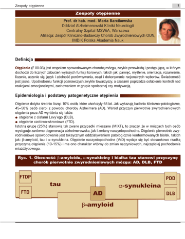 1 Zespo∏y ot´pienne Zespo∏y ot´pienne Prof. dr hab. med. Maria Barcikowska Oddzia∏ Alzheimerowski Kliniki Neurologii Centralny Szpital MSWiA, Warszawa Afiliacja: Zespó∏ Kliniczno-Badawczy Chorób Zwyrodnieniowych OUN, IMDiK Polska Akademia Nauk Definicja Ot´pienie (F 00.03) jest zespo∏em spowodowanym chorobà mózgu, zwykle przewlek∏à i post´pujàcà, w którym dochodzi do licznych zaburzeƒ wy˝szych funkcji korowych, takich jak: pami´ç, myÊlenie, orientacja, rozumienie, liczenie, uczenie si´, j´zyk i zdolnoÊç porównywania, osàd i dokonywanie racjonalnych wyborów. ÂwiadomoÊç jest jasna. UpoÊledzeniu funkcji poznawczych zwykle towarzyszy, a czasami poprzedza os∏abienie kontroli nad reakcjami emocjonalnymi, zachowaniem w grupie spo∏ecznej czy motywacjà. Epidemiologia i podstawy patogenetyczne ot´pienia Ot´pienie dotyka Êrednio liczàc 10% osób, które ukoƒczy∏y 65 lat. Jak wykazujà badania kliniczno-patologiczne, 45–50% osób cierpi z powodu choroby Alzheimera (AD). WÊród przyczyn pierwotnie zwyrodnieniowych ot´pienia poza AD wyró˝nia si´ tak˝e: ● ot´pienie z cia∏ami Levy’ego (DLB), ● ot´pienie czo∏owo-skroniowe (FTD). Istotnà grup´ (25%) stanowià tak zwane przypadki mieszane (MIXT), to znaczy, ˝e w mózgach tych osób wyst´puje zarówno degeneracja alzheimerowska, jak i zmiany naczyniopochodne. Ot´pienie pierwotnie zwyrodnieniowe spowodowanie jest toksycznym oddzia∏ywaniem patologicznie konformowanych bia∏ek, takich jak: β-amyloid, tau i α-synukleina. Ot´pienie naczyniopochodne (VaD) wydaje si´ byç stosunkowo rzadkà przyczynà ot´pienia (10-15%) i ma ono charakter wtórny do zmian naczyniowych, najcz´Êciej pochodzenia mia˝d˝ycowego. Ryc. 1. ObecnoÊç β-amyloidu, α-synukleiny i bia∏ka tau stanowi przyczyn´ chorób pierwotnie zwyrodnieniowych mózgu: AD, DLB, FTD FTDP PDD α-synukleina tau FTD AD β-amyloid DLB 2 Zespo∏y ot´pienne Rozpoznanie wst´pne Rozpoznanie wst´pne ot´pienia obejmuje zazwyczaj Krótkà Skal´ Oceny Stanu Psychicznego i Test Rysowania Zegara, które wykonane razem zwi´kszajà czu∏oÊç badania. Krótka Skala Oceny Stanu Psychicznego (MMSE) Wynik liczbowy okreÊla ogólny poziom mo˝liwoÊci poznawczych osoby badanej. Stanowi on sum´ punktów uzyskanych w próbach oceniajàcych: orientacj´ w czasie i w miejscu, zapami´tywanie trzech wyrazów, uwag´ i liczenie, swobodne odtwarzanie wczeÊniej zapami´tanych wyrazów po krótkim odroczeniu, nazywanie dwóch przedmiotów, wykonywanie poleceƒ s∏ownych, pisanie oraz kopiowanie dwóch przecinajàcych si´ pi´ciokàtów (Folstein i wsp.,1975). Maksimum wynosi 30 punktów. Wynik poni˝ej 24 punktów sugeruje obecnoÊç procesu ot´piennego i wskazuje na koniecznoÊç podj´cia dalszych badaƒ diagnostycznych. Na ostateczny wynik majà wp∏yw wiek i wykszta∏cenie chorego. Test Rysowania Zegara Test Rysowania Zegara polega na rysowaniu zegara wraz ze wskazówkami, wskazujàcymi okreÊlonà godzin´. Analiza rysunków umo˝liwia ocen´ wszystkich procesów wzrokowo-przestrzennych, planowania, myÊlenia abstrakcyjno-poj´ciowego. Ryc. 2. Pacjent z chorobà Alzheimera; wyniki Testu Rysowania Zegara przeprowadzonego w trzech kolejnych latach Ocena kliniczna chorego z ot´pieniem powinna byç wielodyscyplinarna i przeprowadzona pod kàtem internistycznym, neurologicznym oraz psychologicznym i psychiatrycznym. Na wst´pnym etapie nale˝y wykluczyç inne ni˝ pierwotnie zwyrodnieniowe przyczyny demencji: ● guzy i krwiaki, ● nadu˝ywanie alkoholu, ● obecnoÊç choroby nowotworowej, ● wp∏yw leków, ● niedobór witaminy B12, kwasu foliowego, ● niedoczynnoÊç tarczycy, ● infekcj´ wirusem HIV. 3 Zespo∏y ot´pienne ¸agodne zaburzenia poznawcze (MCI) Kryteria diagnostyczne MCI ● skargi na upoÊledzenie pami´ci – preferowany obiektywny wywiad, ● obiektywnie stwierdzone pogorszenie pami´ci lub upoÊledzenie innego obszaru poznawczego poni˝ej wartoÊci odpowiednich dla wieku i wykszta∏cenia, ● prawid∏owe globalne funkcjonowanie poznawcze, ● zasadniczo niezaburzona codzienna aktywnoÊç ˝yciowa, ● brak ot´pienia. MCI ciàgle jeszcze stanowi rozpoznanie kontrowersyjne. Cz´Êç osób z tym rozpoznaniem mo˝e powróciç do normy, cz´Êç pozostanie stabilna, a u cz´Êci wystàpi ot´pienie. Najcz´Êciej jest to AD, lecz i inne choroby zwyrodnieniowe i naczyniopochodne tak˝e mogà byç poprzedzone okresem ∏agodnych, wybiórczych zaburzeƒ poznawczych. Najcz´stszà postacià zaburzeƒ poznawczych sà deficyty w zakresie pami´ci, amnestyczne i te przechodzà najcz´Êciej z czasem w AD. Uwa˝a si´, ˝e rocznie u 12% osób z rozpoznanym MCI wystàpià objawy ot´pienia, a w grupie osób zdrowych nie b´dzie to wi´cej ni˝ 1,5% przypadków. MCI norma stabilne ot´pienie AD VaD DLB FTD Obraz kliniczny Istotà MCI sà skargi na zaburzenia pami´ci zg∏aszane przez pacjenta albo przez jego opiekuna. Nie zawsze muszà to byç jednak wy∏àcznie skargi na deficyt pami´ci. Mogà one dotyczyç tak˝e innych funkcji poznawczych, takich jak: procesy postrzegania i j´zykowe, pami´ç, myÊlenie, funkcje wzrokowo-przestrzenne i wykonawcze, albo mogà to byç zaburzenia zachowania lub nastroju. Te ostatnie cz´Êciej b´dà zg∏aszane przez osob´ bliskà choremu. Podczas badania neuropsychologicznego stwierdza si´ obiektywne zaburzenia w zakresie jednej lub kilku funkcji poznawczych, ale nie stwierdza si´ cech ot´pienia. Chory taki funkcjonuje bez zarzutu w zakresie czynnoÊci dnia codziennego. Niekiedy mo˝e to byç osoba kontynuujàca swoje obowiàzki zawodowe. Tab. 1. Zaburzona jedna funkcja poznawcza, ale nie pami´ç Zaburzona tylko pami´ç Zaburzone wiele funkcji poznawczych FTD, DLB, VD, AD AD VD, AD 4 Zespo∏y ot´pienne Nieprawid∏owoÊci w badaniach pomocniczych W MCI nie ma uznanych wg EBM (ang. Evidence Based Medicine) odchyleƒ w badaniach dodatkowych. Wszystkie znane wyniki czyn