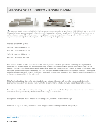 WŁOSKA SOFA LORETO - ROSINI DIVANI Pprezentowana sofa Loreto pochodzi z kolekcji nowoczesnych sof rozkładanych producenta ROSINI DIVANI. Jest to wysokiej klasy sofa, która wyposażona została w funkcję spania. Posiada też rozkładany zagłówek. Do funkcji spania zastosowano w sofie materac o grubości 6 cm. Pod materacem znajduje się bardzo solidny stelaż metalowy, który podzielony został na 3 części. Funkcja spania jest nieodłączną cechą sofy i nie wymaga żadnej dopłaty. Wielkość powierzchni spania: Sofa 181 - materac 103x184 cm Sofa 201 - materac 123x184 cm Sofa 252 - materac 123x184 cm Sofa 272 - materac 123x184cm Sofa posiada miękkie i bardzo wygodne siedzisko, które wykonane zostało w sprawdzonej technologii osobnych poduch posiadających wymienne pokrycie. Elementy te zostały wypełnione doskonałej jakości pianką poliuretanową o podwójnej gęstości. Pianka poliuretanowa zastosowana została także w oparciu i podłokietnikach. Oparcie to pianka o gęstości od 18kg, natomiast podłokietniki 30kg/m3. Wszystkie powyższe elementy posiadają również specjalne włókna akrylowe. Ponadto, aby dodatkowo jeszcze poprawić wygodę siedziska, w konstrukcji wykorzystano elastyczne pasy. Cała konstrukcja sofy częściowo wykonana została z solidnych płyt wiórowych. Mają Państwo tutaj do wyboru kilka rodzajów obicia: dwa rodzaje skór, doskonałą ekoskórę oraz dwa rodzaje tkanin. Zaprezentowane zostały one poniżej. Na indywidualne życzenie klienta udostępniamy też niestandardową kolorystykę. Prezentowany model sofy wyposażony jest w zagłówek o regulowanej wysokości. Dzięki temu mebel można z powodzeniem dostosować do indywidualnych potrzeb użytkowników lub jego zastosowania. Szczegółowe informacje znajdą Państwo w zakładce JAKOŚĆ, KOMFORT oraz KONSERWACJA. Widoczne na zdjęciach kolory materiałów i mebli mogą nieznacznie odbiegać od tych rzeczywistych. ZAWSZE MOGĄ PAŃSTWO POBRAĆ PLIK Z OGLĄDANĄ SOFĄ LUB GO WYDRUKOWAĆ - OPCJE TE DOSTĘPNE SĄ W PRAWYM GÓRNYM ROGU KARTY PRODUKTU 5218.00 zł Waga: 94kg Czas realizacji: towar na zamówienie Opcje sofy Wymiary sofy 84/98 x 102 Rozmiar sofy 181 0.00 zł 201 +1 045.00 zł 252x160 0.00 zł 272x160 0.00 zł Opcje sofy szezlong 0.00 zł Rodzaj wykończenia + wybór koloru Tkanina - gruby splot +302.00 zł Melanż szaro brązowy col. 605 Beżowy col. 400 Biały col. 100 Melanż brązowo czarny col. 403 Szary col. 600 Czarny col. 200 Tkanina- ala' alkantara Arca 0.00 zł Jasno szary col.607 Fuksja col. 912 Szary col. 600 Fiolet col. 002 Beżowy col. 606 Szaro fioletowy jasny col. 706 Ekoskóra Peru +302.00 zł Szaro beżowy col. 29 Kość słoniowa col. 01 Czarny col. 22 Ciemne cappuccino col. 80 Skóra naturalna Toro +1 641.00 zł Biały col. 4007 Kość słoniowa col. 4008 Czerwony col. 4009 Ciemno brązowy col. 4002 Czarny col. 4005 Szary col. 4011 Ciepły szary col. 4013 Skóra naturalna Piuma +2 221.00 zł Biały col. 7000 Beżowy jasny col. 7001 Jasno szary col. 7002 Kość słoniowa col. 7013 Whisky col. 7012 Ciemno czerwony col. 7011 Czarny col. 7004 Ciemny bordo lakierowana col. 693 pino Czerwony col. 2025 toscana Dodatki Rodzaj nóżek Nóżki kwadratowe 0.00 zł Chrom kwadratowe Tkanina- ala' alkantara Arca +3 655.00 zł Fotel Szaro fioletowy jasny col. 706 Fiolet col. 002 Szary col. 600 Fuksja col. 912 Jasno szary col.607 Beżowy col. 606 Ekoskóra Peru +3 869.00 zł Ciemne cappuccino col. 80 Czarny col. 22 Kość słoniowa col. 01 Szaro beżowy col. 29 Skóra naturalna Toro +4 805.00 zł Ciepły szary col. 4013 Szary col. 4011 Biały col. 4007 Czarny col. 4005 Ciemno brązowy col. 4002 Czerwony col. 4009 Kość słoniowa col. 4008 Skóra naturalna Piuma +5 207.00 zł Jasno szary col. 7002 Beżowy jasny col. 7001 Biały col. 7000 Czerwony col. 2025 toscana Ciemny bordo lakierowana col. 693 pino Czarny col. 7004 Ciemno czerwony col. 7011 Whisky col. 7012 Kość słoniowa col. 7013 Tkanina - gruby splot +3 869.00 zł Czarny col. 200 Szary col. 600 Melanż brązowo czarny col. 403 Biały col. 100 Beżowy col. 400 Melanż szaro brązowy col. 605 Tkanina - gruby splot +2 327.00 zł Pufa Czarny col. 200 Szary col. 600 Melanż brązowo czarny col. 403 Biały col. 100 Beżowy col. 400 Melanż szaro brązowy col. 605 Tkanina- ala' alkantara Arca +2 212.00 zł Szaro fioletowy jasny col. 706 Beżowy col. 606 Fiolet col. 002 Szary col. 600 Fuksja col. 912 Jasno szary col.607 Ekoskóra Peru +2 327.00 zł Ciemne cappuccino col. 80 Czarny col. 22 Kość słoniowa col. 01 Szaro beżowy col. 29 Skóra naturalna Toro +3 022.00 zł Ciepły szary col. 4013 Szary col. 4011 Czarny col. 4005 Ciemno brązowy col. 4002 Czerwony col. 4009 Kość słoniowa col. 4008 Biały col. 4007 Skóra naturalna Piuma +3 142.00 zł Czerwony col. 2025 toscana Ciemny bordo lakierowana col. 693 pino Czarny col. 7004 Ciemno czerwony col. 7011 Whisky col. 7012 Kość słoniowa col. 7013 Jasno szary col. 7002 Beżowy jasny col. 7001 Biały col. 7000 Pozostałe Funkcja spania 0.00 zł Zagłówek regulowany 0.00 zł Dodatkowe informacje Ruchomy zagłówek © Copyrights 2012 WloskieSofy.pl | Wszelkie prawa zastrzeżone