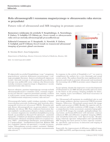 Komentarze redakcyjne Editorials Rola ultrasonografii i rezonansu magnetycznego w obrazowaniu raka stercza w przyszłości Future role of ultrasound and MR imaging in prostate cancer Komentarz redakcyjny do artykułu T. Szopińskiego, A. Nowickiego, F. Zaťury, T. Gołąbka i P. Chłosty pt.: Nowe trendy w obrazowaniu raka stercza metodą ultrasonografii przezodbytniczej Editorial Comment on: T. Szopinski, A. Nowicki, F. Zaťura, T. Gołąbek and P. Chłosta Novel trends in transrectal ultrasound imaging of prostate gland carcinoma B. Nicolas Bloch, Ewa Kuligowska Department of Radiology, Boston University School of Medicine, Boston, MA DOI: 10.15557/JoU.2015.0009 W odpowiedzi na artykuł Szopińskiego i wsp.(1) pragniemy pogratulować autorom dokonania gruntownego i trafnego przeglądu literatury. Autorzy przedstawili najnowsze trendy i kierunki rozwoju w ultrasonografii gruczołu krokowego oraz podkreślili coraz większą rolę obrazowania metodą rezonansu magnetycznego w diagnostyce i ocenie zaawansowania raka stercza. Naszym zdaniem, pomimo imponującego rozwoju technik ultrasonograficznych w ostatnim czasie, rezonans magnetyczny jest obecnie i zapewne pozostanie metodą z wyboru w wykrywaniu, ocenie zaawansowania, aktywnej obserwacji i lokalizowaniu miejscowej wznowy raka stercza(2). Ultrasonografia będzie nadal wiodącą metodą w biopsji transrektalnej gruczołu krokowego pod kontrolą ultrasonografii (transrectal ultrasound, TRUS). Niemniej jednak obrazy ultrasonograficzne są gorszej jakości i mniej dokładne niż obrazy MR. Poza większym kontrastem tkanek miękkich i uzyskiwaniem obrazów o dużej rozdzielczości, rezonans magnetyczny umożliwia kompleksową ocenę tkanek: na przykład na obrazach T2-zależnych – anatomii/ topografii, w badaniu po dożylnym podaniu kontrastu oraz obrazowaniu zależnym od dyfuzji (diffusion-weighted imaging, DWI) – patofizjologii (tkanka/guz, perfuzja/dyfuzja), a w spektroskopii – metabolizmu/cząsteczek. Badanie MR jest względnie zależne od operatora, a wyniki są powtarzalne. Udowodniono wyższą czułość, swoistość i dokładność tej metody w wykrywaniu oraz ocenie zaawansowania raka stercza(3,4). 102 In response to the article of Szopiński et al.(1) we want to compliment the authors for a very thorough and sound review article. The authors listed the most significant developments and trends in prostate ultrasound, and mentioned the increasing role of MRI in prostate cancer diagnosis and staging. In our opinion, despite the impressive recent developments of Ultrasound we see MRI already presently and even more in the future as the primary imaging modality for detection, staging, active surveillance, and local recurrence of prostate cancer(2). Yet, Ultrasound will maintain its established role in real time image guidance during transrectal (TRUS) prostate biopsies. Otherwise, Ultrasound cannot match the image quality and accuracy of MRI. Besides the superior soft tissue contrast and high resolution of MR images, it offers a comprehensive tissue assessment: anatomic/topographical with T2-W images for example, pathophysiologic (tissue/tumor, perfusion/diffusion) with dynamic contrast enhanced MR and diffusion weighted imaging (DWI), and metabolic/molecular with Spectroscopy. Besides being relatively operator independent and reproducible, MR imaging has been proven to have superior sensitivity, specificity, and accuracy in detection and staging of prostate cancer(3,4). Especially the improvement of diffusion weighted imaging (DWI and DTI), and Spectroscopy make MRI the most J Ultrason 2015; 15 (60) Journal of Ulttrasonograaphy Rezonans magnetyczny, głównie dzięki rozwojowi obrazowania dyfuzyjnego (DWI i obrazowania tensora dyfuzji (diffusion tensor imaging, DTI) oraz spektroskopii, jest najbardziej użyteczną i wszechstronną metodą obrazowania raka stercza. Świadczy o tym coraz większa liczba badań MR gruczołu krokowego w ostatniej dekadzie wykonywanych na podstawie skierowań wystawionych przez urologów i innych klinicystów, której roczny wzrost w Stanach Zjednoczonych w okresie ostatnich 4 lat wynosi 7% (obserwuje się największy przyrost liczby badań gruczołu krokowego wśród wszystkich badań MR). W dobie powszechnego dostępu do Internetu i do wiedzy medycznej na temat leczenia chorób dobrze poinformowani chorzy coraz częściej sami zgłaszają się na badania MR, zwłaszcza przed powtórną biopsją. Zwiększone zapotrzebowanie na badania MR gruczołu krokowego prowadzi do obniżenia kosztów tych badań, co w konsekwencji spowoduje, że chorzy będą częściej kierowani na nie. Chociaż koszty badań MR obniżają się, nigdy nie będą tak niskie, jak badań ultrasonograficznych. Dlatego uważamy, że w przyszłości standardem postępowania będzie biopsja pod kontrolą TRUS, skorelowana z obrazem MR i ultrasonograficznym. Biopsja pod kontrolą rezonansu magnetycznego, jako że pod względem wartości diagnostycznej jest porównywalna do biopsji pod kontrolą TRUS, ale okazuje się droższa i bardziej czasochłonna, będzie A powerful and comprehensive imaging modality for prostate cancer. This is reflected in the increasing number of referrals by urologists and other clinicians over the last 10 years, with a +7% increase in prostate MRI exams per year in the US over the last 4 years (making prostate MR the fastest growing MR exam). In the age of widely accessible internet and public medical knowledge about proper management of disease, well informed patients more and more themselves request prostate MRI, especially before repeat biopsies. The increasing demand of prostate MR results in decrease of costs and will consequently further increase the numbers of referrals to MR. Although the costs for MR will further decline, MR will never be as inexpensive as ultrasound. Therefore, we see the role of ultrasound in TRUS guided biopsies, with MRI/ US image fusion, as the future standard of care. MR-guided