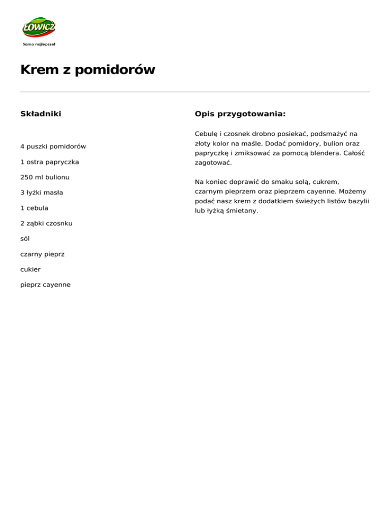 Krem z pomidorów Składniki Opis przygotowania: Cebulę i czosnek drobno posiekać, podsmażyć na 4 puszki pomidorów 1 ostra papryczka 250 ml bulionu 3 łyżki masła 1 cebula 2 ząbki czosnku sól czarny pieprz cukier pieprz cayenne złoty kolor na maśle. Dodać pomidory, bulion oraz papryczkę i zmiksować za pomocą blendera. Całość zagotować. Na koniec doprawić do smaku solą, cukrem, czarnym pieprzem oraz pieprzem cayenne. Możemy podać nasz krem z dodatkiem świeżych listów bazylii lub łyżką śmietany. Powered by TCPDF (www.tcpdf.org)