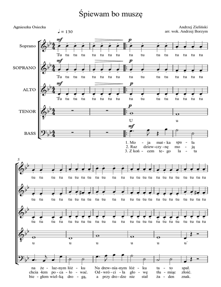 Śpiewam bo muszę Andrzej Zieliński arr. wok. Andrzej Borzym Agnieszka Osiecka q = 130 Soprano ° b 4 mf. . . . &b 4 œ œ œ œ Tu tu tu tu mf b4 & b 4 œ. œ. œ. œ. SOPRANO Tu tu tu tu b 4 mf b & 4œ œ œ œ . . . . ALTO Tu tu tu tu BASS ¢ œ. œ. œ. tu tu tu tu tu tu tu tu tu tu tu œ. œ. œ. œ. ™™ œ. œ. œ. œ. œ. œ. œ. œ. tu tu tu tu tu tu tu tu tu tu tu œ. œ. œ. œ. œ. œ. œ. tu p tu œ. œ. œ. œ. p ™™ œ. œ. œ. œ. œ. tu tu tu tu tu tu tu tu tu tu tu tu p b4 &b 4 ‹ TENOR .œ œ. œ. œ. ™™ pœ. ∑ ™™ w ∑ w U mf ? bb 4 4 ∑ u œ Œ œ J ™™ œ™ ∑ ˙ ˙ 1. Mo - ja mat - ka spa - ła 2. Raz dziew- czy - nę mo - ją 3. Z koń - cem te - go la ta 5 ° bb & œ. œ. tu tu b &b œ œ . . b b & . . œ. œ. œ. œ. œ. œ. œ œ œ. œ. œ. œ. œ. œ. œ œ œ œ œ. œ. œ. œ. . . . . tu tu tu tu tu tu tu tu tu œ. œ. œ. œ. #œ. œ. œ. œ. tu tu tu tu œ. œ. tu tu œ. œ. œ. œ. œ. œ. œ. œ. tu tu tu tu tu tu tu tu b b & w ‹ u tu tu tu tu tu tu w u ? b œ™ j œ œ ˙ œ ¢ b ˙ na że - laz -nym łóż - ku chcia -łem po - ca - ło - wać. bie - głem wiel - ką dro - gą, tu tu tu tu tu tu tu tu tu tu tu tu tu œ. œ. œ. œ. œ. œ. œ œ œ œ œ. œ. #œ. œ. . . . . tu tu tu tu tu tu tu tu tu tu tu tu tu tu œ. œ. œ. œ. œ. œ. œ. œ. œ. œ. œ. œ. œ. œ. tu tu tu tu tu tu tu tu tu tu tu tu tu tu w w w œ u u u u` œ™ œ œ œ ˙ J ˙ Na drew- nia -nym łóż - ku Od - wró - ci - ła gło - wę a przy dro - dze nie stał ˙ ˙ ta - to tłu - miąc ża - den Œ Ó œ Œ Ó spał. złość. znak. 2 11 ° bb mf & ˙ a mf b & b n˙ b &b ˙ b &b œ™ ‹ 1. Nam ˙ ˙ ˙ ˙ ˙ ˙ a a a a a a a ˙ ˙ ˙ ˙ ˙ n˙ a a a a a a a ˙ ˙ ˙ ˙ n˙ ˙ ˙ a a a a a a a ˙ a mf a f ˙ œ œ J œ œ œ œ da - wa - li 2. Po - wie - dzia - ła 3. Po - myś - la - łem f ? bb œ ™ ¢ Tumm œ™ œJ nœ Œ chle - ba ty - lko: so - bie: le - dwie po "Le - piej mnie "Da - lej iść j ™ œ œœœœ œ j œœœ œ tum tu tu tu tumm tumm tum tu tumm œ nœ œ œ Œ o - kru szku, od - pro - wadź, nie mo - gę..." j œ™ œ œ nœ œ œ œ™ œJ œ œ œ tum tum tu tumm tu tu tu tumm 15 ° bb ˙ & ˙ ˙ ˙ n˙ ˙ ˙™ a a a a a a a b &b ˙ ˙ ˙ ˙ ˙ ˙ #˙ ™ a a a a a a a b &b ˙ ˙ ˙ ˙ ˙ ˙ œ œœœœœœœ a a a a a a œ œ ˙ n˙ œ wie - lki na mnie wa - dził wi in le b œ œ & b œ ™ œJ ‹ a na dwo - rze w do - mu cze - ka lecz mnie wy - pro - - Œ wia œ che - er ny śny œ - Œ - Ó wiał ktoś!" ptak. ? bb œ ™ œj œ œ œ œ œ œ œ œ œ#œ œ œ œ œ œ œ œ ˙ ™ ¢ œ#œ œ œ œ œ œ œ œ ˙ ™ Tumm tum Œ tum tu tum tumtu tu tu tu tu tum tu tu tu tu tu tu tmmm Œ 3 19 ° bb & ∑ b &b f # Œ >œ pa f # Œ ∑ Œ Œ >œ 3 - 3 - b &b ‹ 3 - pa # Œ ∑ Œ f 3 3 da da da da da da da da da da da da pa œ> Œ >œ pa pa pa >œ Œ pa >œ pa œœœ Ó - ry ry ry 3 3 j j j 3 j j œ œ œ œ œ œ œ ‰ œ œ‰ œ ‰ œ ‰ œ J . J œ. œ œ œ. œ œ j ? bb œ œ œ œ œ œ œ œ œ œ œ œ # œ ¢ œ œ œ œ œ œ œ œ œ œ œ œ œ. 3 Œ >œ ‰ ™ œr œ œ œ œ f 3 Œ >œ I od tej po I do tej po I do tej po p pa pa ‰ >œ ał - œ Œ œ > > f # j œœœœœœœœœœœœ œ 3 Œ pa pa b &b >œ 3 pap pa pa rap pa pa pap pa pa rap pa pa 22 ° #œœ œ œ w & Œ >œ pa a # & œœœ œ ˙ a a a a ˙ & œœœ œ w a a a a a Œ Œ Œ >œ Œ œ >pa œ >pa œ Œ œ > > pa Œ pa j 3 œ3 œ Œ œ œ œ œ J J Œ Œ pa œ> Œ >œ pa pa œ >pa Œ œ >pa œœ ‰ Ó J za pół ki - lo gru - szek, choć mam cho rą du - szę za pół ki - lo gru - szek, 3 3 3 ? # œ œ œ #œ œ. ‰ œ j œ ‰ j œ j œ J œ œ ¢ J a Œ œ > 3 #œ œ œ œ ˙™ & ‹ a a a >œ pa pa a # a Œ pap pa ra rap pa pap pa œj ‰ œ3 œ œ. J pap pa œj ‰ œ3 œ œ. J parap pa pa j 3j j 3j œ‰œœœ‰œœ œ. œ œ œ. œ œ pap pa pa rap pa pa 4 26 ° #œ œ œ œ & mf w w a # & œ œ œ œ a a a a a a a ˙ w w a a mf a w w w a a #œ œ œ œ & ‹ a ˙™ ? # œ œ œ #œ ¢ a a a a ˙ a za dwa choć mnie za dwa 3 3 3 œ. ‰ œ œj œ ‰ œj œ bœ J J J pap pa ra rap pa pap pa œ Œ a ry li ry j œ™ œ œ œ œ œ œ ™ j œ œœœœ da da da da da da da da Ó w w u Ó w w a a mp # ¢ œ Œ ˙ & ˙ & ˙ ˙ a a # ?# - mp # & ‹ po - mi - do ser - ce bo po - mi - do Œ mp a a a œ™ œJ œ œ œ œ œ œ œJ œ ™ Œ 30 ° #w & a a mf # & œ œ œ œ w œ Œ Ó a ∑ w w f ∑ >œ œ™ œ œ œ œ œ™ œ œ Œ ‰J JŒ śpie - wam, j j œ ‰ œœœœ œ œ œ™ œ œ œ œ œ . da da da da da ta ta ta ta ta tam bo mu - szę >œ. . >œ ™ Œ œ œ œ œ. J tam pa ta ta ‰ œJ tam ta bo œœœ ta ta 5 34 ° # & ˙ œ™ œ. œ. œ. œ. ‰ mp J w J f Ó f # & ˙ Ó & ˙ # œ œ ‰Ó & J ‹ mu-szę ¢ ?# ˙ tammm >œ. ∑ w j œ œ œ™ œ œ œ œ pa ta ta tam ta ta ta ta f Ó Ó ˙ œ œ ™ œœ Œ ‰ œ œ œ ‰ Ó œ œ œ J J J bo mu - szę śpie-wam, bo mu - szę >œ. . >œ ™ ‰ ‰ œ œ œ™ J œ J tam pa œœœ ta ta tam ta >œ. ˙ ta ta tammm w ˙ w ˙ œœ pa ta ta Ó mp # œ™ œ. œ œ. ‰ œ & w J . . J f Ó >œ >œ J ˙ œ œ œ œ œœœ J ‰ œJ œJ œ ‰ Ó bo mu - szę śpie- wam, bo mu- szę ? # œ™ œj œ œ œ ¢ tam ta ta ta ta >œ . >œ ™ ‰ ‰ œ œ J œ J œ™ tam pa ta ta tam ta Ó ss. ∑ w gli # Ó mp j & œ ™ œj œ. œ. œ. ‰ w . & ‹ ˙ 3 Ó 39 ° # fœ™ œ. œ. œ. œ. ‰ mp w & J J # w Ó mp j œ ™ œj œ. œ. œ. ‰ w . Ó ˙ mp œ™ œ. œ œ œ. ‰ w J . .J f # w œœœ ta ta ˙ tammm >œ. œœ pa ta ta 6 43 mf ° # ˙™ & # 1.2. œgliss.bb w œ œ œ œ œœ Œœ Óœ œ ™™ w . . . . . . . . mf bb w œ œ . . mf # b b & ˙™ œ gliss. w œ œ . . # Œ ™ œ œ œ Œ bb & J ‹ bo mu - szę & w ? # œ™ œj œ œ œ ¢ tam 3. ta ta ta ta bb w Œ Ó œ œ œ œ œ œ œ . . . . . . Œ Ó œ œ œœ œ œ œ . . . . . . ∑ ∑ w ™™ w w ™™ w w ™™ p ∑ Œ ™ ¿j ¿ ¿ bo mu- szę ∑ ™™ w w