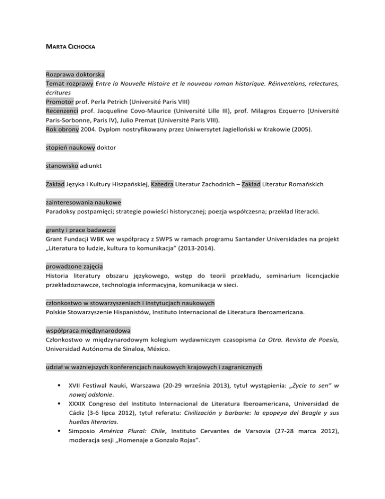 MARTA CICHOCKA Rozprawa doktorska Temat rozprawy Entre la Nouvelle Histoire et le nouveau roman historique. Réinventions, relectures, écritures Promotor prof. Perla Petrich (Université Paris VIII) Recenzenci prof. Jacqueline Covo-‐Maurice (Université Lille III), prof. Milagros Ezquerro (Université Paris-‐Sorbonne, Paris IV), Julio Premat (Université Paris VIII). Rok obrony 2004. Dyplom nostryfikowany przez Uniwersytet Jagielloński w Krakowie (2005). stopień naukowy doktor stanowisko adiunkt Zakład Języka i Kultury Hiszpańskiej, Katedra Literatur Zachodnich – Zakład Literatur Romańskich zainteresowania naukowe Paradoksy postpamięci; strategie powieści historycznej; poezja współczesna; przekład literacki. granty i prace badawcze Grant Fundacji WBK we współpracy z SWPS w ramach programu Santander Universidades na projekt „Literatura to ludzie, kultura to komunikacja” (2013-‐2014). prowadzone zajęcia Historia literatury obszaru językowego, wstęp do teorii przekładu, seminarium licencjackie przekładoznawcze, technologia informacyjna, komunikacja w sieci. członkostwo w stowarzyszeniach i instytucjach naukowych Polskie Stowarzyszenie Hispanistów, Instituto Internacional de Literatura Iberoamericana. współpraca międzynarodowa Członkostwo w międzynarodowym kolegium wydawniczym czasopisma La Otra. Revista de Poesía, Universidad Autónoma de Sinaloa, México. udział w ważniejszych konferencjach naukowych krajowych i zagranicznych § XVII Festiwal Nauki, Warszawa (20-‐29 września 2013), tytuł wystąpienia: „Życie to sen” w nowej odsłonie. § XXXIX Congreso del Instituto Internacional de Literatura Iberoamericana, Universidad de Cádiz (3-‐6 lipca 2012), tytuł referatu: Civilización y barbarie: la epopeya del Beagle y sus huellas literarias. § Simposio América Plural: Chile, Instituto Cervantes de Varsovia (27-‐28 marca 2012), moderacja sesji „Homenaje a Gonzalo Rojas”. § § § § § § § § § § § § § § 3er Simposio Internacional “La percepción del tempo en lingua y literatura”, Uniwersytet Lublański, Ljubljana, (24-‐26 listopada 2011), tytuł referatu: Algunas estrategias de la novela histórica contemporánea – desde un rompecabezas temporal hacia una dimensión intrahistórica. Simposio América Plural. México, Instituto Cervantes de Varsovia (11 kwietnia 2011), moderacja sesji: „Poesía y traducción”. XV Encuentro Internacional de Escritores, Monterrey, „Poéticas de la muerte”, na zaproszenie CONARTE (30 września – 2 października 2010), tytuł referatu: Del efecto de Sylvia Plath y otros demonios. 29th Annual Cincinnati Conference on Romance Languages and Literatures; USA, Cincinnati, Department of Romance Languages and Literatures, University of Cincinnati (7-‐9 maja 2009), tytuł referatu: Narraciones del nazismo : Abel Posse y Jonathan Littel entre la historia y el mito. II Coloquio Internacional „Historia y Literatura“, Guanajuato, México (1-‐3 października 2008), tytuł referatu: De los campos de concentración a los monasterios budistas: la novela histórica contemporánea entre la historia y el mito. Kongres "Discurso sobre fronteras – fronteras del discurso: literatura, pensamiento y cultura del ámbito ibérico e iberoamericano"; Poznań, Uniwersytet Adama Mickiewicza (22-‐24 listopada 2007), tytuł referatu: Del paratexto al texto: el caso de la nueva novela histórica. Konferencja "Représentation de l'Amérindien dans les arts et la littérature d'Amérique Latine" ; Francja, Metz, Université Paul Verlaine (16-‐17 listopada 2007), tytuł referatu: En marge de l'historiographie traditionnelle – ou ce que Charles Darwin a en commun avec un Indien acheté pour quelques boutons de nacre. Międzynarodowy kongres hispanistów, organizowany przez Asociación Internacional de Hispanistas; Francja, Paryż, Centre Malesherbes – Université Paris IV (9 – 13 lipca 2007), tytuł referatu: Entre la nouvelle histoire et le nouveau roman historique (prezentacja publikacji dla członków międzynarodowej grupy badawczej G.R.A.L.H.I.M.). Udział w sesji naukowej na Sorbonie (10 grudnia 2004), na zaproszenie uczestników międzynarodowej grupy badawczej SAL pod kierownictwem prof. Milagros Ezquerro, tytuł referatu: Le paratexte dans le nouveau roman historique latino-‐américain. Konferencja międzynarodowa "L'écrivain argentin et la tradition", Université de Lorient (13-‐ 15 marca 2003), tytuł referatu: «Hay que decir también el silencio»: sobre la „Poesía Vertical” de Roberto Juarroz. Konferencja międzynarodowa, "Literatura y migración en el mundo hispánico", Université de Neufchâtel (11-‐13 marca 2002), tytuł referatu: Migración y mestizaje en la nueva novela histórica hispanoamericana. "Les Rencontres Doctorales", Instytut Filologii Romańskiej Uniwersytetu Jagiellońskiego (2001), tytuł referatu: Entre la nouvelle histoire et le nouveau roman historique: relectures, réinventions, écritures. 50 Congreso Internacional de Americanistas, CESLA, Uniwersytet Warszawski (2000), tytuł referatu: La Poesía Vertical de Roberto Juarroz. Sesja naukowa GRALHIM "Migrations: la perception de l'Autre", Université Paris VIII (2000), tytuł referatu: Les Polonais en Amérique Latine: autre regard. § § "Roman de l'historie dans l'histoire du roman", sesja naukowa na Uniwersytecie Śląskim (1999), tytuł referatu (wspólnie z Ryszardem Siwkiem): Entre l’histoire et la légende: « La légende d’Ulenspiegel » de Charles De Coster et « Terra Nostra » de Carlos Fuentes. "Histoire et mémoire des migrations en Amérique Latine", sesja naukowa GRALHIM, Université Paris VIII (1999), tytuł referatu: Le nouveau roman historique hispano-‐américain: migrations et métissages. nagrody i wyróżnienia Stypendium Ministra Kultury RP (2007) w dziedzinie literatury; Nagroda Rektora Uniwersytetu Pedagogicznego w Krakowie (2008). kontakt UP, Podchorążych 2, pokój 