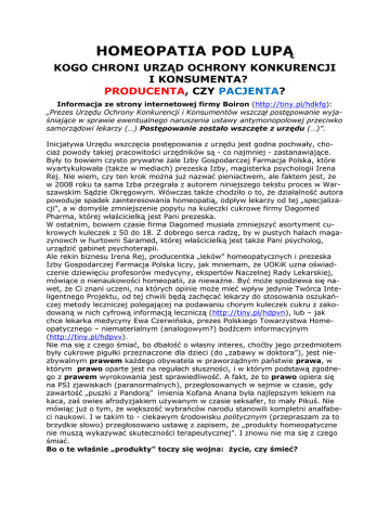 HOMEOPATIA POD LUPĄ KOGO CHRONI URZĄD OCHRONY KONKURENCJI I KONSUMENTA? PRODUCENTA, CZY PACJENTA? Informacja ze strony internetowej firmy Boiron (http://tiny.pl/hdkfg): „Prezes Urzędu Ochrony Konkurencji i Konsumentów wszczął postępowanie wyjaśniające w sprawie ewentualnego naruszenia ustawy antymonopolowej przeciwko samorządowi lekarzy (…) Postępowanie zostało wszczęte z urzędu (…)”. Inicjatywa Urzędu wszczęcia postępowania z urzędu jest godna pochwały, chociaż powody takiej pracowitości urzędników są - co najmniej - zastanawiające. Były to bowiem czysto prywatne żale Izby Gospodarczej Farmacja Polska, które wyartykułowała (także w mediach) prezeska Izby, magisterka psychologii Irena Rej. Nie wiem, czy ten krok można już nazwać pieniactwem, ale faktem jest, że w 2008 roku ta sama Izba przegrała z autorem niniejszego tekstu proces w Warszawskim Sądzie Okręgowym. Wówczas także chodziło o to, że działalność autora powoduje spadek zainteresowania homeopatią, odpływ lekarzy od tej „specjalizacji”, a w domyśle zmniejszenie popytu na kuleczki cukrowe firmy Dagomed Pharma, której właścicielką jest Pani prezeska. W ostatnim, bowiem czasie firma Dagomed musiała zmniejszyć asortyment cukrowych kuleczek z 50 do 18. Z dobrego serca radzę, by w pustych halach magazynowch w hurtowni Saramed, której właścicielką jest także Pani psycholog, urządzić gabinet psychoterapii. Ale rekin biznesu Irena Rej, producentka „leków” homeopatycznych i prezeska Izby Gospodarczej Farmacja Polska liczy, jak mniemam, że UOKiK uzna oświadczenie dziewięciu profesorów medycyny, ekspertów Naczelnej Rady Lekarskiej, mówiące o nienaukowości homeopatii, za nieważne. Być może spodziewa się nawet, że Ci znani uczeni, na których opinie może mieć wpływ jedynie Twórca Inteligentnego Projektu, od tej chwili będą zachęcać lekarzy do stosowania oszukańczej metody leczniczej polegającej na podawaniu chorym kuleczek cukru z zakodowaną w nich cyfrową informacją leczniczą (http://tiny.pl/hdpvn), lub – jak chce lekarka medycyny Ewa Czerwińska, prezes Polskiego Towarzystwa Homeopatycznego – niematerialnym (analogowym?) bodźcem informacyjnym (http://tiny.pl/hdpvv). Nie ma się z czego śmiać, bo dbałość o własny interes, choćby jego przedmiotem były cukrowe pigułki przeznaczone dla dzieci (do „zabawy w doktora”), jest niezbywalnym prawem każdego obywatela w praworządnym państwie prawa, w którym prawo oparte jest na regułach słuszności, i w którym podstawą zgodnego z prawem wyrokowania jest sprawiedliwość. A fakt, że to prawo opiera się na PSI zjawiskach (paranormalnych), przegłosowanych w sejmie w czasie, gdy zawartość „puszki z Pandorą” imienia Kofana Anana była najlepszym lekiem na kaca, zaś owies afrodyzjakiem używanym w czasie seksafer, to mały Pikuś. Nie mówiąc już o tym, że większość wybrańców narodu stanowili kompletni analfabeci naukowi. I w takim to - ciekawym środowisku politycznym (przepraszam za to brzydkie słowo) przegłosowano ustawę z zapisem, że „produkty homeopatyczne nie muszą wykazywać skuteczności terapeutycznej”. I znowu nie ma się z czego śmiać. Bo o te właśnie „produkty” toczy się wojna: życie, czy śmieć? Bitwa toczy się na gruncie prawa (farmaceutycznego). I już nie chodzi o to, że wspomniane prawo jest ciężko upośledzone genetycznie. Że jest kalekie. Bo każdy racjonalnie myślący człowiek (choćby lekarz, nie prawnik) widzi doskonale, że nawet to kalekie prawo jest łamane. I to w taki sposób, że zagraża setkom tysięcy konsumentów. W poniższym piśmie chodzi więc o najszerszy, najbardziej humanitarnie pojęty interes społeczny. Chodzi o to, by każdy obywatel naszego państwa miał równy dostęp do zrozumiałych informacji na temat leków, którymi próbuje ratować swoje zdrowie i życie. A że tak nie jest – przekonają się Państwo sami. A dlaczego ja się tym zajmuję? Bo od wielu lat specjalizuję się w demaskowaniu oszustw leczniczych i mam w tej dziedzinie szeroką wiedzę, utrwaloną ponadto w największej chyba w Polsce komputerowej bazie danych na ten temat. Dowodem są tysiące próśb od zrozpaczonych pacjentów, którzy są kompletnie zdezorientowani sprzecznymi informacjami na temat różnych metod „leczniczych” i „leczniczych” specyfików. Szczegóły wyjaśniam w poniższej, otwartej skardze do Urzędu Ochrony Konkurencji i Konsumenta, która jest niemal wierną kopią listu poleconego wysłanego tamże w dniu 30.03.2011 * * * Pani Małgorzata Krasnodębska-Tomkiel Prezes Urzędu Ochrony Konkurencji i Konsumenta Plac Powstańców Warszawy 1 00-950 Warszawa WNIOSEK/SKARGA Dotyczy: Stosowania praktyk naruszających zbiorowe interesy konsumentów przez polski oddział francuskiej firmy Boiron Sp. z o.o., ul. Raszyńska 13, 05-500 Piaseczno. Uprzejmie proszę Panią prezes o wszczęcie postępowania z urzędu. Mam nadzieję, że zagrożenie zdrowia i życia tysięcy pacjentów jest wystarczającym powodem. Informacje szczegółowe Polski oddział firmy Boiron prowadzi dystrybucję produktu homeopatycznego o nazwie oscillococcinum, który jest powszechnie dostępny na terenie całej Polski. Jest masowo stosowany w różnego rodzaju infekcjach górnych dróg oddechowych, a także, jako środek przeciwgrypowy. Produkt nie wymaga recepty i jest zazwyczaj nabywany bez wcześniejszego badania lekarskiego. Pacjenci polegają w głównej mierze na informacjach, które przekazał im producent na ulotce dołączonej do produktu. Jednak informacje, które dotyczą składu jakościowego i ilościowego produktu, są podane w taki sposób, że wprowadzają konsumentów w błąd. W efekcie pacjenci stosują często oscillococcinum w stanach chorobowych, które wymagają podania lekarstw o zupełnie odmiennym składzie i sposobie oddziaływania na ustrój ludzki. Jako lekarz i naukowiec o ponad 30-letnim doświ