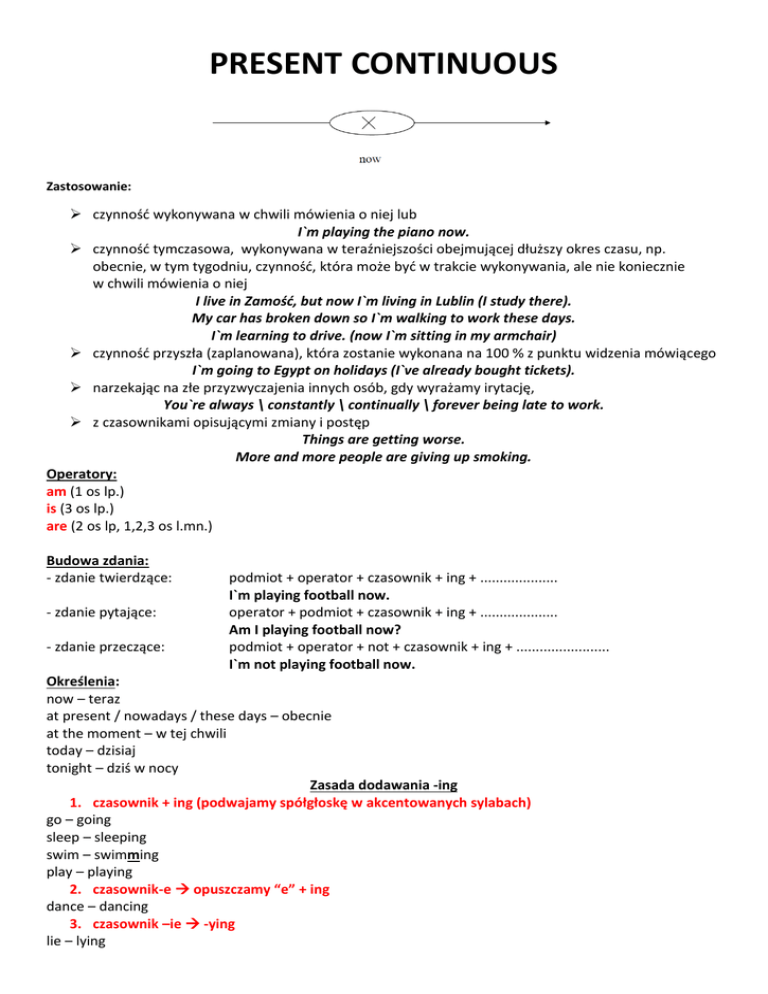 PRESENT CONTINUOUS Zastosowanie: czynność wykonywana w chwili mówienia o niej lub I`m playing the piano now. czynność tymczasowa, wykonywana w teraźniejszości obejmującej dłuższy okres czasu, np. obecnie, w tym tygodniu, czynność, która może być w trakcie wykonywania, ale nie koniecznie w chwili mówienia o niej I live in Zamość, but now I`m living in Lublin (I study there). My car has broken down so I`m walking to work these days. I`m learning to drive. (now I`m sitting in my armchair) czynność przyszła (zaplanowana), która zostanie wykonana na 100 % z punktu widzenia mówiącego I`m going to Egypt on holidays (I`ve already bought tickets). narzekając na złe przyzwyczajenia innych osób, gdy wyrażamy irytację, You`re always \ constantly \ continually \ forever being late to work. z czasownikami opisującymi zmiany i postęp Things are getting worse. More and more people are giving up smoking. Operatory: am (1 os lp.) is (3 os lp.) are (2 os lp, 1,2,3 os l.mn.) Budowa zdania: - zdanie twierdzące: - zdanie pytające: - zdanie przeczące: podmiot + operator + czasownik + ing + .................... I`m playing football now. operator + podmiot + czasownik + ing + .................... Am I playing football now? podmiot + operator + not + czasownik + ing + ........................ I`m not playing football now. Określenia: now – teraz at present / nowadays / these days – obecnie at the moment – w tej chwili today – dzisiaj tonight – dziś w nocy Zasada dodawania -ing 1. czasownik + ing (podwajamy spółgłoskę w akcentowanych sylabach) go – going sleep – sleeping swim – swimming play – playing 2. czasownik-e opuszczamy “e” + ing dance – dancing 3. czasownik –ie -ying lie – lying Czasowniki statywne (stative verbs) normalnie nie posiadają formy czasów Continuous, gdyż odnoszą się do czynności stałej. Należą do nich: czasowniki zmysłów: see, hear, smell, taste, feel, look, sound, seem, appear You look beautiful. You seem tired. czasowniki percepcji: know, believe, understand, realize, remember, forget I don`t know what you mean. czasowniki wyrażające uczucia i emocje: like, love, hate, enjoy, prefer, want Tom loves football. pozostałe: agree, be, believe, belong, consist, contain, doubt, fit, have, know, love, matter, mean, owe, own, prefer, understand, seem, suppose, suspect, want, wish These jeans don`t fit me. !!! UWAGA !!! Niektóre czasowniki mogą wystąpić w czasie Continuous, gdy odnoszą się do czynności, a nie stanu. Następuje wówczas zmiana znaczenia wyrazu. Present Simple Present Continuous She is very polite. jest He is being very naughty today. zachowuje się I think you`re right. sądzę, uważam I`m thinking about going on holidays. rozmyślam They have a Porshe. mają, posiadają We`re having a good time. dobrze się bawimy He`s having a meeting. odbywa I`m having lunch now. jem This dress looks nice on you. wygląda I`m looking at these photos. patrzę I see that you got a nice present. widzę I`m seeing my boyfriend tomorrow. spotykam się I see what you mean. rozumiem This sweater feels like wool. w dotyku jest Tom is feeling the wall to see if the paint is dry. maca, dotyka This soup tastes delicious. smakuje The cook is tasting the soup to see if it`s ok. próbuje, kosztuje Roses smell nice. pachną The dog is smelling his food. wącha She appears to be very happy. wygląda Tom is appearing on stage next Friday. występuje These jeans fit you perfectly. pasują The glazier is fitting new windows today. wstawia !!! UWAGA!!! “enjoy” w Present Simple oznacza ogólną preferencję, a w Continuous, w danej sytuacji I enjoy going to the theatre. (lubię ogólnie) I`m enjoying tonight`s performance. (podoba mi się w danej sytuacji) „feel” – czuć się” „hurt – boleć”, nie ma różnicy w znaczeniu, gdy odnosi się do samopoczucia Tom feels sick = Tom is feeling sick. My tooth hurts = My tooth is hurting. “look” w odniesieniu do wyglądu, nie ma różnicy w znaczeniu You look great today = You`re looking great today.