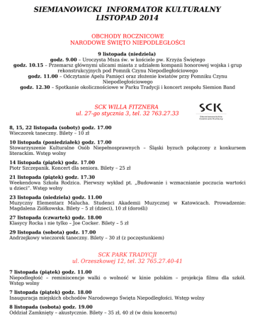 SIEMIANOWICKI INFORMATOR KULTURALNY LISTOPAD 2014 OBCHODY ROCZNICOWE NARODOWE ŚWIĘTO NIEPODLEGŁOŚCI 9 listopada (niedziela) godz. 9.00 – Uroczysta Msza św. w kościele pw. Krzyża Świętego godz. 10.15 – Przemarsz głównymi ulicami miasta z udziałem kompanii honorowej wojska i grup rekonstrukcyjnych pod Pomnik Czynu Niepodległościowego godz. 11.00 – Odczytanie Apelu Pamięci oraz złożenie kwiatów przy Pomniku Czynu Niepodległościowego godz. 12.30 – Spotkanie okolicznościowe w Parku Tradycji i koncert zespołu Siemion Band SCK WILLA FITZNERA ul. 27-go stycznia 3, tel. 32 763.27.33 8, 15, 22 listopada (soboty) godz. 17.00 Wieczorek taneczny. Bilety – 10 zł 10 listopada (poniedziałek) godz. 17.00 Stowarzyszenie Kulturalne Osób Niepełnosprawnych – Śląski byzuch połączony z konkursem literackim. Wstęp wolny 14 listopada (piątek) godz. 17.00 Piotr Szczepanik. Koncert dla seniora. Bilety – 25 zł 21 listopada (piątek) godz. 17.30 Weekendowa Szkoła Rodzica. Pierwszy wykład pt. „Budowanie i wzmacnianie poczucia wartości u dzieci”. Wstęp wolny 23 listopada (niedziela) godz. 11.00 Muzyczny Elementarz Malucha. Studenci Akademii Muzycznej w Katowicach. Prowadzenie: Magdalena Ziółkowska. Bilety – 5 zł (dzieci), 10 zł (dorośli) 27 listopada (czwartek) godz. 18.00 Klasycy Rocka i nie tylko – Joe Cocker. Bilety – 5 zł 29 listopada (sobota) godz. 17.00 Andrzejkowy wieczorek taneczny. Bilety – 30 zł (z poczęstunkiem) SCK PARK TRADYCJI ul. Orzeszkowej 12, tel. 32 765.27.40-41 7 listopada (piątek) godz. 11.00 Niepodległość – reminiscencje walki o wolność w kinie polskim – projekcja filmu dla szkół. Wstęp wolny 7 listopada (piątek) godz. 18.00 Inauguracja miejskich obchodów Narodowego Święta Niepodległości. Wstęp wolny 8 listopada (sobota) godz. 19.00 Oddział Zamknięty – akustycznie. Bilety – 35 zł, 40 zł (w dniu koncertu) 9 listopada (niedziela) godz. 17.00 Teatr DOMINO - „Komisorz Hanusik” oraz „Nietoperek”. Bilety – 10 zł 12 listopada (środa) godz. 18.00 Wernisaż wystawy „Projekt Metropolitanin”. Wstęp wolny 15 listopada (sobota) godz. 18.00 Wieczór z muzyką klasyczną w wykonaniu Wykonawcy: Ewa Jabłczyńska i Dariusz Kupiński Kupinski Guitar Duo – koncert gitarowy. 22 listopada (sobota) godz. 18.00 Wieczór filmowy w kinie MAKS – projekcja filmu „Do szpiku kości” + prelekcja filmoznawcy Adama Andryska. Bilety – 12 zł 23 listopada (niedziela) godz. 9.30 Poranek filmowy w kinie MAKS. Projekcja filmu „Bajki Bolka i Lolka”. Bilety – 8 zł (dzieci), 10 zł (dorośli) 28 listopada (piątek) godz. 18.00 Koncert Doroty Miśkiewicz z gościnnym udziałem Grzegorza Turnaua. Bilety – 40 zł, 45 zł (w dniu koncertu) 29 listopada (sobota) godz. 18.00 ENAMORADA – koncert. Bilety – 40 zł 30 listopada (niedziela) godz. 18.00 Teatr DOMINO – komedia Jana Drdy „Igraszki z diabłem”. Bilety – 10 zł SCK JARZĘBINA – ul. Wierzbowa 2 (tel. 32 228.48.46) 7, 14, 21, 28 listopada (piątki) godz. 17.00 Wieczorek taneczny. Bilety – 5 zł 11 listopada (wtorek) godz. 18.00 Koncert z okazji Narodowego Święta Niepodległości – Katarzyna Wantuła i Marek Przegendza w repertuarze pieśni i piosenek wojskowych. Wstęp wolny 25 listopada (wtorek) godz. 16.00 Byzuch Andrzejkowy. Wstęp wolny 29 listopada (sobota) godz. 18.00 Zabawa Andrzejkowa. Bilety – 60 zł MIEJSKA BIBLIOTEKA PUBLICZNA Al. Sportowców 3, tel. 32 228.13.29 www.mbp.siemianowice.pl 4, 6, 7 listopada (wtorek, czwartek, piątek) godz. 10.00 – FILIA NR 1 (ul. Żeromskiego 13a) „Noddy i przyjaciele” – zajęcia czytelniczo-plastyczne 4 listopada (wtorek) godz. 11.00 – FILIA NR 9 (ul. Powstańców 54a) „Znacie to posłuchajcie” – zajęcia czytelnicze z dziećmi 4, 18 listopada (wtorki) godz. 14.00 – FILIA NR 5 (ul. Sobieskiego 11) „Barwy jesieni” – zajęcia plastyczne dla dzieci 5 listopada (środa) godz. 15.00 – FILIA NR 4 (ul. Szymanowskiego 11) Dzień Postaci z Bajek. Nasi książkowi milusińscy. Spotkanie czytelniczo-literackie 7, 14, 21, 28 listopada (piątki) godz. 10.00-18.00 – ODDZIAŁ DLA DZIECI (Al. Sportowców 3) – Puzzlowe piątki – turniej układania puzzli dla każdego 7 listopada (piątek) godz. 16.00 – FILIA NR 2 (ul. Niepodległości 45) Dyskusyjny Klub Młodych „2/8”. „Patriotyzm czy nacjonalizm?” 12 listopada (środa) godz. 10.00 – FILIA NR 7 (ul. Fojkisa 2) „Magiczne Przygody” – Martyn Beardsley „Sir Galimatias” 12 listopada (środa) godz. 16.00-17.00 – ODDZIAŁ DLA DZIECI (Al. Sportowców 3) Spotkanie Klubu Przyjaciół Pluszowego Misia – zajęcia czytelniczo-plastyczne „Jesienne parasolki” 12, 26 listopada (środy) godz. 16.00 – FILIA NR 9 (ul. Powstańców 54a) Warsztaty decoupage (prosimy o telefoniczną rezerwację pod numerem 32/228.10.16 – ilość miejsc ograniczona) 13 listopada (czwartek) godz. 11.00 – BIBLIOTEKA CENTRALNA (Al. Sportowców 3) Czwartek ze Śląskiem – spotkanie z Anitą Witek na temat Śląska i gwary 13 listopada (czwartek) godz. 16.00 – BIBLIOTEKA CENTRALNA (Al. Sportowców 3) Spotkanie Dyskusyjnego Klubu Książki – Magdalena Tulli „Włoskie szpilki” 14, 28 listopada (piątki) godz. 14.00 – FILIA NR 1 (ul. Żeromskiego 13a) „Mój przyjaciel pluszowy miś” – zajęcia plastyczne 17 listopada (poniedziałek) godz. 9.00 – FILIA NR 7 (ul. Fojkisa 2) „Magiczne Przygody” – Martyn Beardsley „Sir Galimatias” 18, 20, 25 listopada (wtorki, czwartek) godz. 10.00 – FILIA NR 1 (ul. Żeromskiego 13a) „Najpiękniejsze opowiadania o misiach” – zajęcia czytelniczo-plastyczne z okazji „Dnia Pluszowego Misia” 18-21 listopada (wtorek-piątek) godz. 10.00 – FILIA NR 5 (ul. Sobieskiego 11) „Poczytajmy, posłuchajmy...” – zajęcia czytelniczo-plastyczne dla przedszkolaków 18 listopada (wtorek) godz. 10.00 – FILIA NR 7 (ul. Fojkisa 2) „Przysłowia są mądrością narodów” 
