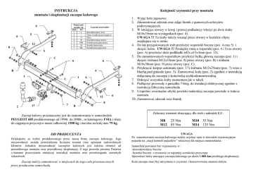 INSTRUKCJA montaŜu i eksploatacji zaczepu kulowego Oznaczenie zacisku wg ISO PN 1 L 2 + 3 31 4 R 5 58R 6 54 7 58L 6 5 6 12 8 Kolejność czynności przy montaŜu Łączenie przewodów Kierunkowskazy lewe Tylne światła przeciwmgłowe Masa Kierunkowskazy prawe Światła pozycyjne prawe Światła hamowania Światła pozycyjne lewe A C 6 9 4 B 3 1 C A 6 12 2 17 7 1. Wyjąć koło zapasowe. 2. Zdemontować zderzak oraz zdjąć tłumik z gumowych uchwytów podtrzymujących. 3. W istniejące otwory w lewej i prawej podłuŜnicy włoŜyć po dwie śruby M10x35mm na wysięgnikach (poz. 4). UWAGA !!! Te śruby naleŜy wsunąć przez otwory w kształcie elipsy znajdujące się w ramie. 4. Do tak przygotowanych śrub przyłoŜyć wsporniki boczne (poz. 4 oraz 5) i skręcić luźno. UWAGA !!! Pomiędzy ramę a wsporniki (poz. 4 i 5) na otwory (poz. A) przyłoŜyć duŜe podkładki ø42x ø13x3mm (poz. 12). 5. Do zamontowanych wsporników przyłoŜyć belkę główną zaczepu (poz. 1) i skręcić śrubami M12x35mm (poz. 8) przez otwory (poz. B) i śrubami M10x30mm (poz. 9) przez otwory (poz. C). 6. Przykręcić korpus automatu (poz. 17) śrubami M12x25mm (poz. 7) wraz z blachą pod gniazdo (poz. 3). Zamocować kulę (poz. 2) zgodnie z instrukcją dołączaną do zaczepu z końcówką szybkodemontowalną. 7. Dokręcić wszystkie śruby momentem jak w tabeli. 8. Podłączyć przewody z gniazdka 7-bieg. do instalacji elektrycznej zgodnie z instrukcją fabryczną samochodu . 9. Uzupełnić ewentualne ubytki powłoki malarskiej zaczepu powstałe w trakcie montaŜu. 10. Zamontować zderzak oraz tłumik. 8 B Zaczep kulowy przeznaczony jest do zamontowania w samochodzie PEUGEOT 605 produkowanego od 1990r. do 2000r., nr katalogowy F10A i słuŜy do ciągnięcia przyczep o masie całkowitej 1500 kg i nacisku na kulę max 75 kg. OD PRODUCENTA Dziękujemy za wybór produkowanego przez naszą firmę zaczepu kulowego. Jego niezawodność została potwierdzona licznymi testami oraz opiniami zadowolonych klientów. JednakŜe niezawodność zaczepów kulowych jest zaleŜna równieŜ od prawidłowego montaŜu oraz prawidłowej eksploatacji. Z tego powodu prosimy Państwa o staranne przeczytanie niniejszej instrukcji montaŜu oraz przestrzeganie zawartych wskazówek. Zaczep naleŜy zamontować w miejscach do tego celu przeznaczonych przez producenta samochodu. Zalecany moment skręcający dla śrub i nakrętek 8,8 : M8 M12 25 Nm 85 Nm M10 M14 55 Nm 135 Nm UWAGA Po zamontowaniu zaczepu kulowego naleŜy uzyskać wpis w dowodzie rejestracyjnym pojazdu na „stacji kontroli pojazdów” właściwej dla miejsca zamieszkania. Samochód powinien być wyposaŜony w : -kierunkowskazy boczne -lusterka boczne o rozstawie co najmniej szerokości przyczepy Sprawdzać śruby mocujące zaczepu kulowego po około 1 000 km przebiegu eksploatacji. Kula zaczepu musi być utrzymana w czystości i konserwowana smarem stałym. PPUH AUTO-HAK S.J. WyposaŜenie zaczepu: Produkcja Zaczepów kulowych Henryk & Zbigniew Nejman 76-200 SŁUPSK ul. Słoneczna 16K tel/fax (059) 8-414-414; 8-414-413 e-mail: [email protected] www. autohak.com.pl Zaczep kulowy bez wyposaŜenia elektrycznego F10A Klasa: A50-X Nr kat. Przeznaczony do zamontowania w samochodzie: Producent: PEUGEOT Model: 605 Dane techniczne: Wartość siły D : 8,41 kN maksymalna masa przyczepy: 1500 kg maksymalny nacisk na kulę: 75 kg produkowanego od 1990 r. 2000 r. Numer homologacji zgodnie z Dyrektywą 94/20/WE: e20*94/20*0643*00 KARTA GWARANCYJNA Producent udziela gwarancji niniejszą kartą gwarancyjną na okres 24 miesięcy licząc od dnia zakupu zaczepu kulowego do samochodu: PEUGEOT 605 produkowanego od 1990 r. do 2000 r. Data produkcji .............................. Data zakupu....................................... Zakres gwarancji obejmuje wyłącznie wady jakościowe wynikające z winy producenta. Gwarancja nie obejmuje natomiast uszkodzeń zawinionych przez nabywcę, wynikających z niewłaściwego montaŜu, uŜytkowania lub konserwacji, uszkodzeń mechanicznych, normalnego zuŜycia podczas eksploatacji itp. Gwarancja udzielona na zakupiony towar nie wyłącza, nie ogranicza ani nie zawiesza uprawnień kupującego wynikających z niezgodności towaru z umową. Reklamacje naleŜy zgłaszać w punkcie sprzedaŜy, składając jednocześnie kartę gwarancyjną. Usunięcie "wady" następuje po stwierdzeniu przez punkt sprzedaŜy wspólnie z producentem słuszności złoŜonej reklamacji. Reklamacja powinna być załatwiona w ciągu 14 dni od dnia uznania reklamacji. Karta gwarancyjna jest niewaŜna jeŜeli nie jest wypełniona i podpisana. Data zgłoszenia reklamacji: ................................................................... INFORMACJA WSTĘPNA Zaczep kulowy jest skonstruowany zgodnie z zasadami bezpieczeństwa ruchu drogowego. Zaczep kulowy jest elementem wpływającym na bezpieczeństwo jazdy i moŜe zostać zainstalowany wyłącznie przez personel wyspecjalizowany. Niedopuszczalne jest dokonywanie jakichkolwiek zmian w konstrukcji zaczepu. Powoduje to wygaśniecie dopuszczenia do stosowania. W przypadku obecności masy izolacyjnej lub osłony podwozia w miejscu przylegania zaczepu, naleŜy ją usunąć. Nieosłonięte miejsca karoserii oraz wywiercone otwory naleŜy pomalować farbą antykorozyjną. Informacjami wiąŜącymi odnośnie wartości obciąŜeń są dane podawane przez producenta samochodu, względnie wartości maksymalnej masy przyczepy oraz maksymalnego nacisku na kulę, przy czym wartości parametrów zaczepu kulowego nie mogą być przekroczone. Wzór do obliczania wartości siły D: Maks. masa przyczepy [kg] x Maks. masa samochodu [kg] Maks. masa przyczepy [kg] + Maks. masa samochodu [kg] X 9,81 = 1000 D [kN]