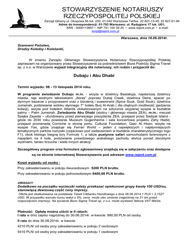 STOWARZYSZENIE NOTARIUSZY RZECZYPOSPOLITEJ POLSKIEJ Zarząd Główny ul. Okopowa 56 lok. 230; 01-042 Warszawa Tel/fax. 22 827-13-45; 22 827-01-94 Adres do korespondencji: 01-793 Warszawa; ul. Rydygiera 17 lok. U01; KRS - 0000113857 • NIP 751 100 39 25 • www.rejent.com.pl • e-mail: [email protected] _______________________________________________________________________________________________ Warszawa, dnia 18.06.2014r. Szanowni Państwo, Drodzy Koledzy i Koleżanki, W imieniu Zarządu Głównego Stowarzyszenia Notariuszy Rzeczypospolitej Polskiej zapraszam na organizowany przez Stowarzyszenie za pośrednictwem Biura Podróży Sigma Travel sp. z o.o. w Warszawie wyjazd integracyjny dla notariuszy, ich rodzin i przyjaciół do: Dubaju i Abu Dhabi Termin wyjazdu: 08 - 13 listopada 2014 roku. W programie zwiedzanie Dubaju m.in. - wizyta w dzielnicy Bastakyja, najstarszej dzielnicy miasta, rejs wodnymi taksówkami „Abras” poprzez Dubaj Creek, dzielnica Deira, spacer po słynnym bazarze z przyprawami oraz z biżuterią i suwenirami (Spice Souk, Gold Souk), dzielnica Jumeirah, podziwianie widoku słynnego 7* hotelu Burj Al-Arab ( dla chętnych możliwość zjedzenia kolacji), wizyta pod hotelem Atlantis zlokalizowanym na sztucznie usypanej wyspie w kształcie palmy – Palm Jumeirah. Zwiedzanie Abu Dhabi (stolicy i głównego miasta ZEA), m.in.: meczet Szejka Zayeda – ufundowany przez pierwszego prezydenta ZEA, przejazd przez Sadiyat Island gdzie do 2030 roku powstanie Muzeum Gugenheima i sala koncertowa projektu Zahy Hadid, przejazd promenadą Corniche w stronę portu. Cultural Foundation, Qasr Al.-Hosn, wizyta na wyspie Yas, gdzie znajduje się Ferrari World – jeden z największych i najsłynniejszych tematycznych parków rozrywki (częściowo pod zadaszeniem w kształcie charakterystycznego logo F1), obok którego biegną tory Formuły 1, a także pustynne safari samochodami terenowymi z napędem na 4 koła, podziwianie prawdziwego arabskiego zachodu słońca ponad złocistymi wydmami, taniec brzucha i wiele innych atrakcji. Szczegółowy program oraz formularz zgłoszeniowy znajdują się w załączeniu oraz dostępne są na stronie internetowej Stowarzyszenia pod adresem www.rejent.com.pl Koszt wyjazdu od osoby : Przy zakwaterowaniu w pokoju dwuosobowym 5200 PLN brutto. Przy zakwaterowaniu w pokoju jednoosobowym 6400,00 PLN brutto. UWAGA!!! Dodatkowo na początku wycieczki należy przekazać opiekunowi grupy kwotę 100 USD/os, stanowiącą dewizową część ceny imprezy. Oferta jest skalkulowana na podstawie Tabeli Citibanku Handlowego z dnia 06.06.2014 1 PLN = 3,1527 USD. W przypadku wzrostu kursu walut o 5%, cena może ulec zmianie (najpóźniej na 21 dni przed rozpoczęciem imprezy). Na życzenie Biuro Sigma Travel sp. z o.o. może wystawić fakturę VAT Marża. Płatność: Opłatę można uiścić w II ratach: I rata w dniu zapisu najpóźniej do 30.06.2014r. w kwocie: 990,00 PLN od osoby. II rata do dnia 30.09.2014r. w kwocie: 4210 PLN/ od osoby przy zakwaterowaniu w pokoju 2 osobowym 5410 PLN/ od osoby przy zakwaterowaniu w pokoju 1 osobowym Opłatę za wyjazd należy wnieść przelewem na nr rachunku: Stowarzyszenie Notariuszy Rzeczypospolitej Polskiej Ul. Okopowa 56 lok 230; 01-042 Warszawa Bank BPH S.A. nr rachunku : 76 1060 0076 0000 3200 0131 9119 CENA ZAWIERA: - przelot na trasie WAW-DXB-WAW, - transport klimatyzowanym autokarem na miejscu, - zakwaterowanie w hotelu wg programu, - wyżywienie wg programu, - opiekę polskiego pilota na całej trasie, - asystę przewodnika lokalnego w trakcie wycieczek, - bilety wstępów do zwiedzanych obiektów wg programu, - napiwki dla kierowców i przewodników, - ubezpieczenie KL (25 000 EUR), NNW (3000 EUR), bagażu (200 EUR), kosztów rezygnacji z przyczyn losowych, - podatek VAT (VAT-marża). CENA NIE ZAWIERA: - kosztu wycieczek fakultatywnych organizowanych na miejscu (podanych w treści programu), - podatku turystycznego (podany w treści programu), - kwoty dewizowej (podana w uwagach, płatna gotówką na miejscu, na początku imprezy), - wydatków natury osobistej, - innych wydatków nie wymienionych w części cena zawiera. TERMIN ZGŁOSZEŃ UPŁYWA 30 CZERWCA 2014 ROKU. (LICZBA MIEJSC OGRANICZONA, DECYDUJE KOLEJNOŚĆ ZGŁOSZEŃ.) Koszty rezygnacji: Uczestnicy ma prawo do rezygnacji wyjazdu ponosząc koszty rezygnacji w wysokości: a) 990 PLN do 31 dni przed terminem wylotu. b) 50% potrącenia na 30 - 15 dni przed datą wylotu potrącenie c) 80% potrącenia na 14 - 7 dni przed datą wylotu d) 95% potrącenie na 6 dni lub mniej przed datą wylotu Do powyższych terminów nie wlicza się dnia, w którym złożona została rezygnacja oraz dnia, w którym planowane jest rozpoczęcie imprezy. UWAGA: Należy posiadać paszport ważny minimum sześć miesięcy od daty powrotu z wolną stroną na pieczątki. Od marca 2014 obywateli polskich nie obowiązują wizy. Osoby posiadające w paszporcie pieczątki lub jakiekolwiek inne izraelskie wpisy nie zostaną wpuszczone do Zjednoczonych Emiratów Arabskich. Zapisy i szczegółowe informacje programowe dotyczące wyjazdu oraz działalności Stowarzyszenia można uzyskać w Biurze Zarządu Głównego Stowarzyszenia Notariuszy RP ul. Rydygiera 17 lok. U01; 01-793 Warszawa Tel./Fax 22 827 13 45, 827 01 94 pon. - pt. w godz. 09.00-16.00 strona www.rejent.com.pl , adres e-mail: [email protected] z poważaniem Anna Dańko-Roesler Prezes Zarządu Głównego