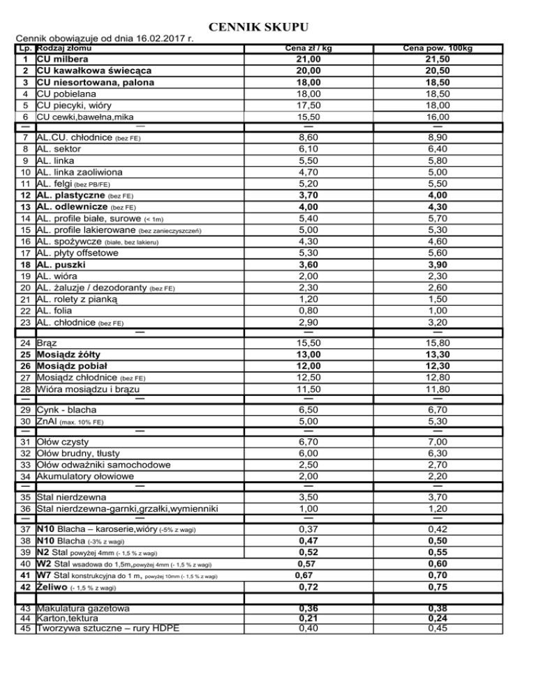 Cennik obowiązuje od dnia 16.02.2017 r. CENNIK SKUPU Lp. Rodzaj złomu 1 2 3 4 5 6 ― 7 8 9 10 11 12 13 14 15 16 17 18 19 20 21 22 23 24 25 26 27 28 ― 29 30 ― 31 32 33 34 ― 35 36 ― 37 38 39 40 41 42 Cena zł / kg Cena pow. 100kg CU milbera CU kawałkowa świecąca CU niesortowana, palona CU pobielana CU piecyki, wióry 21,00 20,00 18,00 18,00 17,50 21,50 20,50 18,50 18,50 18,00 CU cewki,bawełna,mika 15,50 16,00 ― AL.CU. chłodnice (bez FE) AL. sektor AL. linka AL. linka zaoliwiona AL. felgi (bez PB/FE) AL. plastyczne (bez FE) AL. odlewnicze (bez FE) AL. profile białe, surowe (< 1m) AL. profile lakierowane (bez zanieczyszczeń) AL. spożywcze (białe, bez lakieru) AL. płyty offsetowe AL. puszki AL. wióra AL. żaluzje / dezodoranty (bez FE) AL. rolety z pianką AL. folia AL. chłodnice (bez FE) ― Brąz Mosiądz żółty Mosiądz pobiał Mosiądz chłodnice (bez FE) Wióra mosiądzu i brązu ― Cynk - blacha ZnAl (max. 10% FE) ― Ołów czysty Ołów brudny, tłusty Ołów odważniki samochodowe Akumulatory ołowiowe ― Stal nierdzewna Stal nierdzewna-garnki,grzałki,wymienniki ― N10 Blacha – karoserie,wióry (-5% z wagi) N10 Blacha (-3% z wagi) N2 Stal powyżej 4mm (- 1,5 % z wagi) W2 Stal wsadowa do 1,5m,powyżej 4mm (- 1,5 % z wagi) W7 Stal konstrukcyjna do 1 m, powyżej 10mm (- 1,5 % z wagi) Żeliwo (- 1,5 % z wagi) 43 Makulatura gazetowa 44 Karton,tektura 45 Tworzywa sztuczne – rury HDPE ― 8,60 6,10 5,50 4,70 5,20 3,70 4,00 5,40 5,00 4,30 5,30 3,60 2,00 2,30 1,20 0,80 2,90 ― 15,50 13,00 12,00 12,50 11,50 ― 6,50 5,00 ― 6,70 6,00 2,50 2,00 ― 3,50 1,00 ― 0,37 0,47 0,52 0,72 ― 8,90 6,40 5,80 5,00 5,50 4,00 4,30 5,70 5,30 4,60 5,60 3,90 2,30 2,60 1,50 1,00 3,20 ― 15,80 13,30 12,30 12,80 11,80 ― 6,70 5,30 ― 7,00 6,30 2,70 2,20 ― 3,70 1,20 ― 0,42 0,50 0,55 0,60 0,70 0,75 0,36 0,21 0,40 0,38 0,24 0,45 0,57 0,67