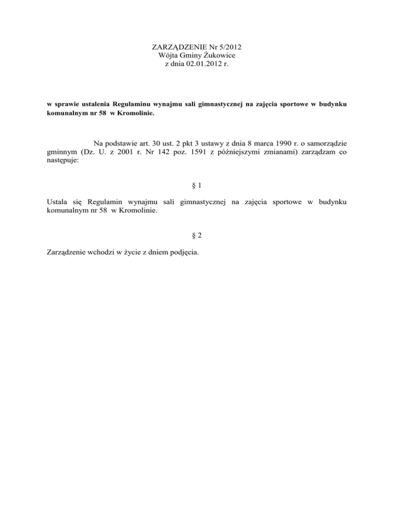 ZARZĄDZENIE Nr 5/2012 Wójta Gminy Żukowice z dnia 02.01.2012