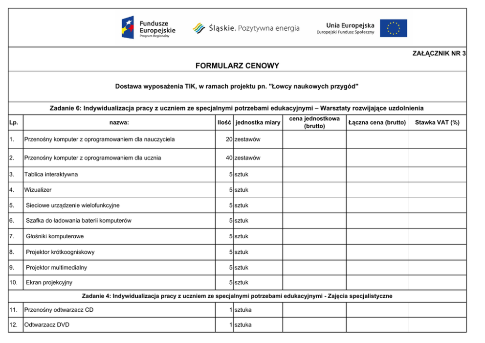 ZAŁĄCZNIK NR 3 FORMULARZ CENOWY Dostawa wyposażenia TIK, w ramach projektu pn. "Łowcy naukowych przygód" Zadanie 6: Indywidualizacja pracy z uczniem ze specjalnymi potrzebami edukacyjnymi – Warsztaty rozwijające uzdolnienia Lp. nazwa: Ilość jednostka miary 1. Przenośny komputer z oprogramowaniem dla nauczyciela 20 zestawów 2. Przenośny komputer z oprogramowaniem dla ucznia 40 zestawów 3. Tablica interaktywna 5 sztuk 4. Wizualizer 5 sztuk 5. Sieciowe urządzenie wielofunkcyjne 5 sztuk 6. Szafka do ładowania baterii komputerów 5 sztuk 7. Głośniki komputerowe 5 sztuk 8. Projektor krótkoogniskowy 5 sztuk 9. Projektor multimedialny 5 sztuk 10. Ekran projekcyjny 5 sztuk cena jednostkowa (brutto) Łączna cena (brutto) Zadanie 4: Indywidualizacja pracy z uczniem ze specjalnymi potrzebami edukacyjnymi - Zajęcia specjalistyczne 11. Przenośny odtwarzacz CD 1 sztuka 12. Odtwarzacz DVD 1 sztuka Stawka VAT (%) RAZEM: