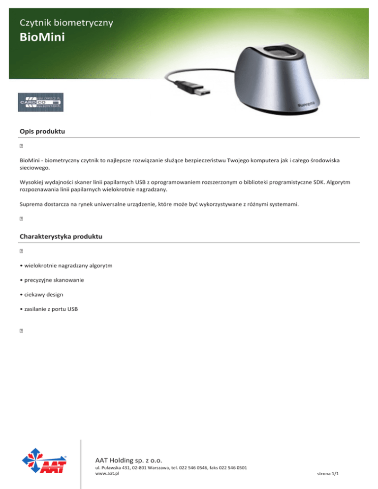 Czytnik Czytnik biometryczny biometryczny BioMini BioMini Opis produktu BioMini - biometryczny czytnik to najlepsze rozwiązanie służące bezpieczeństwu Twojego komputera jak i całego środowiska sieciowego. Wysokiej wydajności skaner linii papilarnych USB z oprogramowaniem rozszerzonym o biblioteki programistyczne SDK. Algorytm rozpoznawania linii papilarnych wielokrotnie nagradzany. Suprema dostarcza na rynek uniwersalne urządzenie, które może być wykorzystywane z różnymi systemami. Charakterystyka produktu • wielokrotnie nagradzany algorytm • precyzyjne skanowanie • ciekawy design • zasilanie z portu USB AAT Holding sp. z o.o. ul. Puławska 431, 02-801 Warszawa, tel. 022 546 0546, faks 022 546 0501 www.aat.pl strona 1/1