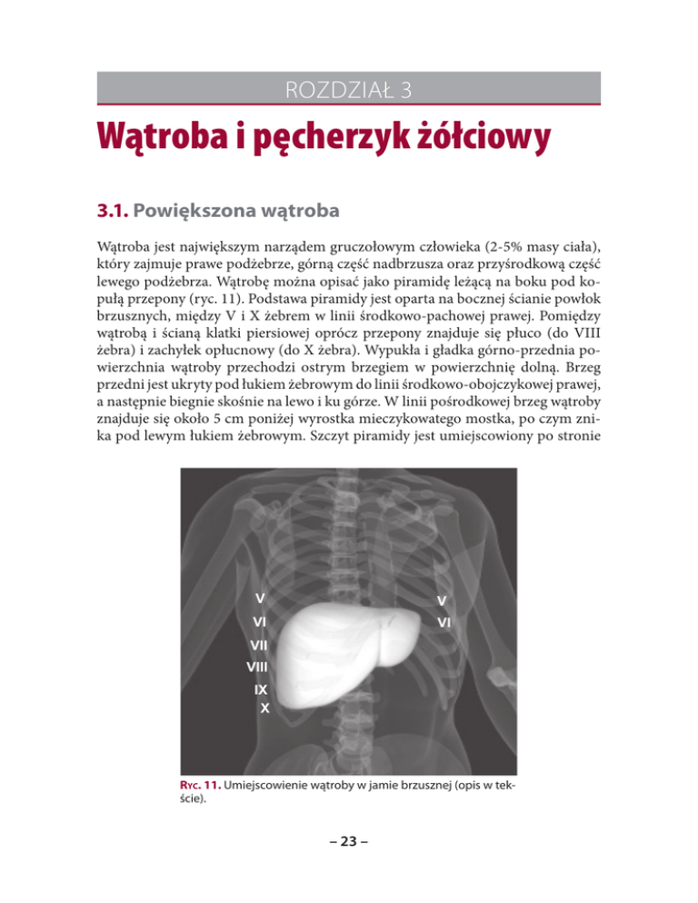 ROZDZIAŁ 3 Wątroba i pęcherzyk żółciowy 3.1. Powiększona wątroba Wątroba jest największym narządem gruczołowym człowieka (2-5% masy ciała), który zajmuje prawe podżebrze, górną część nadbrzusza oraz przyśrodkową część lewego podżebrza. Wątrobę można opisać jako piramidę leżącą na boku pod kopułą przepony (ryc. 11). Podstawa piramidy jest oparta na bocznej ścianie powłok brzusznych, między V i X żebrem w linii środkowo-pachowej prawej. Pomiędzy wątrobą i ścianą klatki piersiowej oprócz przepony znajduje się płuco (do VIII żebra) i zachyłek opłucnowy (do X żebra). Wypukła i gładka górno-przednia powierzchnia wątroby przechodzi ostrym brzegiem w powierzchnię dolną. Brzeg przedni jest ukryty pod łukiem żebrowym do linii środkowo-obojczykowej prawej, a następnie biegnie skośnie na lewo i ku górze. W linii pośrodkowej brzeg wątroby znajduje się około 5 cm poniżej wyrostka mieczykowatego mostka, po czym znika pod lewym łukiem żebrowym. Szczyt piramidy jest umiejscowiony po stronie V V VI VI VII VIII IX X RYC. 11. Umiejscowienie wątroby w jamie brzusznej (opis w tekście). – 23 – ROZDZIAŁ 3: Wątroba i pęcherzyk żółciowy lewej na wysokości żeber V i VI w linii środkowo-obojczykowej. Anatomicznie więzadło sierpowate dzieli wątrobę na płat prawy i znacznie mniejszy płat lewy. Decydujące znaczenie w ocenie wielkości wątroby ma obecnie badanie ultrasonograficzne, jednak nie zwalnia to z obowiązku badania fizykalnego, które dostarcza wielu dodatkowych informacji. Podczas głębokiego wdechu brzeg wątroby przemieszcza się ku dołowi o 1-3 cm i może być dostępny badaniu fizykalnemu. Istnieją jednak okoliczności, w których brzeg niepowiększonej wątroby wystaje z pod łuku żebrowego. Dzieje się tak w przypadku rozedmy płuc, astenicznej budowy ciała lub obecności płata Riedela, który jest wąskim segmentem miąższu wątrobowego, sięgającym bocznie do prawego dolnego kwadrantu brzucha. Brzeg lewego płata zdrowej wątroby nie jest wyczuwalny przy palpacji, mimo że nie jest osłonięty żebrami. Zwyczajowo powiększenie wątroby wyraża się liczbą palców, którą zajmuje wątroba poniżej prawego łuku żebrowego. Jest to jednak metoda zawodna, bowiem szerokość palca u różnych badaczy wynosi od 1,3 do 2,4 cm. Poza rozmiarem wątroby ocenia się jej konsystencję, ostrość brzegu oraz tkliwość. Zdrowa wątroba jest miękka, posiada gładką powierzchnię, ostry brzeg oraz jest niebolesna. W każdym przypadku powiększenia wątroby i/lub zwiększonej jej spoistości należy uzupełnić diagnostykę hepatologiczną o testy laboratoryjne i badania obrazowe. Hepatomegalia, czyli bardzo duża wątroba sięgająca przednim brzegiem 10 i więcej centymetrów poniżej łuku żebrowego, jest najczęściej oznaką masywnego stłuszczenia wątroby (np. pochodzenia alkoholowego), rzadziej chorób spichrzeniowych (np. glikogenozy, amyloidozy), procesów naciekowych (np. przewlekłej białaczki szpikowej, mielofibrozy) lub niewydolności prawej komory serca. Duża i pulsująca wątroba jest konsekwencją niedomykalności zastawki trójdzielnej, co pozwala na przenoszenie zmiennych ciśnień krwi w prawej komorze serca na wątrobę. Do niedomykalności zastawki trójdzielnej dochodzi w wyniku zaawansowanej stenozy aortalnej, zapalenia wsierdzia zastawki trójdzielnej lub wysokiego nadciśnienia płucnego. Podłożem umiarkowanego powiększenia wątroby jest wiele procesów chorobowych, np. stłuszczenie w przebiegu zespołu metabolicznego, obrzęk hepatocytów spowodowany ostrym lub przewlekłym zapaleniem o różnej etiologii oraz chorób dróg żółciowych związanych ze śródwątrobowym zastojem żółci. Brzeg marskiej wątroby jest ostry i twardy, a spoistość narządu wyraźnie wzmożona. Zwiększona spoistość jest oznaką włóknienia, lecz przyczyną twardej wątroby mogą być także przerzuty nowotworowe do tego narządu. Powierzchnia marskiej wątroby bywa nierówna z powodu obecności guzków regeneracyjnych, jednak w przypadku marskości drobnoguzkowej są one zbyt małe, aby mogły zostać zbadane przez powłoki brzuszne. Wyboista powierzchnia wątroby jest efektem rozległej martwicy i włóknienia z tworzeniem dużych blizn. Guzowatość brzegu wątroby powstaje jako wynik przerzutów raka do wątroby lub marskości pomartwiczej. Obły brzeg jest najczęściej objawem stłuszczenia wątroby. – 24 – ROZDZIAŁ 3: Wątroba i pęcherzyk żółciowy Tkliwość wątroby jest oznaką zajęcia procesem chorobowym torebki wątroby, która posiada unerwienie czuciowe. Generalnie uważa się, że choroby miąższu wątrobowego nie powodują dolegliwości bólowych. Niemniej badania anatomiczne wskazują na obecność nerwowych włókien czuciowych nie tylko w torebce wątrobowej, ale także wokół struktur naczyniowych oraz w podścielisku łącznotkankowym przestrzeni wrotnych. Tkliwość wątroby jest zwykle objawem jej ostrego zapalenia, powierzchownie leżących przerzutów nowotworowych oraz zastoinowej niewydolności serca. Powiększenie wątroby pociąga za sobą wzrost napięcia torebki wątrobowej, stąd chorzy ze stłuszczeniem wątroby często skarżą się na dyskomfort w prawym podżebrzu. Przyczyną ostrego bólu w prawym nadbrzuszu może być szybko powiększająca się wątroba, np. w przebiegu ostrej niewydolności prawokomorowej serca (tamponada, masywna zatorowość płucna) lub zakrzepicy żył wątrobowych (zespół Budda-Chiariego). Marska wątroba jest najczęściej powiększona, jednak może być także prawidłowych rozmiarów lub zanikowa (marskość alkoholowa Laenneca), całkowicie ukryta pod łukiem żebrowym. Zanikowa wątroba jest niekorzystnym czynnikiem prognostycznym u chorych z marskością lub ostrą niewydolnością wątroby. Wątroba powiększa się w sposób asymetryczny, ku dołowi trafia bowiem na mniejsze opory niż od strony przepony. Istni