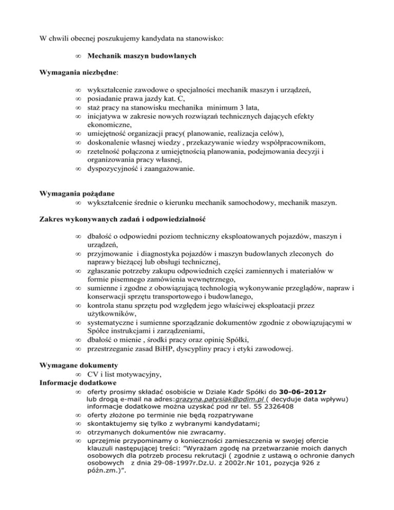 W chwili obecnej poszukujemy kandydata na stanowisko: • Mechanik maszyn budowlanych Wymagania niezbędne: • • • • • • • • wykształcenie zawodowe o specjalności mechanik maszyn i urządzeń, posiadanie prawa jazdy kat. C, staż pracy na stanowisku mechanika minimum 3 lata, inicjatywa w zakresie nowych rozwiązań technicznych dających efekty ekonomiczne, umiejętność organizacji pracy( planowanie, realizacja celów), doskonalenie własnej wiedzy , przekazywanie wiedzy współpracownikom, rzetelność połączona z umiejętnością planowania, podejmowania decyzji i organizowania pracy własnej, dyspozycyjność i zaangażowanie. Wymagania pożądane • wykształcenie średnie o kierunku mechanik samochodowy, mechanik maszyn. Zakres wykonywanych zadań i odpowiedzialność • • • • • • • • dbałość o odpowiedni poziom techniczny eksploatowanych pojazdów, maszyn i urządzeń, przyjmowanie i diagnostyka pojazdów i maszyn budowlanych zleconych do naprawy bieżącej lub obsługi technicznej, zgłaszanie potrzeby zakupu odpowiednich części zamiennych i materiałów w formie pisemnego zamówienia wewnętrznego, sumienne i zgodne z obowiązującą technologią wykonywanie przeglądów, napraw i konserwacji sprzętu transportowego i budowlanego, kontrola stanu sprzętu pod względem jego właściwej eksploatacji przez użytkowników, systematyczne i sumienne sporządzanie dokumentów zgodnie z obowiązującymi w Spółce instrukcjami i zarządzeniami, dbałość o mienie , środki pracy oraz opinię Spółki, przestrzeganie zasad BiHP, dyscypliny pracy i etyki zawodowej. Wymagane dokumenty • CV i list motywacyjny, Informacje dodatkowe • oferty prosimy składać osobiście w Dziale Kadr Spółki do 30-06-2012r • • • • lub drogą e-mail na adres:[email protected] ( decyduje data wpływu) informacje dodatkowe można uzyskać pod nr tel. 55 2326408 oferty złożone po terminie nie będą rozpatrywane skontaktujemy się tylko z wybranymi kandydatami; otrzymanych dokumentów nie zwracamy. uprzejmie przypominamy o konieczności zamieszczenia w swojej ofercie klauzuli następującej treści: ”Wyrażam zgodę na przetwarzanie moich danych osobowych dla potrzeb procesu rekrutacji ( zgodnie z ustawą o ochronie danych osobowych z dnia 29-08-1997r.Dz.U. z 2002r.Nr 101, pozycja 926 z późn.zm.)”.