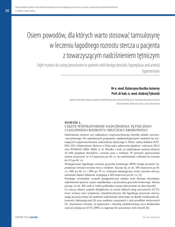 26 Osiem powodów, dla których warto stosować tamsulosynę w leczeniu łagodnego rozrostu stercza u pacjenta z towarzyszącym nadciśnieniem tętniczym A. Tykarski, K. Kostka-Jeziorny Osiem powodów, dla których warto stosować tamsulosynę w leczeniu łagodnego rozrostu stercza u pacjenta z towarzyszącym nadciśnieniem tętniczym Eight reasons for using tamsulosine in patients with benign prostatic hyperplasia and arterial hypertension Dr n. med. Katarzyna Kostka-Jeziorny Prof. dr hab. n. med. Andrzej Tykarski Katedra i Klinika Hipertensjologii, Angiologii i Chorób Wewnętrznych, Uniwersytet Medyczny im. Karola Marcinkowskiego w Poznaniu Kierownik Katedry i Kliniki: prof. dr hab. n. med. Andrzej Tykarski POWÓD 1. CZĘSTE WSPÓŁISTNIENIE NADCIŚNIENIA TĘTNICZEGO I ŁAGODNEGO ROZROSTU GRUCZOŁU KROKOWEGO Nadciśnienie tętnicze jest najbardziej rozpowszechnioną chorobą układu sercowo-naczyniowego. Do największych programów epidemiologicznych ostatnich lat oceniających rozpowszechnienie nadciśnienia tętniczego w Polsce należą badania NATPOL 2011 (Nadciśnienie Tętnicze w Polsce plus zaburzenia lipidowe i cukrzyca; 2011) oraz WOBASZ (2002–2005) [1, 2]. Wynika z nich, że nadciśnienie tętnicze dotyczy 32–36% populacji dorosłych i wzrasta wraz z wiekiem. W pewnym uproszczeniu można oszacować, że 1/2 mężczyzn po 50. r.ż. ma nadciśnienie i odsetek ten wzrasta do 2/3 po 65. r.ż. Występowanie łagodnego rozrostu gruczołu krokowego (BPH, benign prostatic hyperplasia) również wzrasta wraz z wiekiem. Szacuje się, że ok. 50% mężczyzn po 50. r.ż., 60% po 60. r.ż. i 80% po 70 r.ż. wykazuje histologiczne cechy rozrostu stercza, natomiast objawy kliniczne występują u 30% mężczyzn po 65. r.ż. [3]. Pomijając ewentualny związek patogenetyczny między tymi dwiema chorobami, nadciśnienie tętnicze często współistnieje z przerostem gruczołu krokowego. Można przyjąć, że ok. 30% osób w wieku podeszłym cierpi jednocześnie na obie choroby. Co więcej, objawy zespołu dolegliwości ze strony dolnych dróg moczowych (LUTS, lower urinary tract symptoms), charakterystyczne dla łagodnego przerostu stercza, mogą się przyczyniać do nasilenia nadciśnienia tętniczego na skutek zwiększenia aktywności adrenergicznej [4] oraz nasilenia związanych z nim powikłań wieńcowych [5]. Zauważono również, że mężczyźni z chorobą niedokrwienną serca dwukrotnie częściej cierpią na LUTS i BPH, co sugeruje tło naczyniowe tych chorób [6]. Vol. 7/Nr 4(25)/2014 Osiem powodów, dla których warto stosować tamsulosynę w leczeniu łagodnego rozrostu stercza u pacjenta z towarzyszącym nadciśnieniem tętniczym A. Tykarski, K. Kostka-Jeziorny POWÓD 2. ZMIENIAJĄCE SIĘ ZASADY LECZENIA NADCIŚNIENIA TĘTNICZEGO OSŁABIŁY POZYCJĘ Α1-ADRENOLITYKÓW NIEUROSELEKTYWNYCH Według wytycznych ESH 2007 i PTNT 2008 r. celem leczenia pacjentów z nadciśnieniem tętniczym jest zmniejszenie śmiertelności i ryzyka powikłań sercowo-naczyniowych poprzez obniżenie ciśnienia tętniczego do wartości uznanych za prawidłowe oraz poprzez tzw. leczenie pozahipotensyjne [7, 8]. Zgodnie z zasadami evidence based medicine, do leków hipotensyjnych I rzutu zalicza się leki z pięciu grup, które w dużych badaniach klinicznych wykazały nie tylko skuteczność w obniżaniu ciśnienia tętniczego, lecz także korzystny wpływ na ryzyko zgonu i incydentów sercowo-naczyniowych. Są to: 1. diuretyki tiazydowe 2. β-adrenolityki 3. antagoniści wapnia 4. inhibitory konwertazy angiotensyny 5. antagoniści receptora AT1 angiotensyny II. Warto zauważyć, że od ukazania się wytycznych ESH w 2003 r. nie ma wśród nich szóstej grupy leków hipotensyjnych, α-adrenolityków, które stosuje się również w celu złagodzenia objawów LUTS i poprawy przepływu moczu [9]. Natomiast od czasu publikacji wytycznych ESH 2007 spośród sytuacji klinicznych, w których wykorzystuje się zasadę indywidualizacji terapii hipotensyjnej, nie wymienia się towarzyszącego łagodnego rozrostu gruczołu krokowego jako wskazania do zastosowania w I rzucie działających hipotensyjnie nieuroselektywnych α-adrenolityków, takich jak doksazosyna. Eksperci uznali zapewne, że warunkiem podstawowym zastosowania leku hipotensyjnego w I rzucie są dowody na korzyści w zakresie redukcji ryzyka zgonu i incydentów sercowo-naczyniowych, a takich nie ma w przypadku α-adrenolityków. POWÓD 3. UNIKANIE Α1-ADRENOLITYKÓW NIEUROSELEKTYWNYCH W TERAPII HIPOTENSYJNEJ UŁATWIA DZIAŁANIE UROLOGOWI Farmakoterapia łagodnego rozrostu stercza jest zróżnicowana w zależności od nasilenia objawów, stopnia powiększenia gruczołu krokowego i ewentualnej obecności dodatkowych dolegliwości związanych z nadreaktywnością pęcherza lub współistniejących zaburzeń erekcji. Schemat takiego postępowania farmakologicznego zaproponowany przez Roehrborna przedstawiono na rycinie 1 [9]. Chociaż leki α1-adrenolityczne są podstawą takiej farmakoterapii, nie jest to jedyna możliwość, często zaś urolog decyduje się na leczenie skojarzone. Również ocena efektów leczenia jest z oczywistych względów utrudniona w przypadku kontynuowania terapii przez lekarza pierwszego kontaktu czy hipertensjologa za pomocą α1-adrenolityku nieuroselektywnego. Dawniejsza koncepcja jednoczesnego leczenia nadciśnienia tętniczego i łagodnego rozrostu stercza za pomocą α-adrenolityków mających wskazania do leczenia obu tych chorób nie jest już zalecana w nowych wytycznych ESH z 2013 r. ze względu na wątpliwe korzyści z ich stosowania w zakresie redukcji ryzyka incydentów sercowo-naczyniowych. A zatem leki z grupy α-adrenolityków nie powinny być stosowane Vol. 7/Nr 4(25)/2014 27 28 Osiem powodów, dla których warto stosować tamsulosynę w leczeniu łagodnego rozrostu stercza u pacjenta z towarzyszącym nadciśnieniem tętniczym A. Tykarski, K. Kostka-Jeziorny RYCINA 1 Schemat farmakoterapii przerostu prostaty