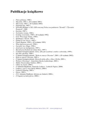 Publikacje ksiąŜkowe • • • • • • • • • • • • • • • • • • • • • • • • • • • • • • Pióro plebana, 1980 r. Mój dom, 1981 r., (II wydanie 2001) Mój świat, 1983 r., (II wydanie 2003) Dopokąd idę, 1983 r. Sylwetka Biskupa w XII i XIII-wiecznej Polsce na podstawie "Kronik" i "śywotów Świętych", 1984 Kasztan, 1987 r. Na krańce świata, 1988 r. Grabiąc ściernisko, 1989 r. (II wydanie 1992) Gość Wiecznego Domu, 1990 r. Spotkania z Ojcem, 1991 r. Dokąd Ty nie chcesz, 1992 r. Pijani Bogiem, 1994 r., (II wydanie 1995) Wino dojrzewa powoli, 1996 r. Narodzić się z Boga, 1996 r. JeŜeli jest się inteligentem, 1997 r. Był jak przechodzień do domu Ojca, 1997 r. Z Janem Grzegorczykiem: Góra, albo jak wyŜebrać z niebo i człowieka, 1999 r. Idź albo zdechnij, 1999 r. Z Janem Grzegorczykiem: "Ryba to znaczy Chrystus", 2001 r. (II wydanie 2002). Ryba to znaczy Chrystus, 2001 r. Z Janem Grzegorczykiem: Skrawek nieba albo o Ojcu i Królu, 2001 r. Wybierz Chrystusa! - Katechizm Ruchu Lednickiego, 2003 r. Matka Niezawodnej Nadziei, 2003 r. Ukłon się Jasiu!, 2004 r. Z Adamem Bujakiem: Papieska Lednica - Lednicki PapieŜ, 2004r. Lednica, czyli w sieci BoŜej Miłości, 2004 r. Lednicki Dekalog, 2005 r. Ojciec, 2005 r. Z O. Antonim Dudkiem: Idziemy po śladach, 2006 r. Z Nogami na kaloryferze, 2006 r. Oficjalna strona Jana Góry OP - www.jangora.pl