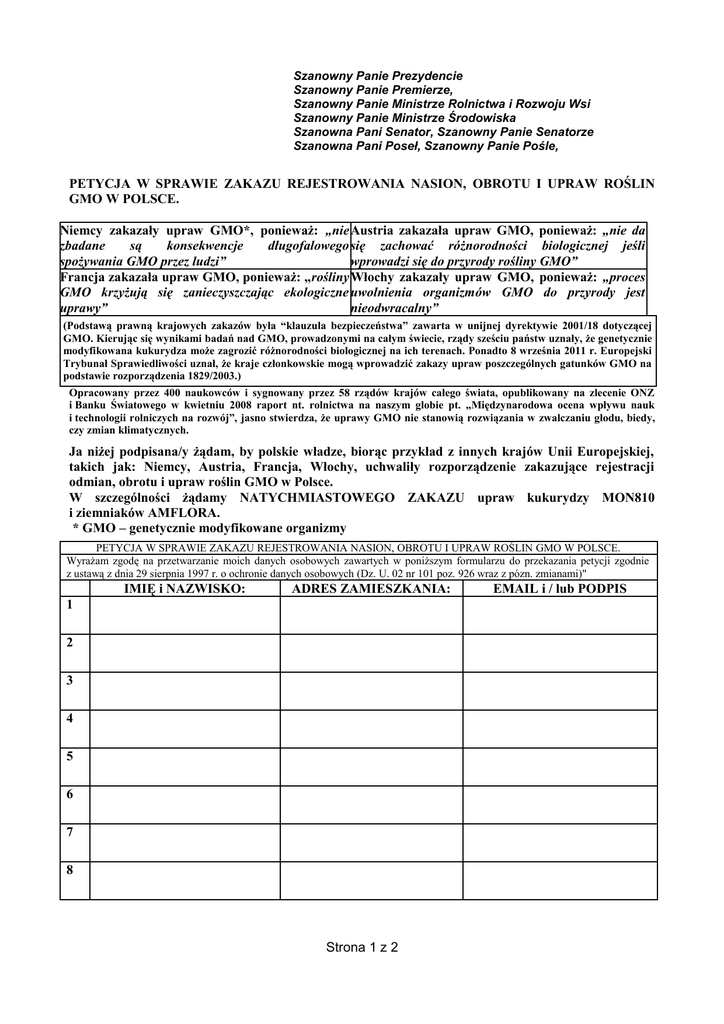 Szanowny Panie Prezydencie Szanowny Panie Premierze, Szanowny Panie Ministrze Rolnictwa i Rozwoju Wsi Szanowny Panie Ministrze Środowiska Szanowna Pani Senator, Szanowny Panie Senatorze Szanowna Pani Poseł, Szanowny Panie Pośle, PETYCJA W SPRAWIE ZAKAZU REJESTROWANIA NASION, OBROTU I UPRAW ROŚLIN GMO W POLSCE. Niemcy zakazały upraw GMO*, ponieważ: „nie Austria zakazała upraw GMO, ponieważ: „nie da zbadane są konsekwencje długofalowego się zachować różnorodności biologicznej jeśli spożywania GMO przez ludzi” wprowadzi się do przyrody rośliny GMO” Francja zakazała upraw GMO, ponieważ: „rośliny Włochy zakazały upraw GMO, ponieważ: „proces GMO krzyżują się zanieczyszczając ekologiczne uwolnienia organizmów GMO do przyrody jest uprawy” nieodwracalny” (Podstawą prawną krajowych zakazów była “klauzula bezpieczeństwa” zawarta w unijnej dyrektywie 2001/18 dotyczącej GMO. Kierując się wynikami badań nad GMO, prowadzonymi na całym świecie, rządy sześciu państw uznały, że genetycznie modyfikowana kukurydza może zagrozić różnorodności biologicznej na ich terenach. Ponadto 8 września 2011 r. Europejski Trybunał Sprawiedliwości uznał, że kraje członkowskie mogą wprowadzić zakazy upraw poszczególnych gatunków GMO na podstawie rozporządzenia 1829/2003.) Opracowany przez 400 naukowców i sygnowany przez 58 rządów krajów całego świata, opublikowany na zlecenie ONZ i Banku Światowego w kwietniu 2008 raport nt. rolnictwa na naszym globie pt. „Międzynarodowa ocena wpływu nauk i technologii rolniczych na rozwój”, jasno stwierdza, że uprawy GMO nie stanowią rozwiązania w zwalczaniu głodu, biedy, czy zmian klimatycznych. Ja niżej podpisana/y żądam, by polskie władze, biorąc przykład z innych krajów Unii Europejskiej, takich jak: Niemcy, Austria, Francja, Włochy, uchwaliły rozporządzenie zakazujące rejestracji odmian, obrotu i upraw roślin GMO w Polsce. W szczególności żądamy NATYCHMIASTOWEGO ZAKAZU upraw kukurydzy MON810 i ziemniaków AMFLORA. * GMO – genetycznie modyfikowane organizmy PETYCJA W SPRAWIE ZAKAZU REJESTROWANIA NASION, OBROTU I UPRAW ROŚLIN GMO W POLSCE. Wyrażam zgodę na przetwarzanie moich danych osobowych zawartych w poniższym formularzu do przekazania petycji zgodnie z ustawą z dnia 29 sierpnia 1997 r. o ochronie danych osobowych (Dz. U. 02 nr 101 poz. 926 wraz z pózn. zmianami)" IMIĘ i NAZWISKO: ADRES ZAMIESZKANIA: 1 2 3 4 5 6 7 8 Strona 1 z 2 EMAIL i / lub PODPIS PETYCJA W SPRAWIE ZAKAZU REJESTROWANIA NASION, OBROTU I UPRAW ROŚLIN GMO W POLSCE. Wyrażam zgodę na przetwarzanie moich danych osobowych zawartych w poniższym formularzu do przekazania petycji zgodnie z ustawą z dnia 29 sierpnia 1997 r. o ochronie danych osobowych (Dz. U. 02 nr 101 poz. 926 wraz z pózn. zmianami)" IMIĘ i NAZWISKO: ADRES ZAMIESZKANIA: 9 10 11 12 13 14 15 16 17 18 19 20 21 22 23 24 25 26 27 28 Strona 2 z 2 EMAIL i / lub PODPIS